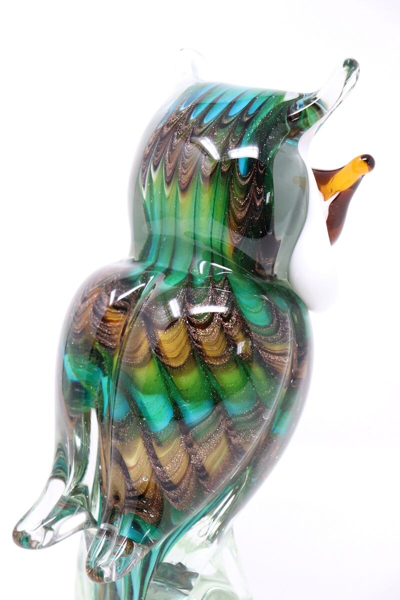 The owl features a vibrant multi-color palette that seamlessly blends hues, creating a spectacular visual symphony. The inclusion of gold dust within the glass adds a sublime, shimmering effect, reminiscent of sunlight filtering through a forest canopy and dancing on the owl’s feathers. This detail elevates the sculpture, giving it an almost magical quality. The attention to detail is evident in the intricate rendering of the owl’s face, where delicately features imbue the sculpture with a friendly and inviting demeanor. This expression not only adds life to the piece but also evokes an emotional connection, making it a great addition to any space.
