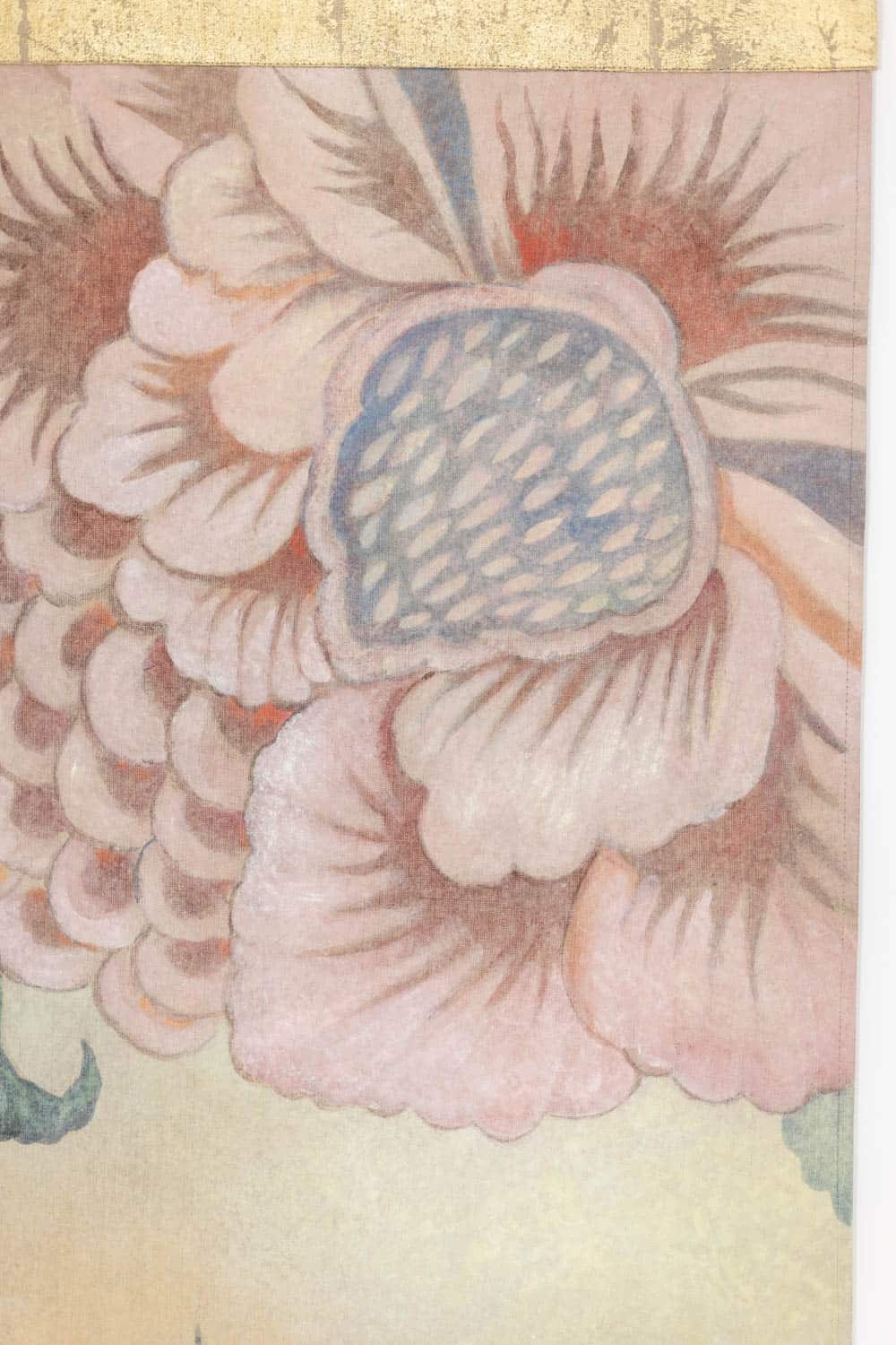 Introducing this captivating contemporary painting depicting a chameleon perched gracefully on its branch. Crafted on raw linen canvas, the artwork showcases the intricate detailing of the chameleon’s vibrant colors and distinctive features, capturing its natural beauty. The lush foliage and stylized background, rendered in serene blue and soft pink tones, create a tranquil setting that enhances the enchanting ambiance of the scene. Each stroke of natural pigments and golden patterns, delicately applied with copper leaf, adds depth and texture to the composition. This contemporary work of art is sure to spark conversation and inspire admiration.