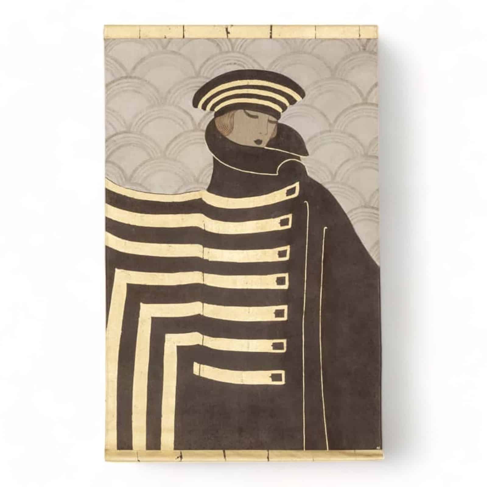 Experience the allure of another era with this painting of an Art Deco lady. A painted canvas or decorative panel captures the essence of the period, showcasing a stylish woman in three-quarter profile. She is adorned in a striking black coat that complements her black and gold striped headgear, set against a backdrop of Seigaiha patterned background—a motif of repeating half-circles. Crafted by French contemporary artists, this piece exudes sophistication and elegance, making it a timeless addition to any space.