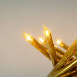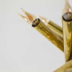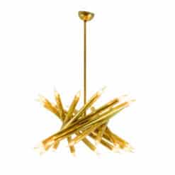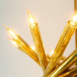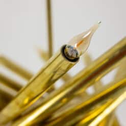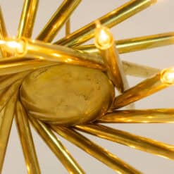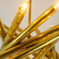 Elegant pair of 24-light chandeliers in patinated brass, featuring a striking radiating tube design. These sculptural statement pieces reflect refined Italian craftsmanship from the 1980s and embody the sophisticated glamour of late 20th-century Italian lighting design.