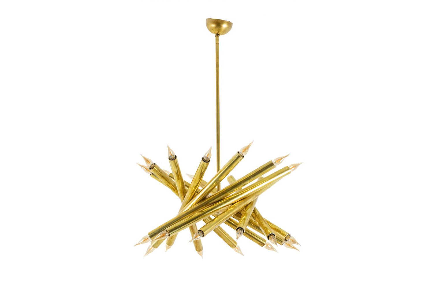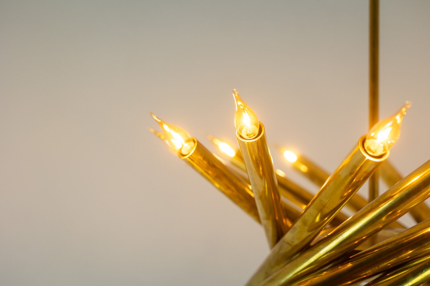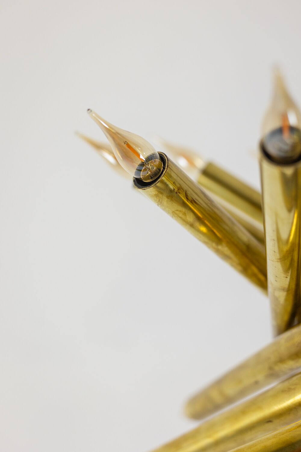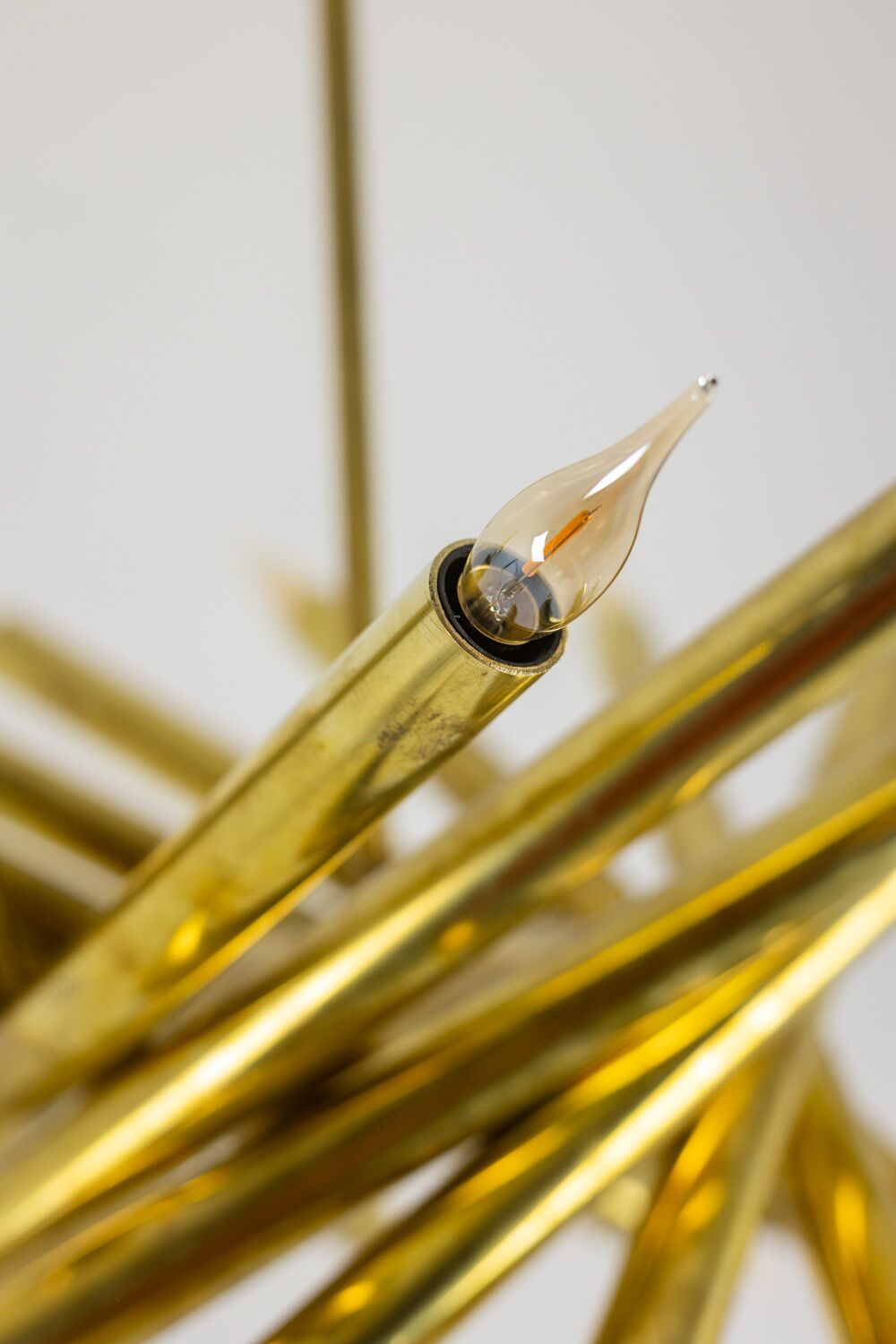 Elegant pair of 24-light chandeliers in patinated brass, featuring a striking radiating tube design. These sculptural statement pieces reflect refined Italian craftsmanship from the 1980s and embody the sophisticated glamour of late 20th-century Italian lighting design.