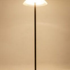 Elegant pair of Art Deco–style floor lamps designed by renowned French designer Andrée Putman. Crafted in bronze-colored lacquered metal with frosted glass shades, these lamps combine sculptural form with ambient lighting. French work from the 1980s.