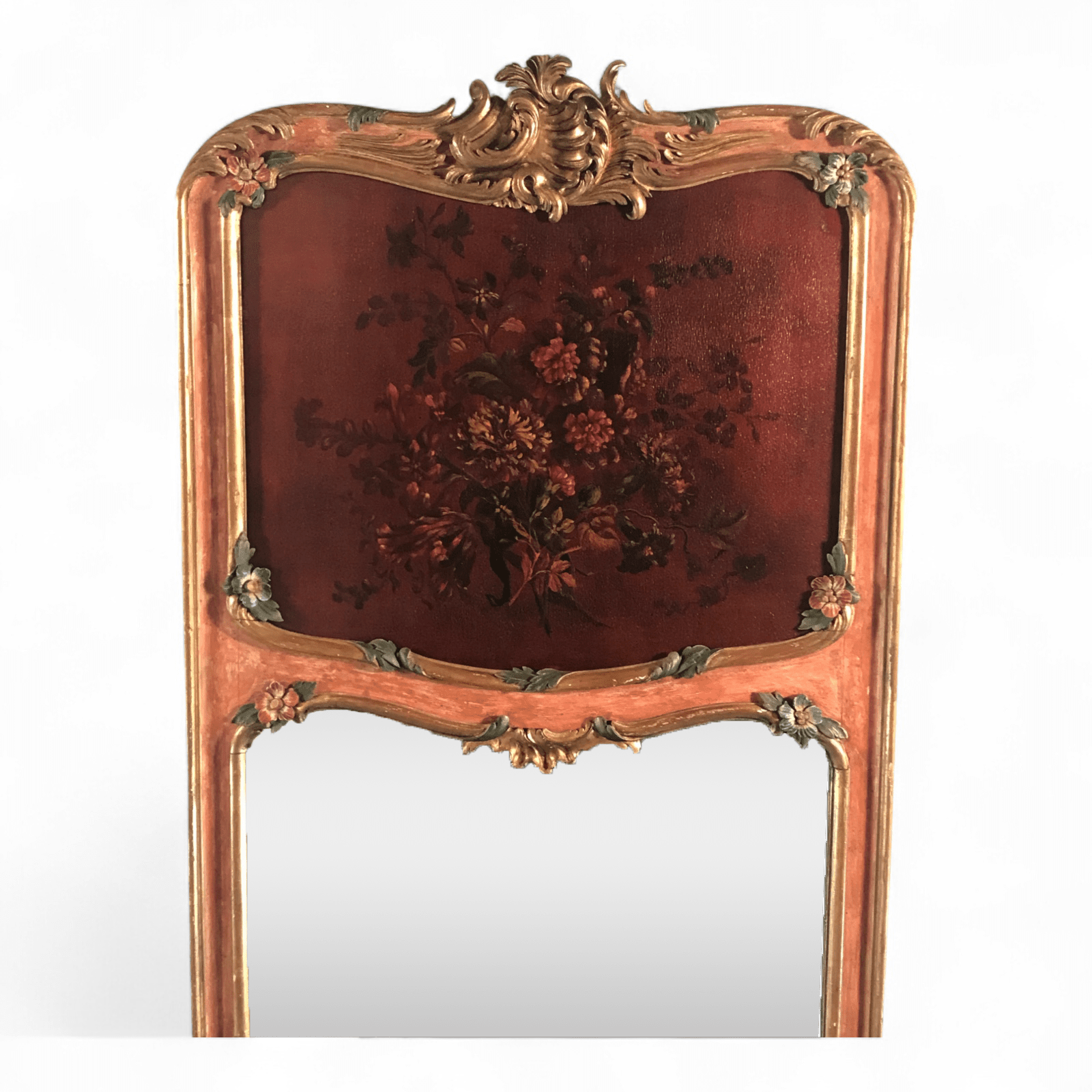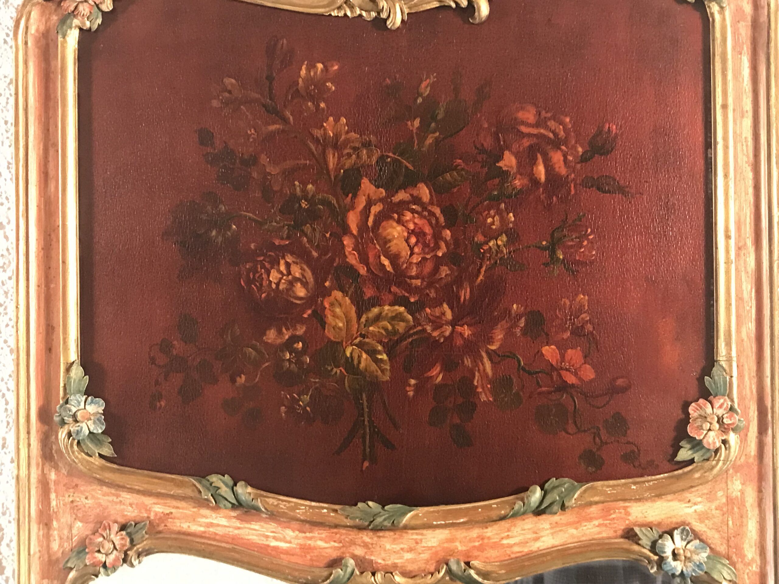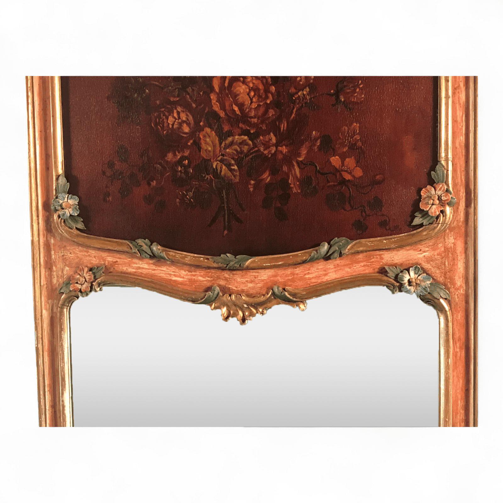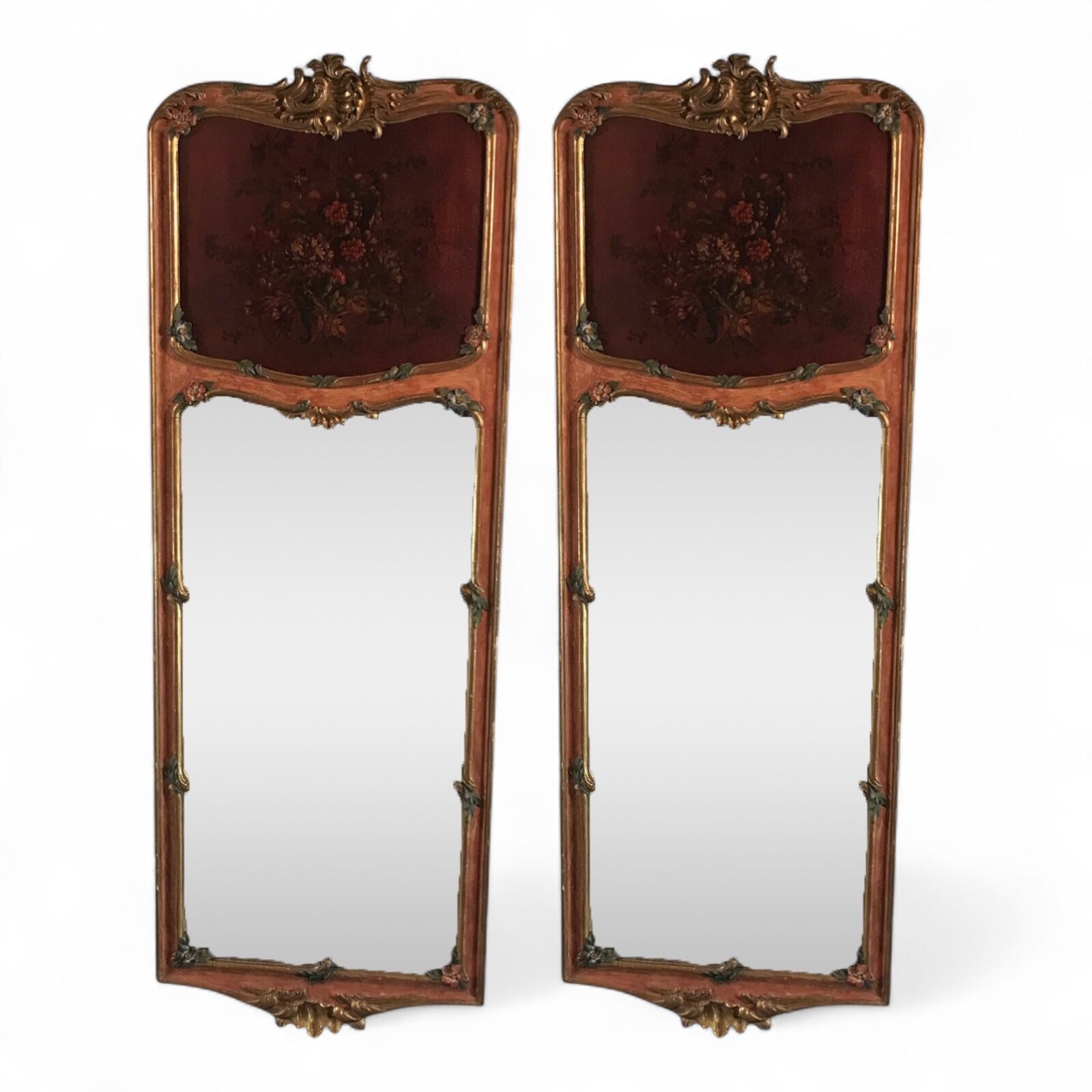 What sets these antique mirrors apart is their hand-painted floral decoration, including a delicately rendered flower painting in the upper section of each frame. The harmonious color palette and intricate brushwork add depth and artistic charm, making these mirrors not just functional objects, but true works of art.
