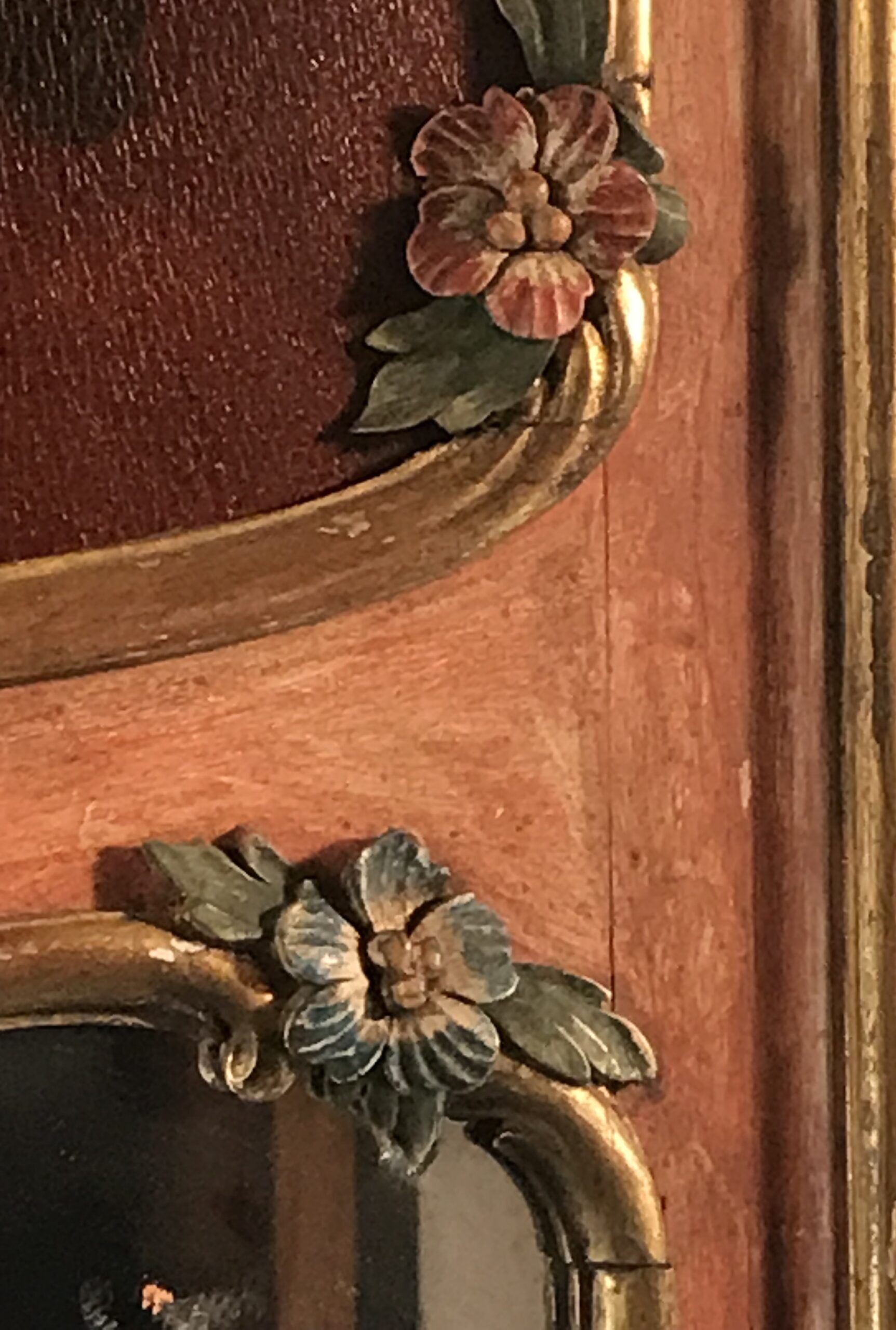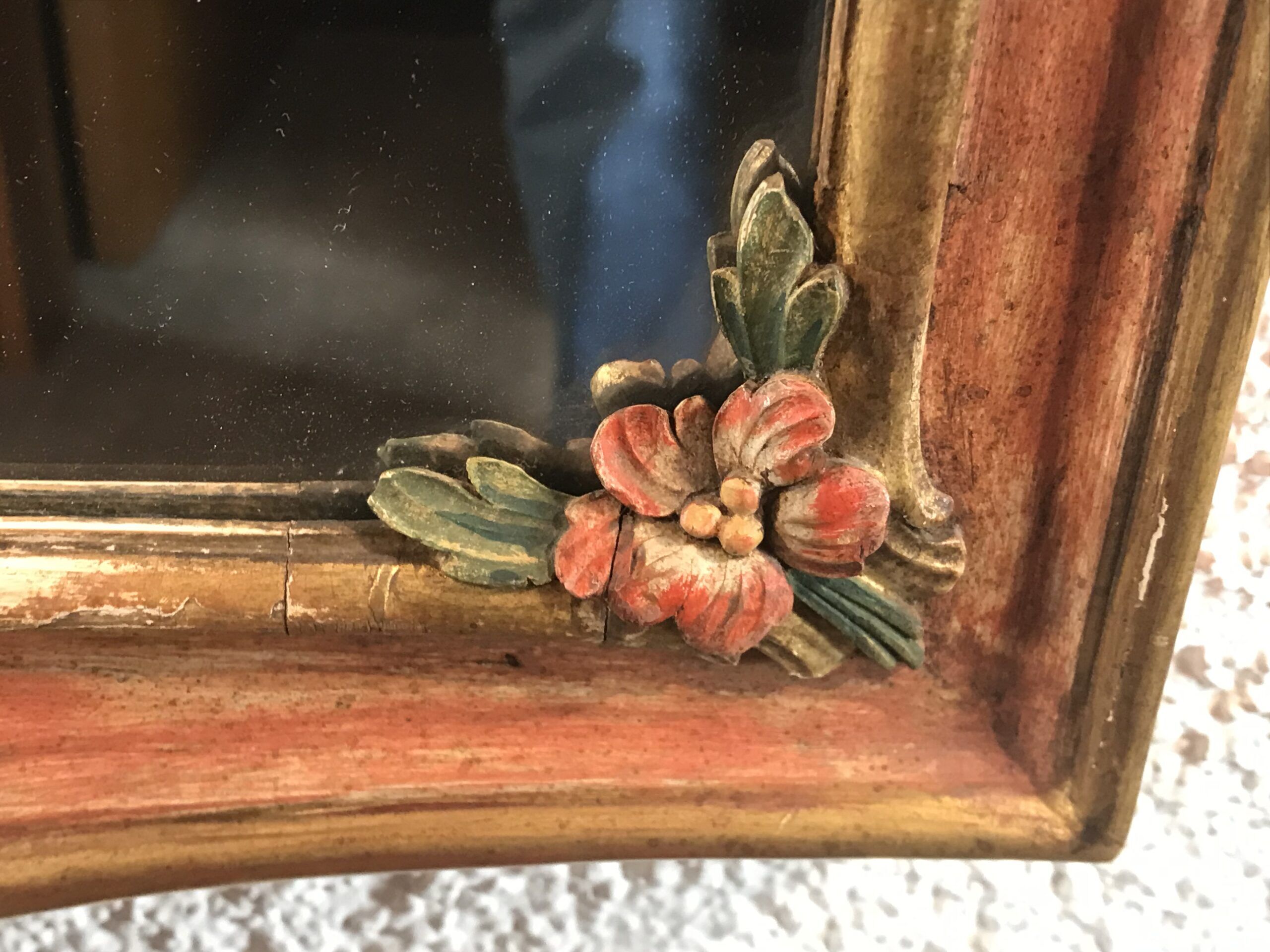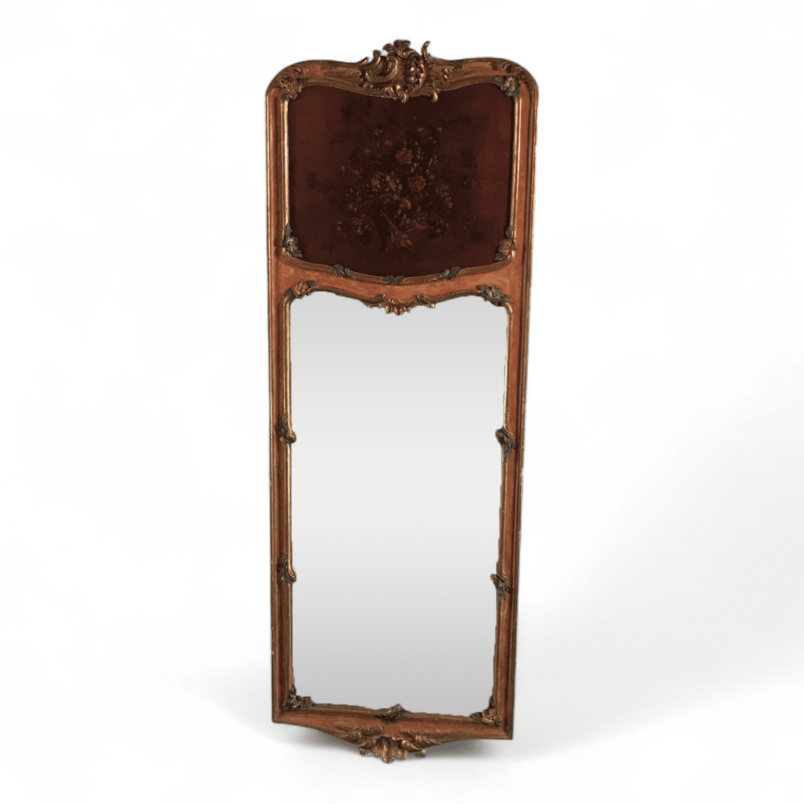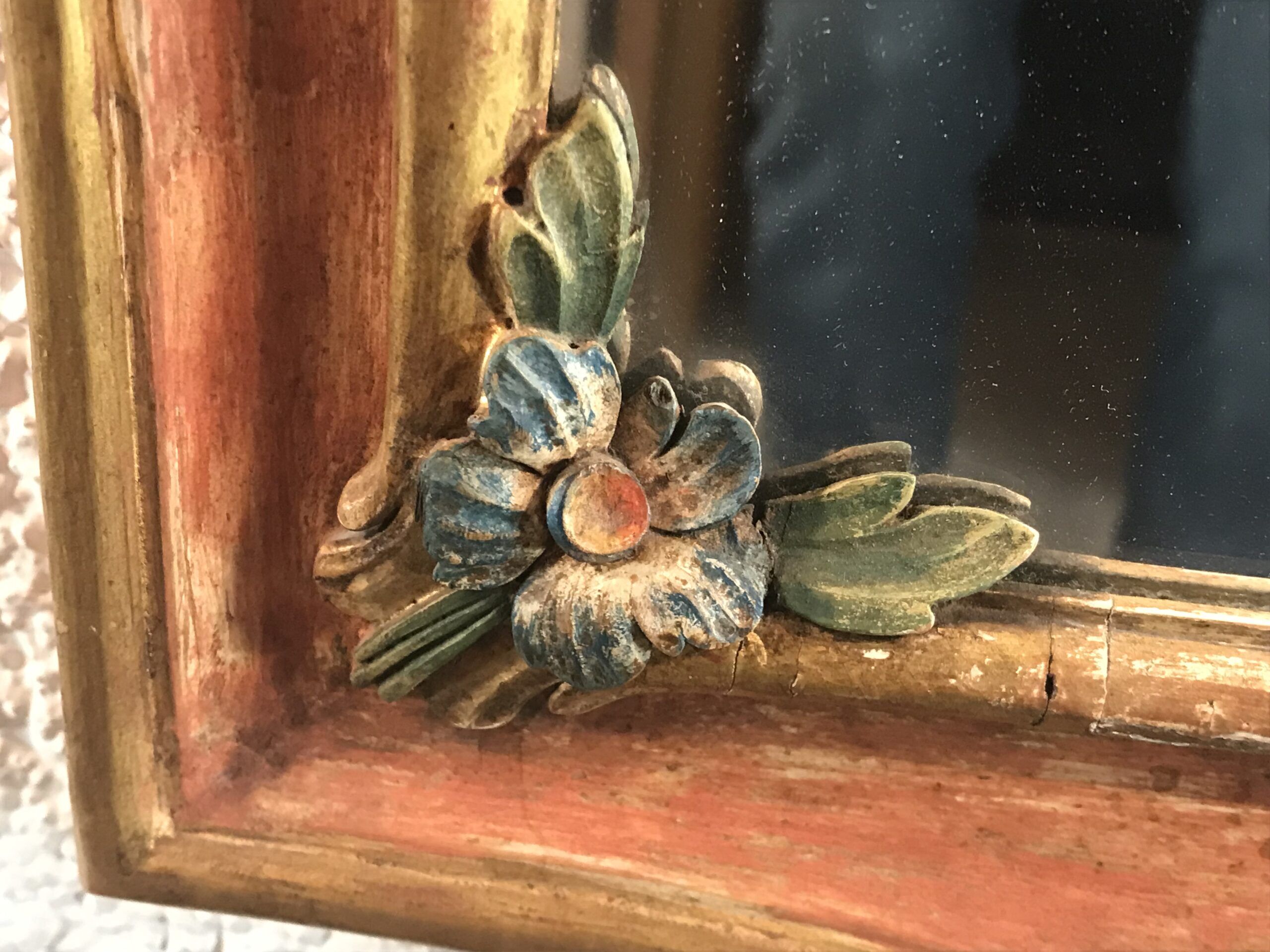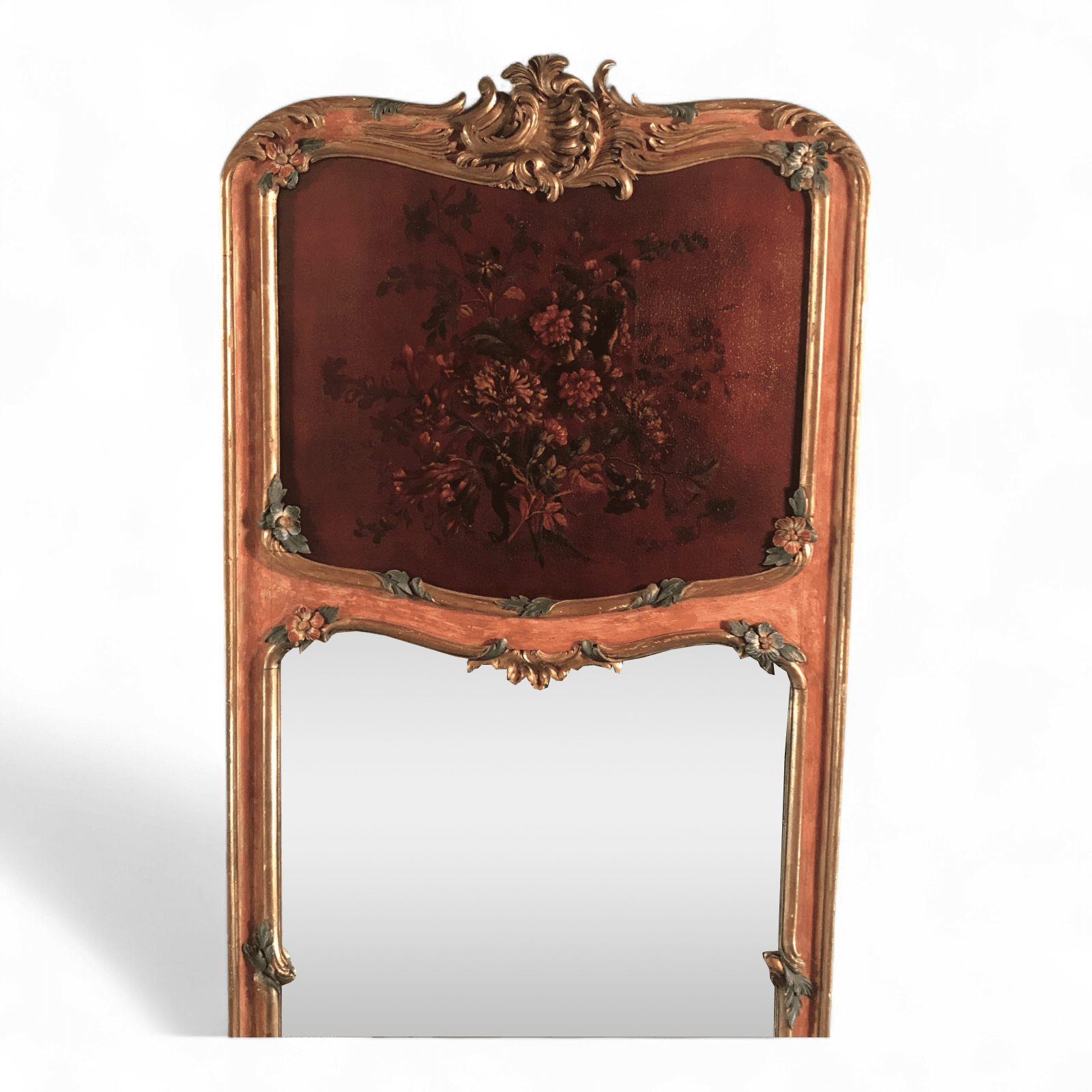 What sets these antique mirrors apart is their hand-painted floral decoration, including a delicately rendered flower painting in the upper section of each frame. The harmonious color palette and intricate brushwork add depth and artistic charm, making these mirrors not just functional objects, but true works of art.