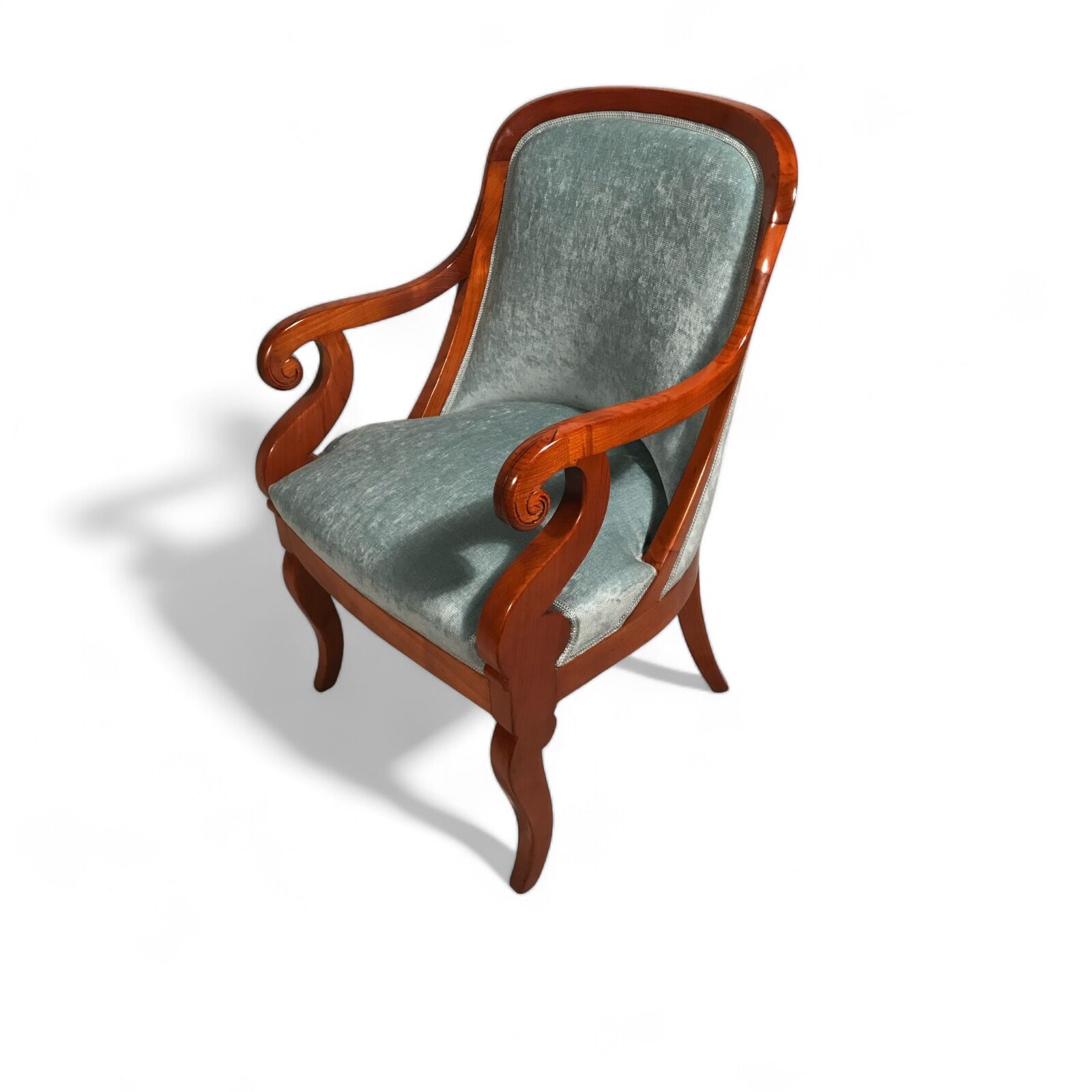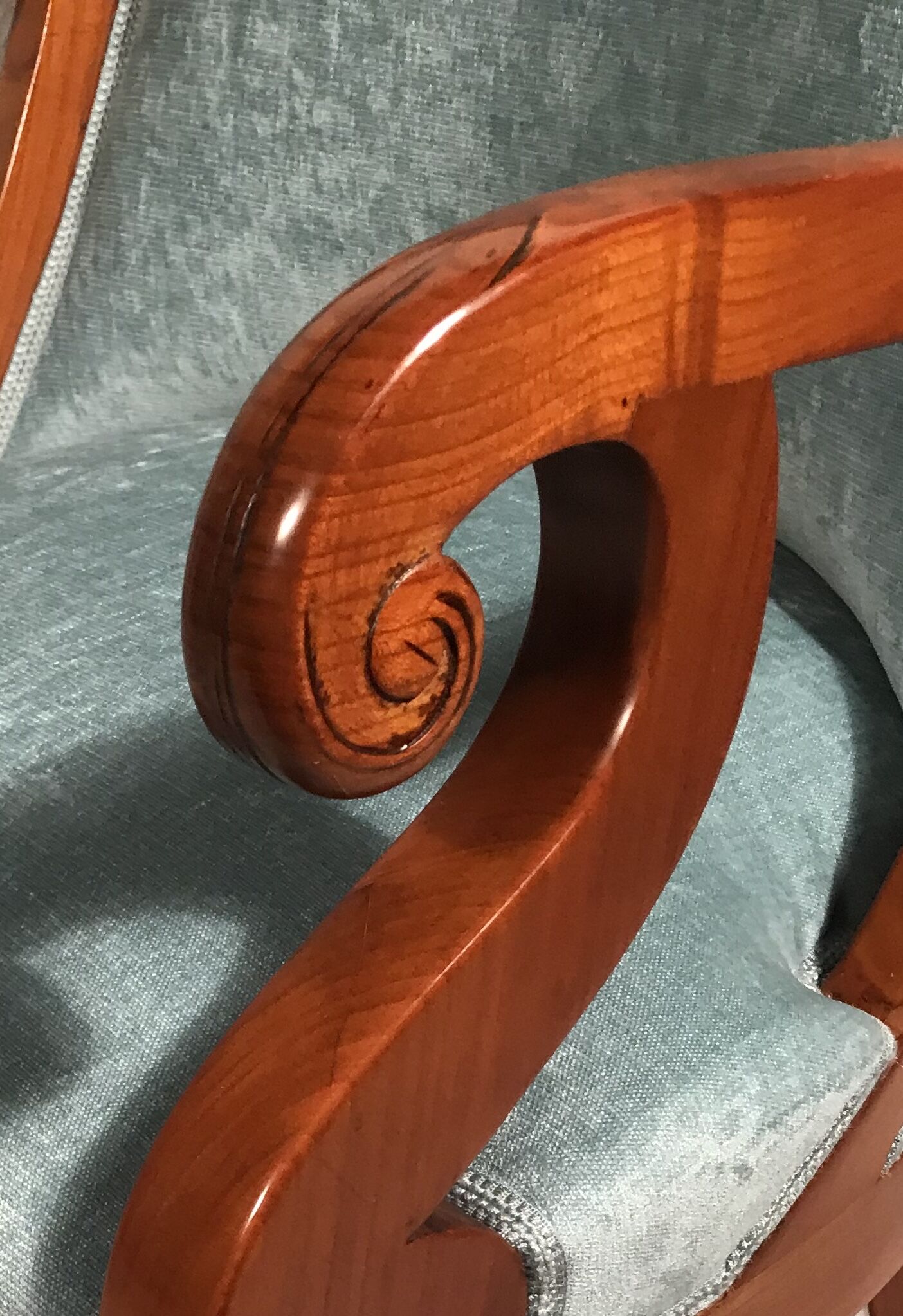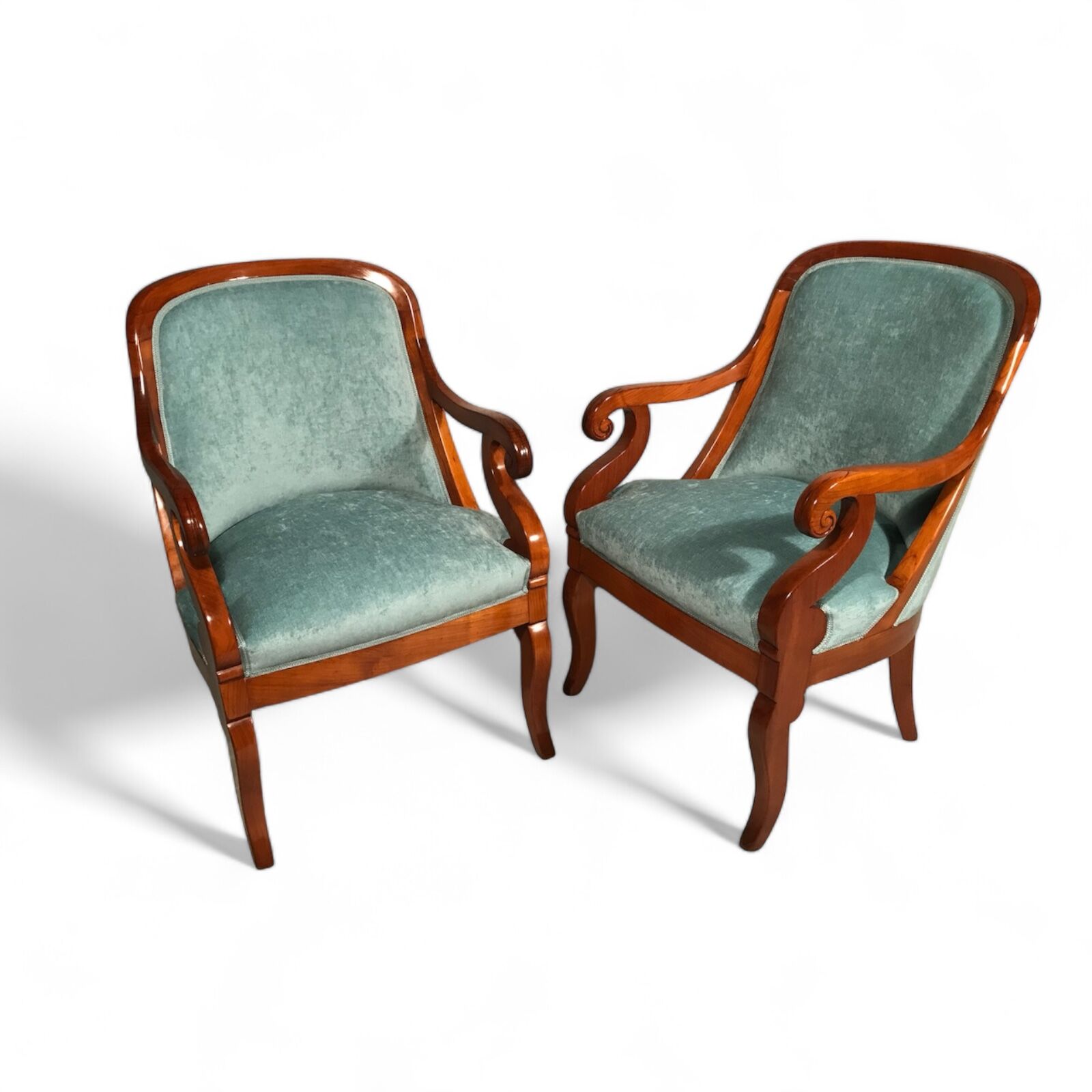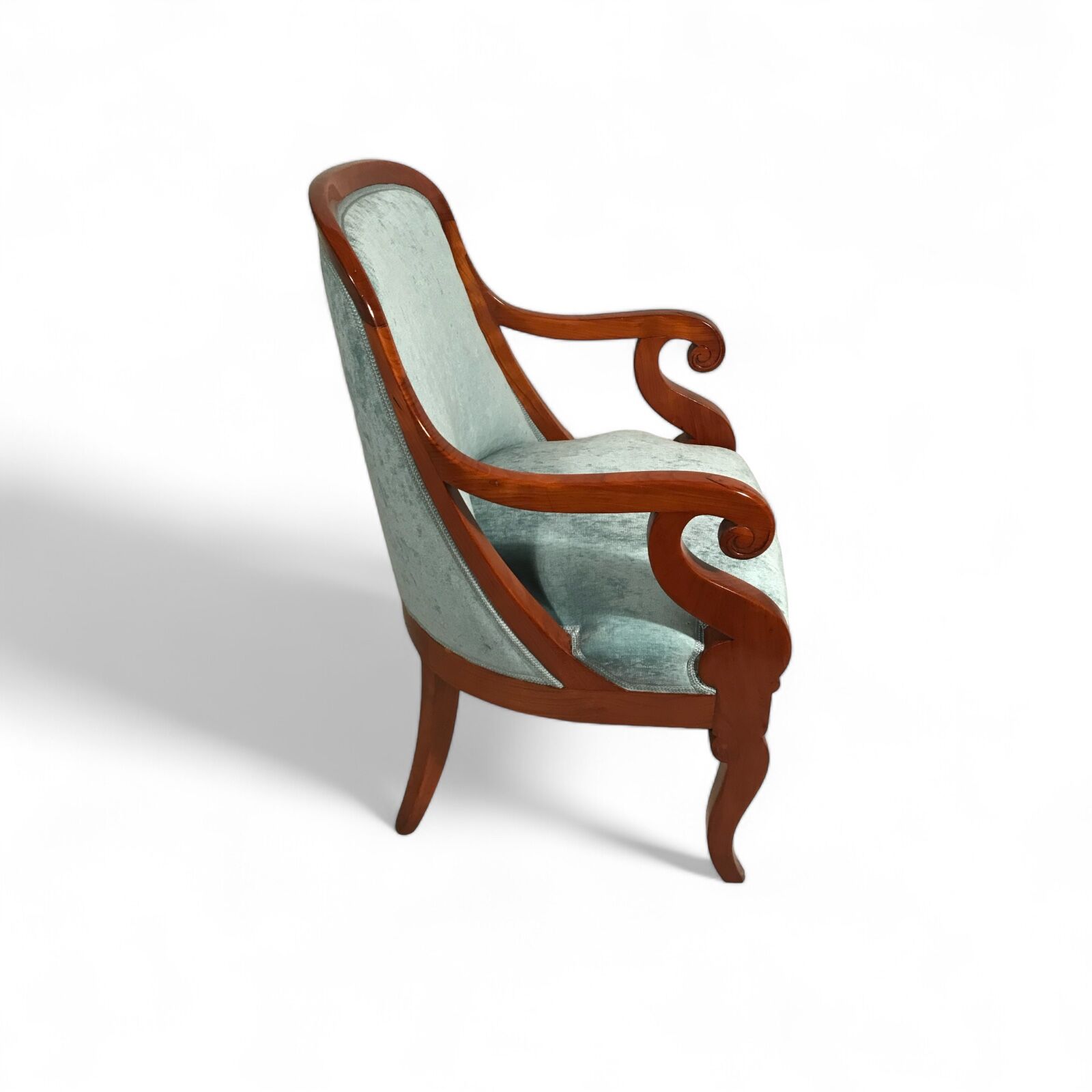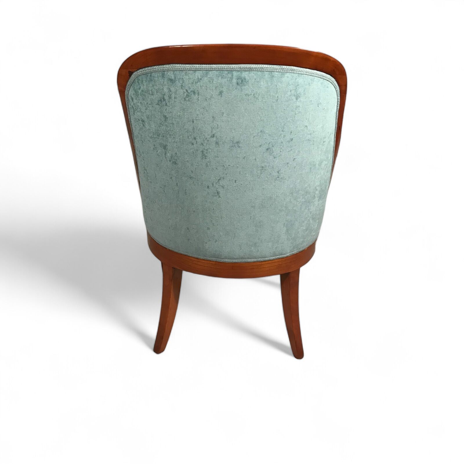 This exquisite pair of Biedermeier barrel chairs, originating from Southern Germany circa 1820, showcases a stunning cherry veneer complemented by newly upholstered light blue velour fabric. Each Biedermeier chair features a distinctive barrel-shaped back and elegant armrests ending in a volute. These chairs are meticulously refinished to enhance their timeless beauty, making them a perfect blend of antique charm and modern sophistication.
