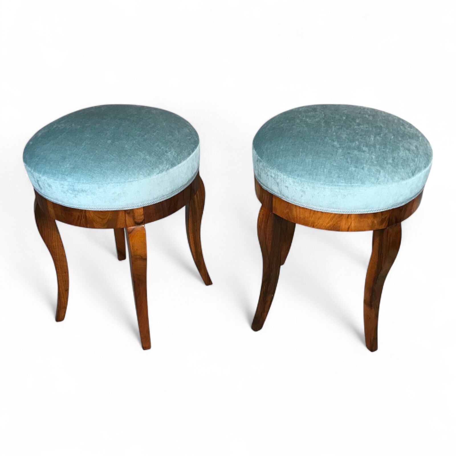This elegant pair of Biedermeier stools originates from South Germany and dates back to around 1820. Crafted with the distinctive simplicity and grace characteristic of the Biedermeier era, each stool features a circular seat supported by gently curved legs. The warm walnut veneer adds a rich, natural tone that enhances the refined silhouette of the design.