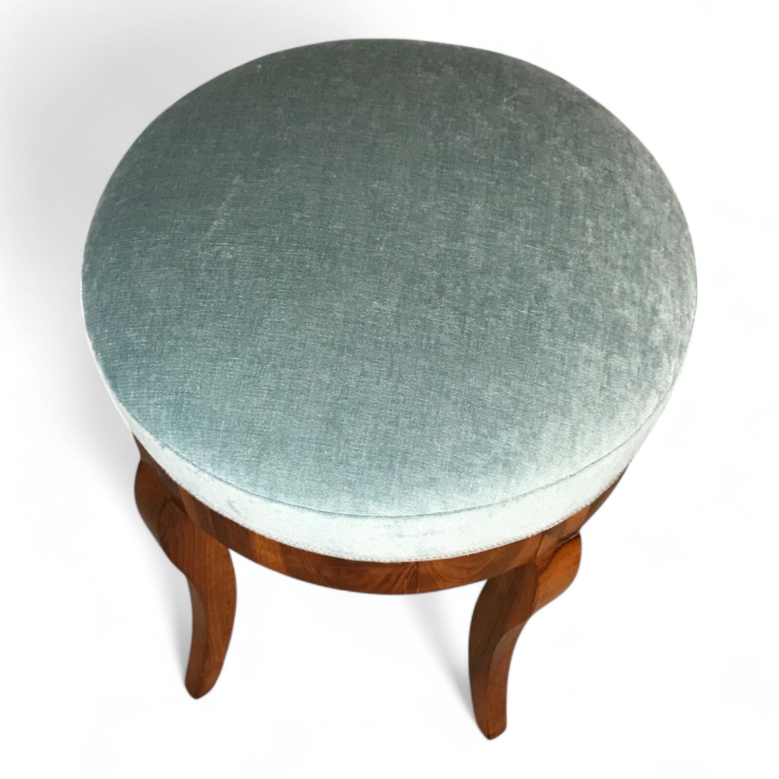The stools have been newly upholstered in a high-quality fabric, offering a fresh and comfortable seating experience while preserving the timeless charm of the originals. Their compact, rounded form makes them highly versatile—perfect as occasional seating, vanity stools, or as decorative accents in both classic and contemporary interiors.