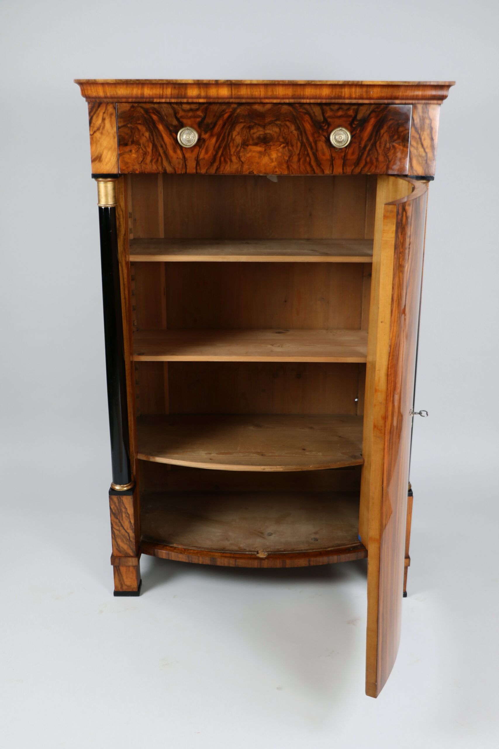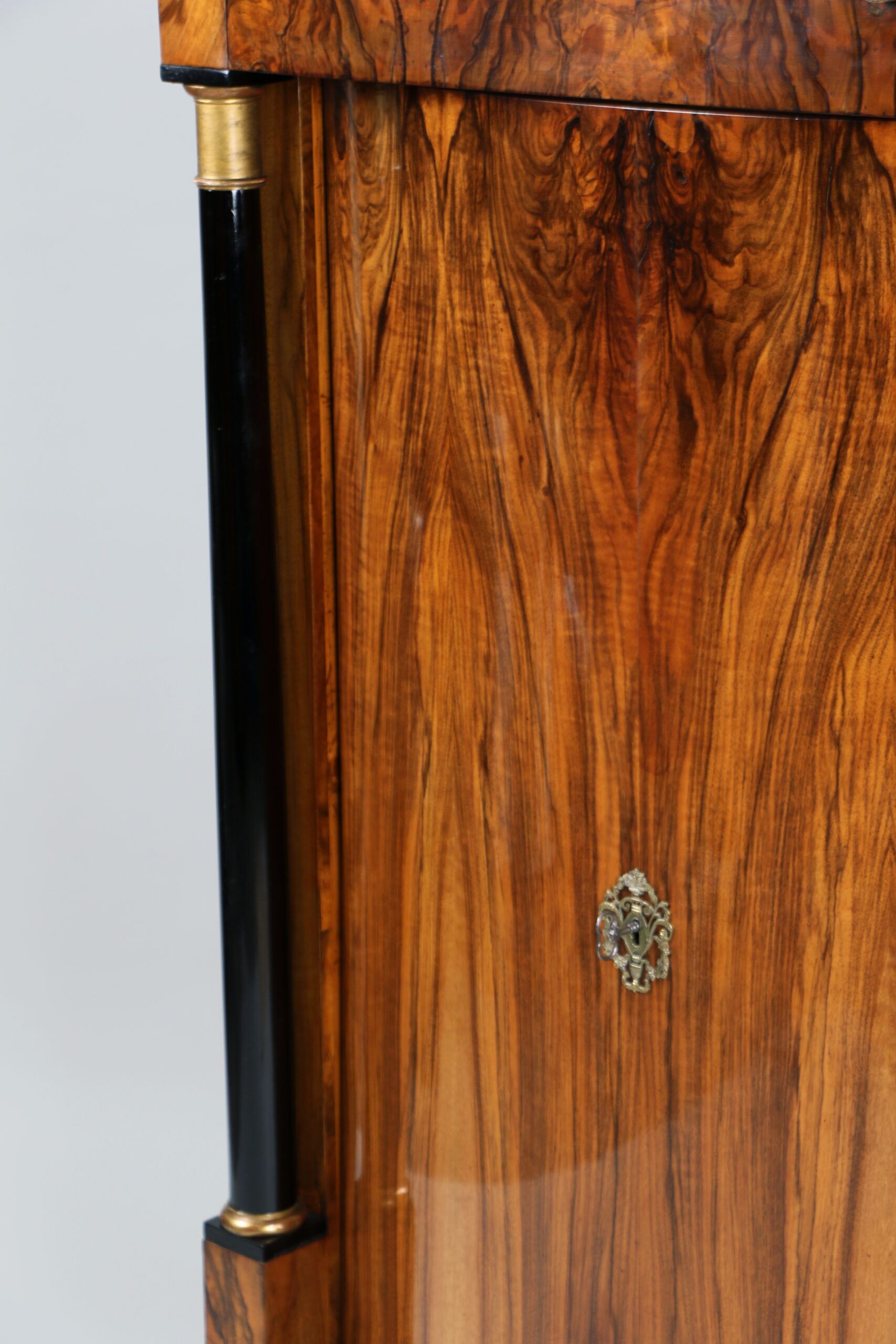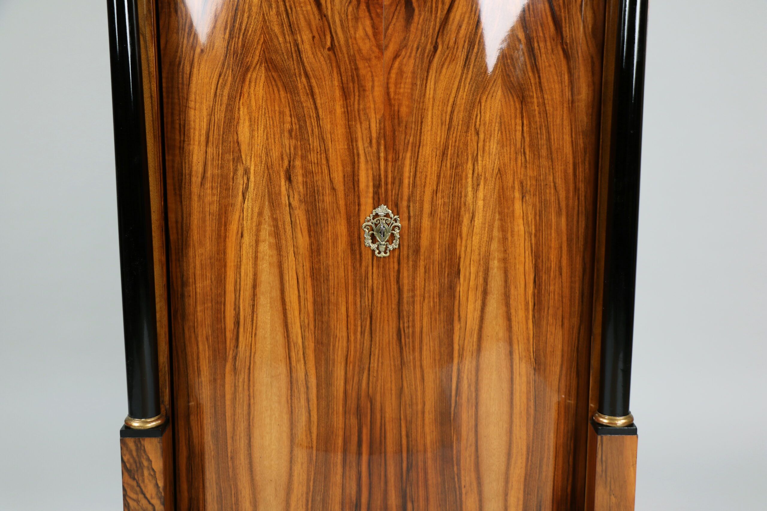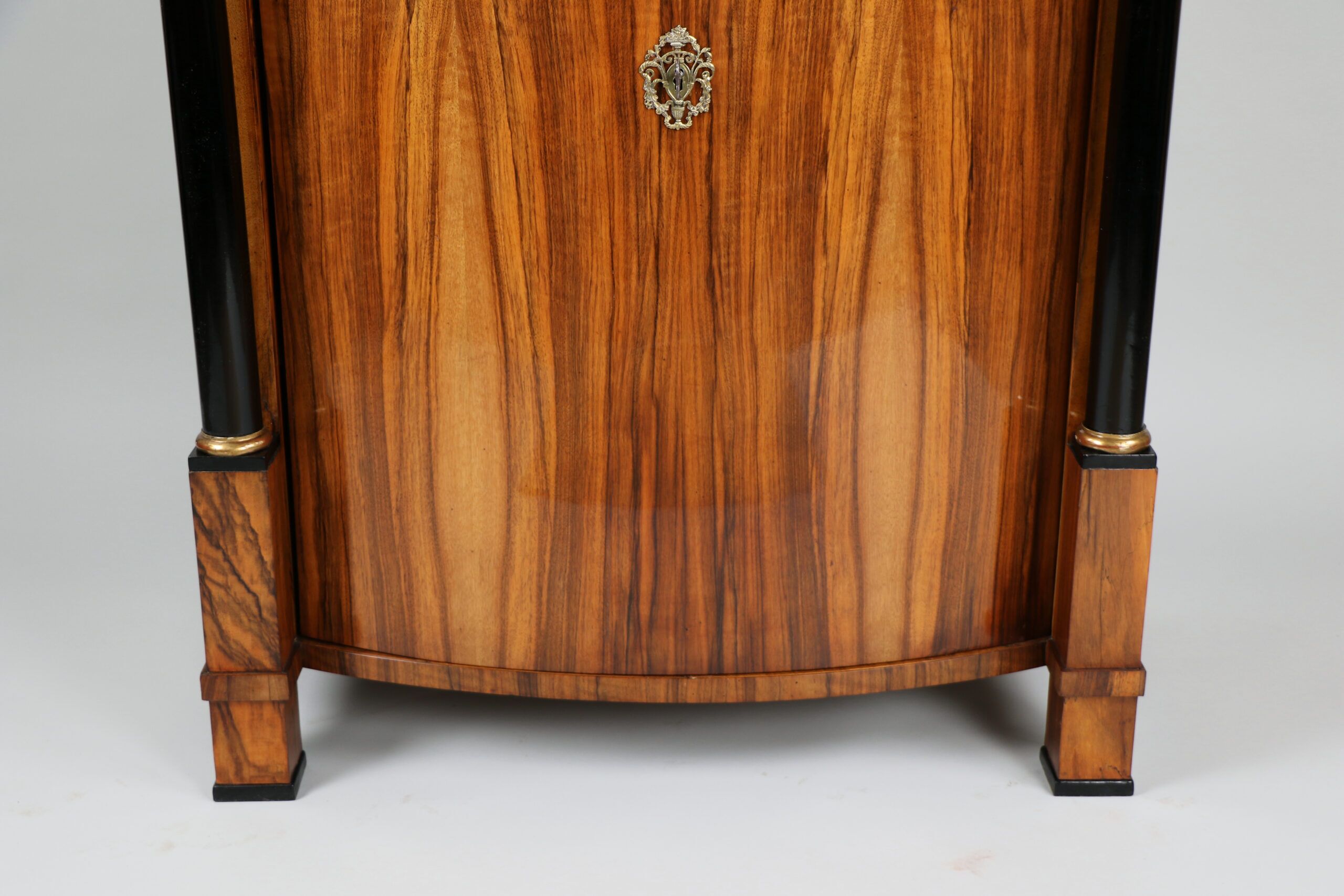 Each cabinet features gracefully convex doors with the original locks, framed by ebonized columns with capitals and bases gilded in hand-applied gold leaf. The exquisite walnut veneer displays a richly figured grain enhanced by a deep amber French polish, glowing with nearly two centuries of patina. The warm wood tones contrast elegantly with the dark columns and subtle gilding, creating a composition of timeless balance and visual depth.