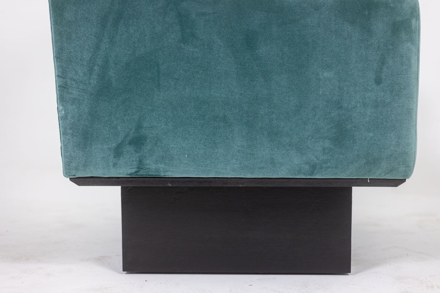 This pair of “club” armchairs from the 1940s stands out with their cubic shape and bold design. Upholstered in a stunning blue-green velvet, the armchairs offer both comfort and a striking visual presence. The chairs are supported by a sleek black lacquered wooden base, featuring a square shape that complements the modernist form of the armchairs. The angular design and fabric choice give these pieces a refined yet distinctive look, reminiscent of works by renowned designer Jacques Adnet. This French work, crafted in the 1940s, adds a touch of mid-century elegance, with clean lines and luxurious materials, making them a perfect fit for contemporary or vintage-inspired interiors.