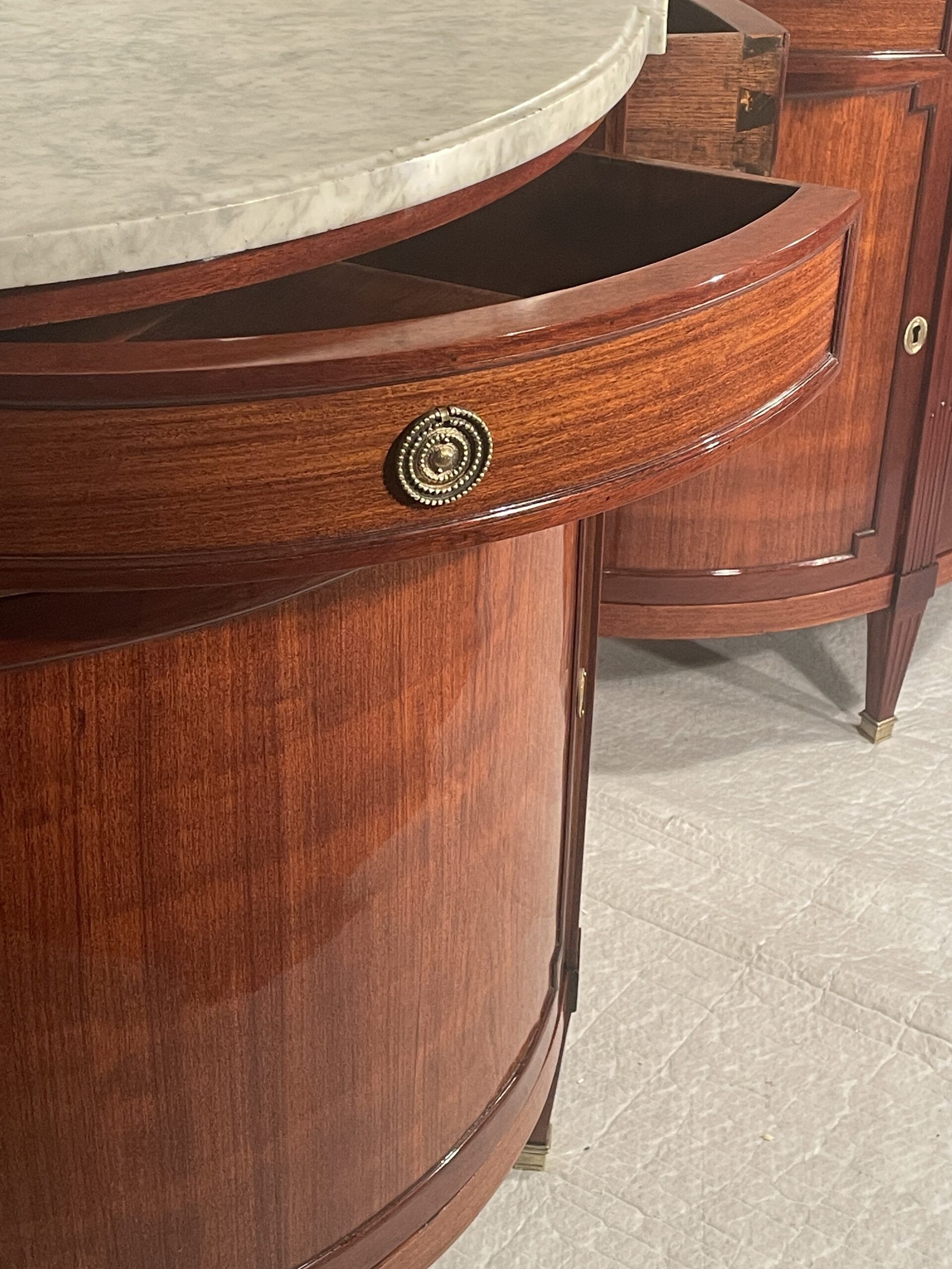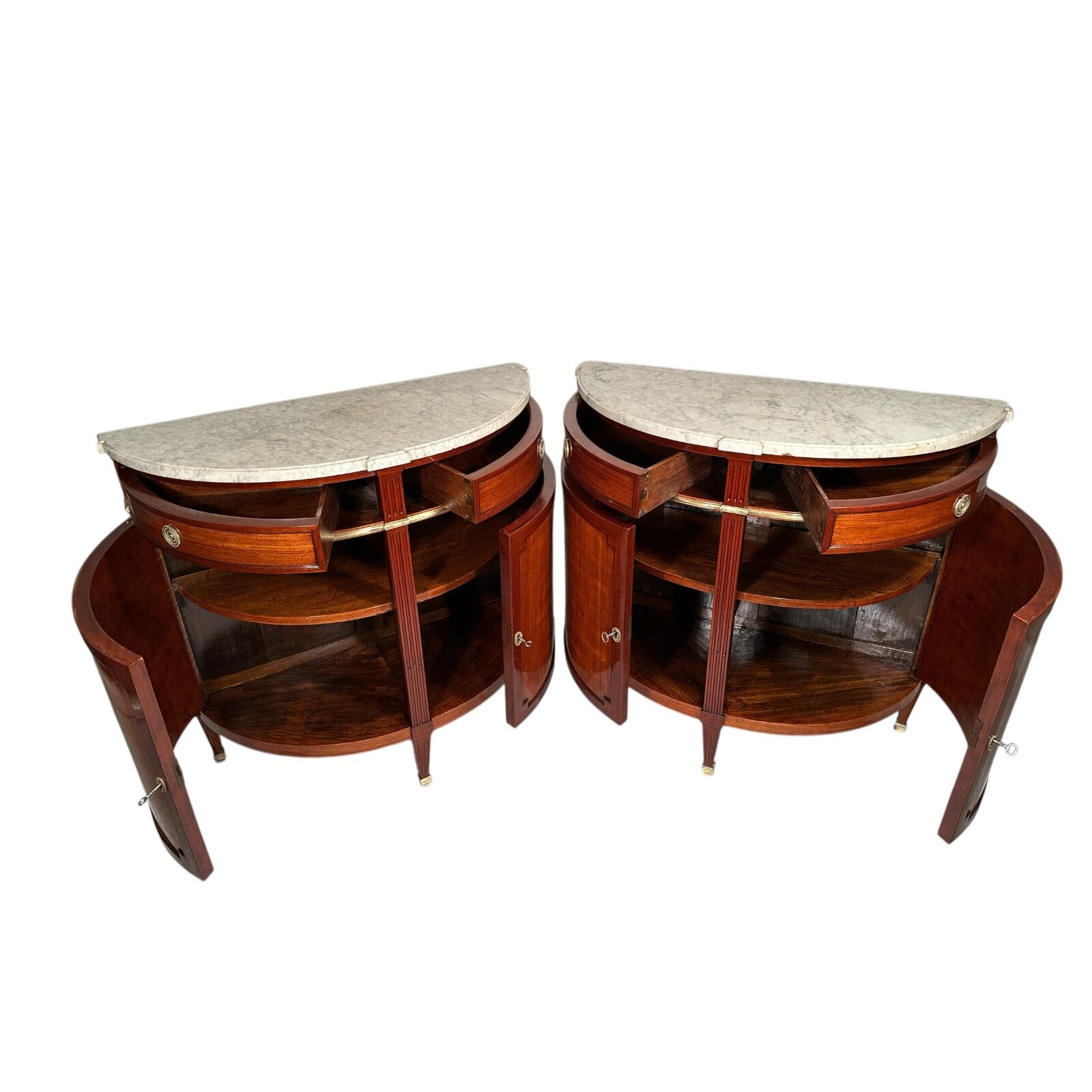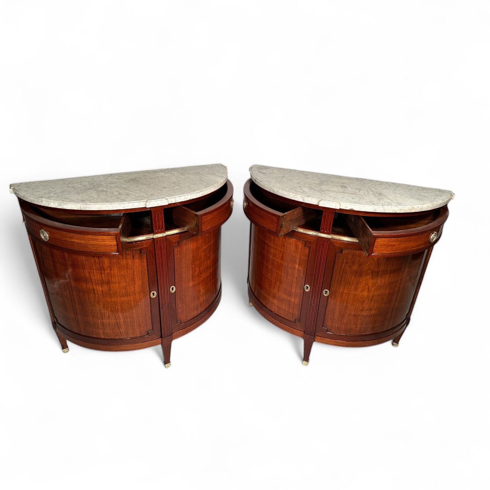 Each cabinet includes two side-opening doors and two side drawers, separated by an elegant brass band. The original white and grey marble tops show gentle, expected wear, adding to their authentic antique charm.