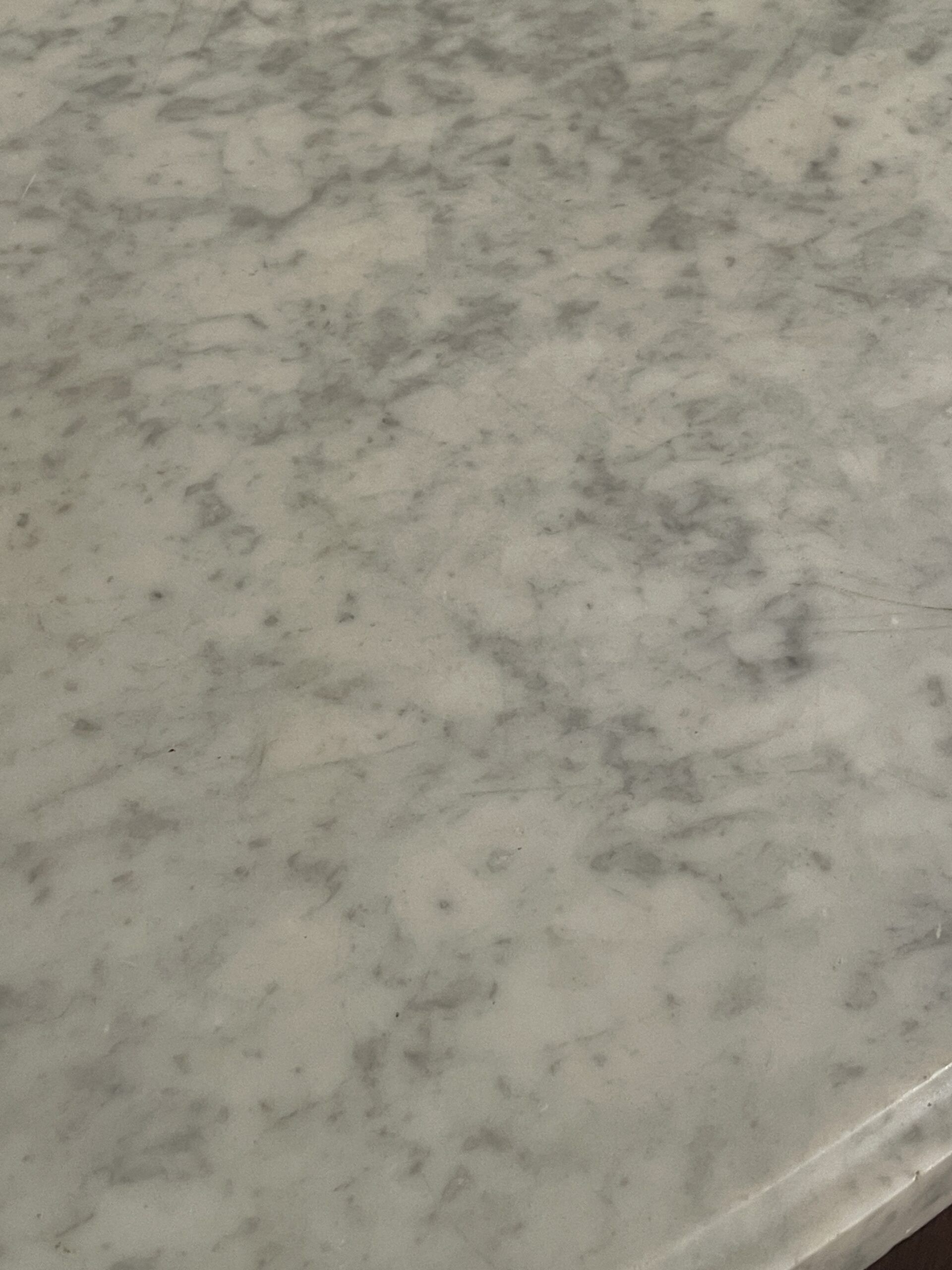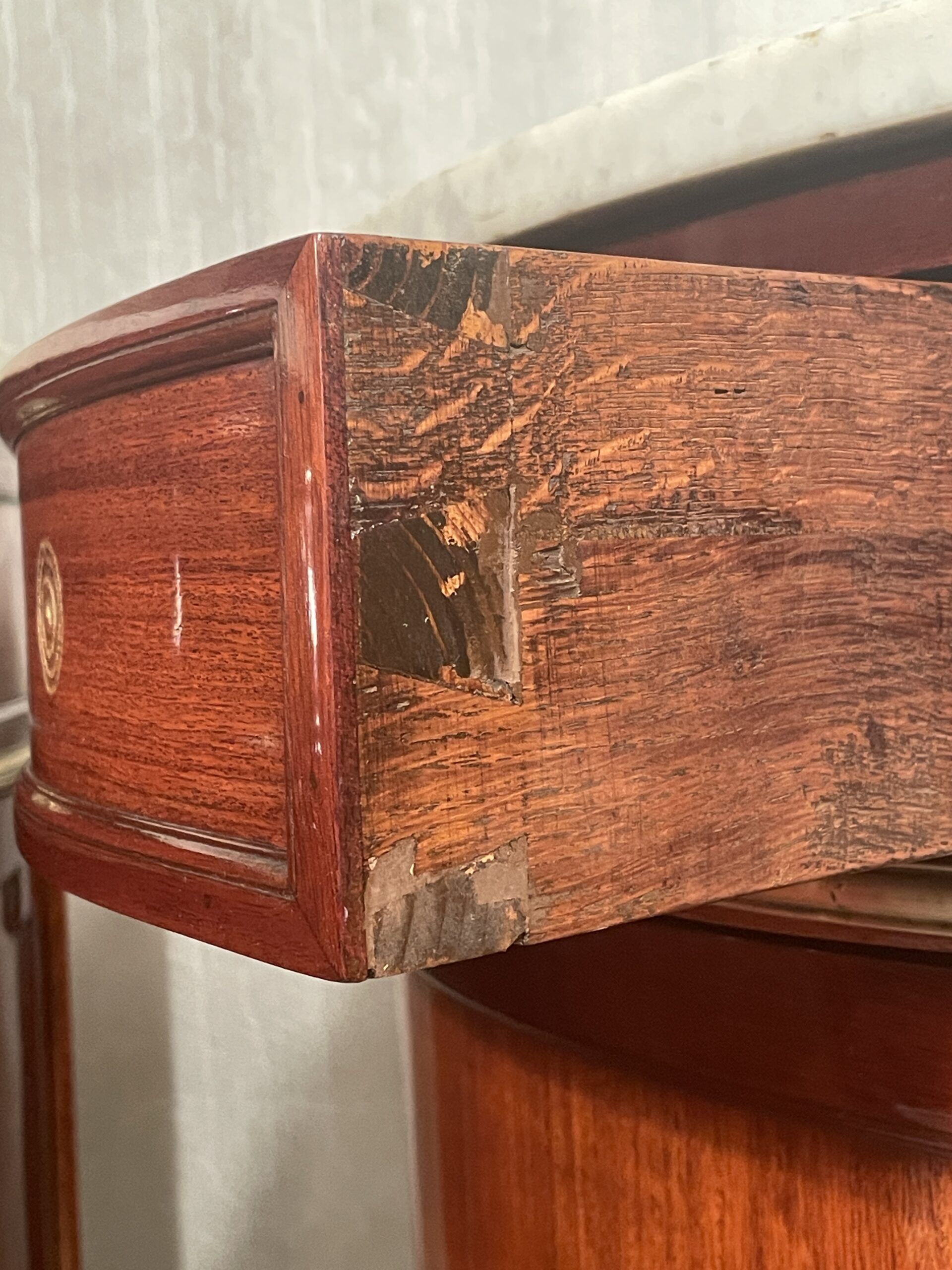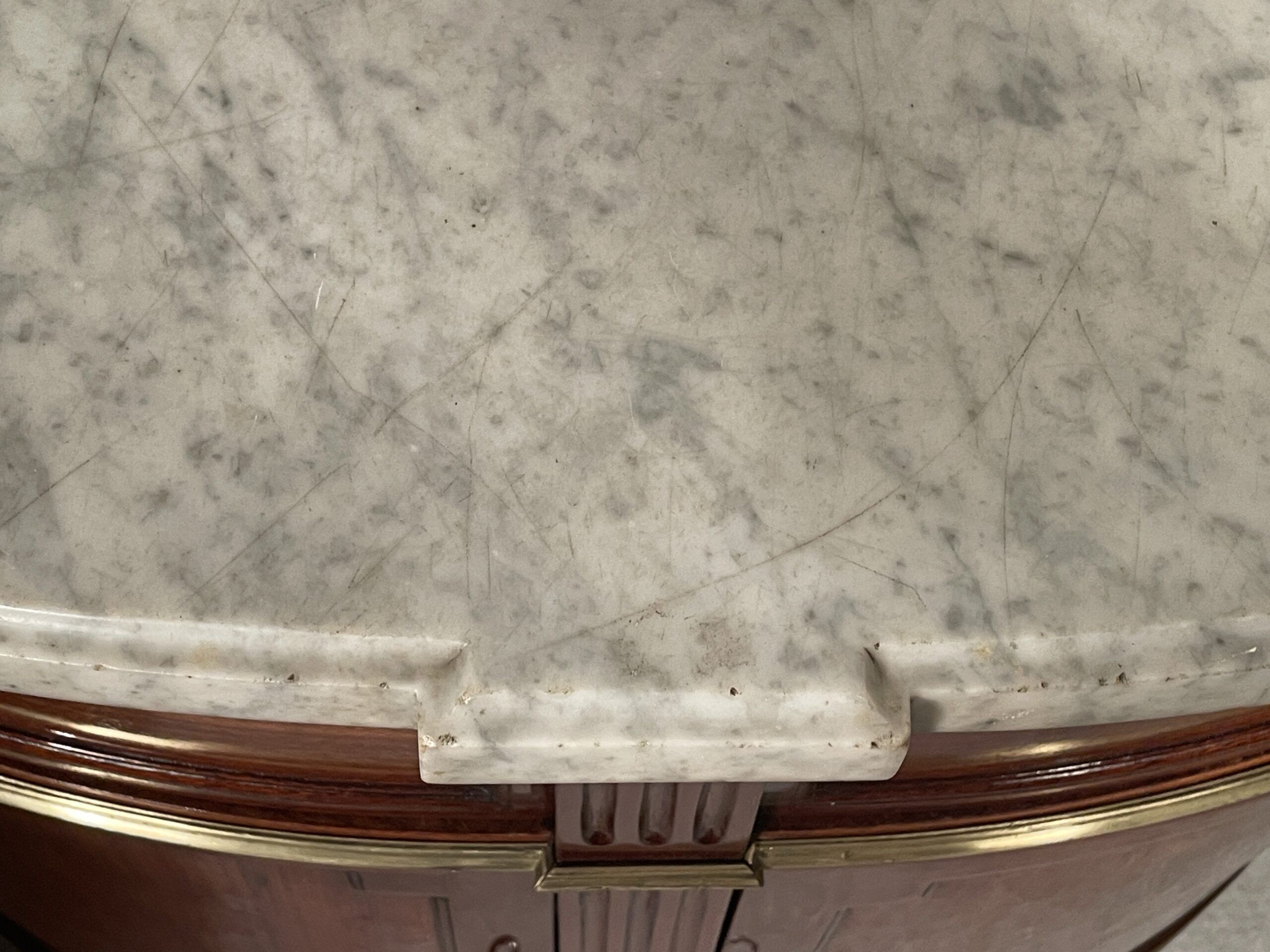 Each cabinet includes two side-opening doors and two side drawers, separated by an elegant brass band. The original white and grey marble tops show gentle, expected wear, adding to their authentic antique charm.