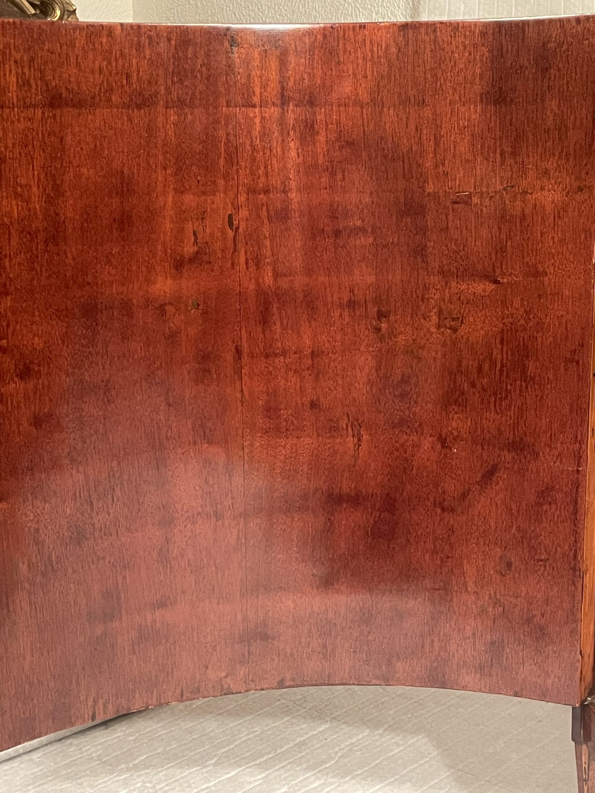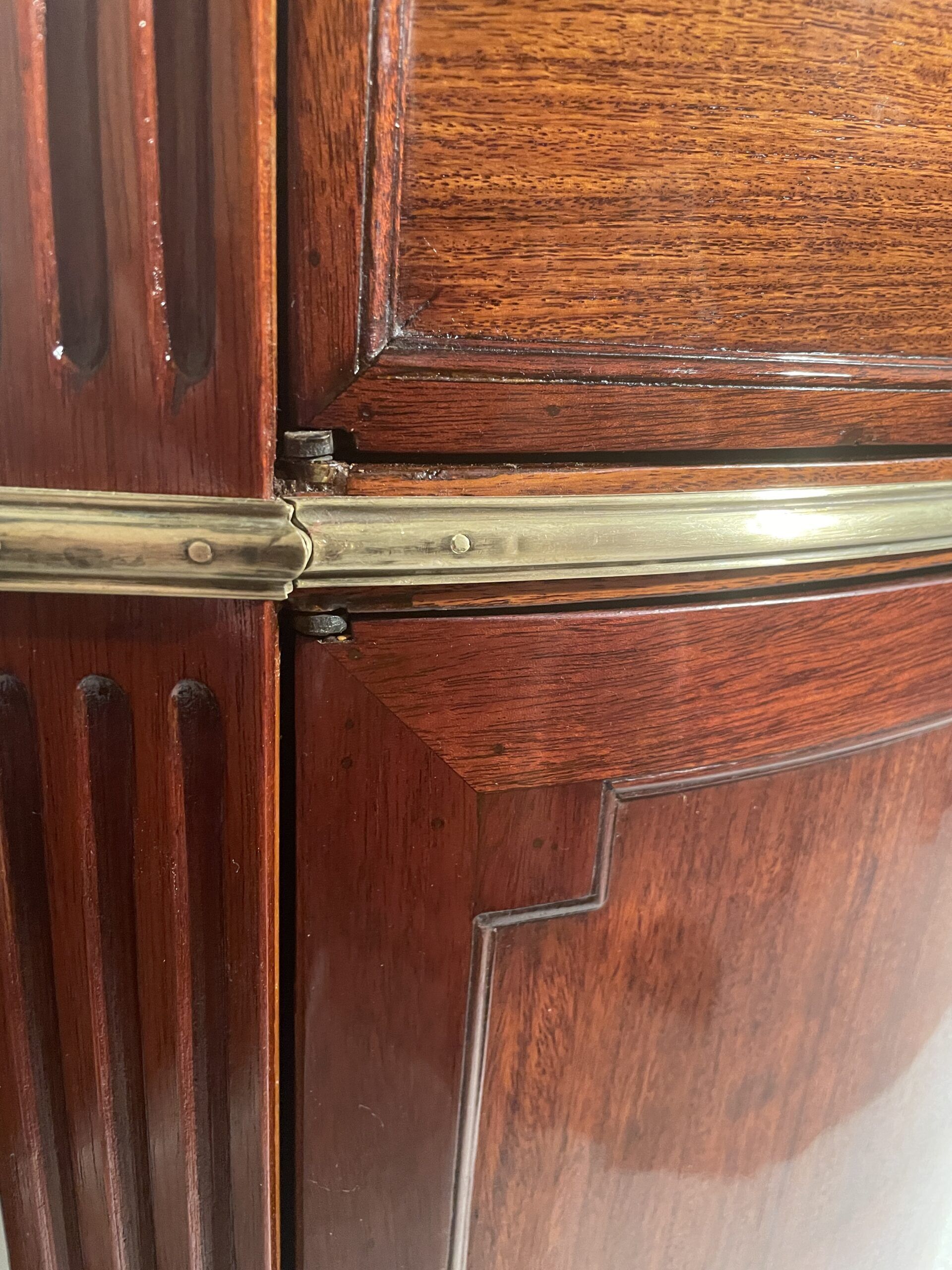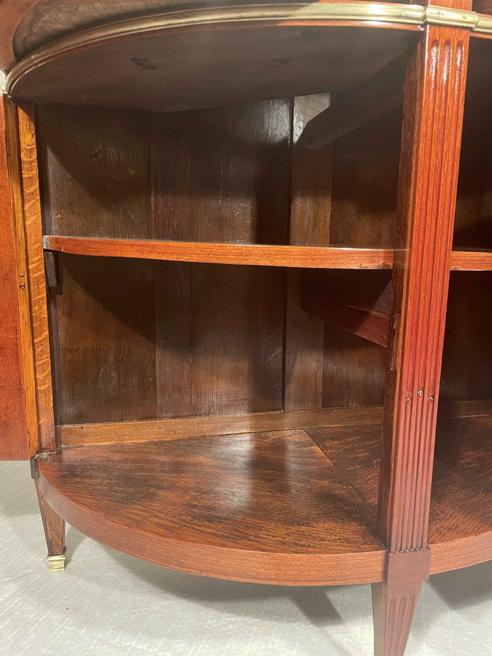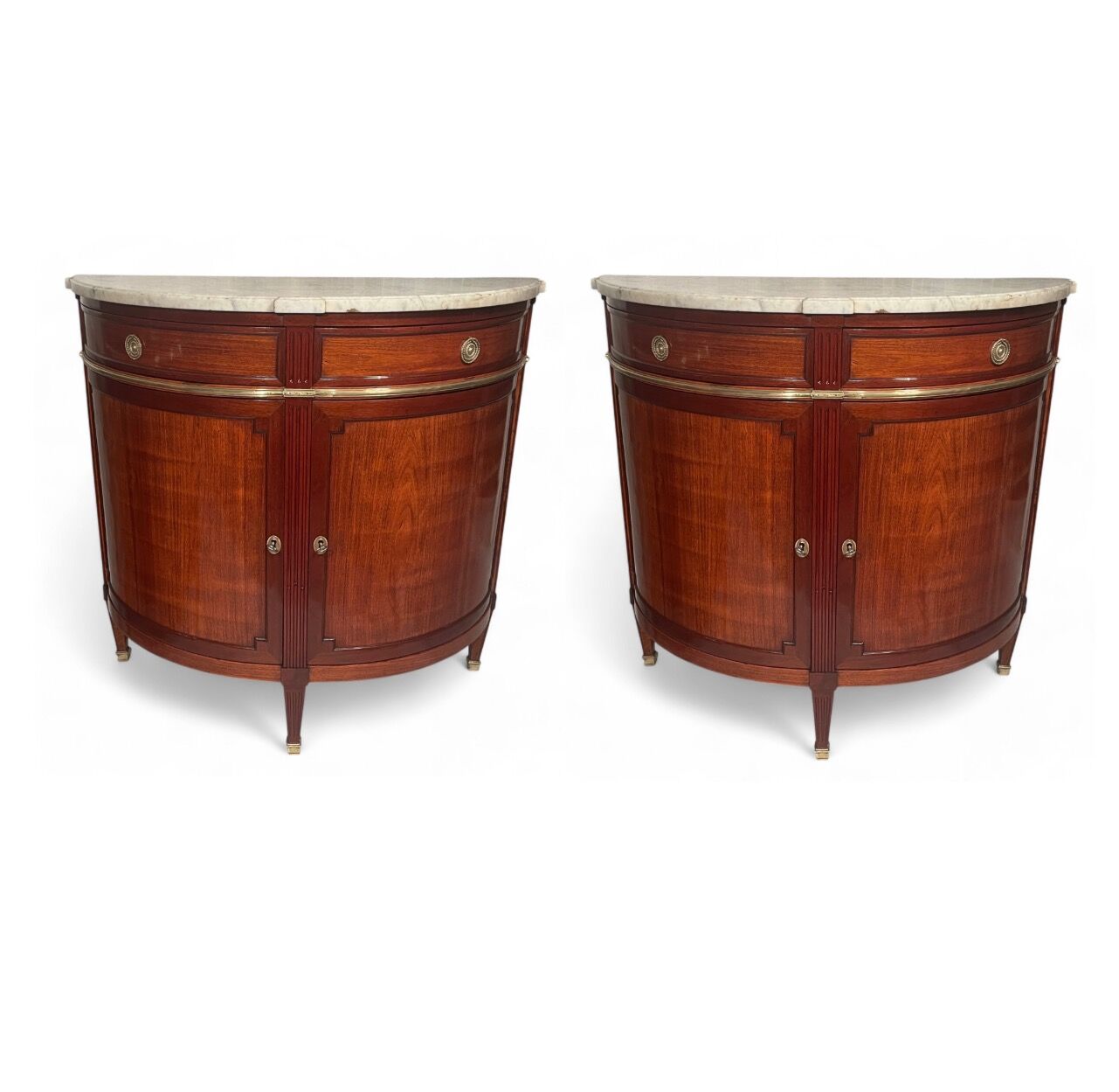 Discover this beautifully refinished pair of Neoclassical Demilune cabinets, crafted in France around 1790-1800, during the Directoire Period. These rare, matching cabinets feature mahogany veneer on sturdy oak, fluted legs, and a central rabbet ledge, embodying timeless French craftsmanship.