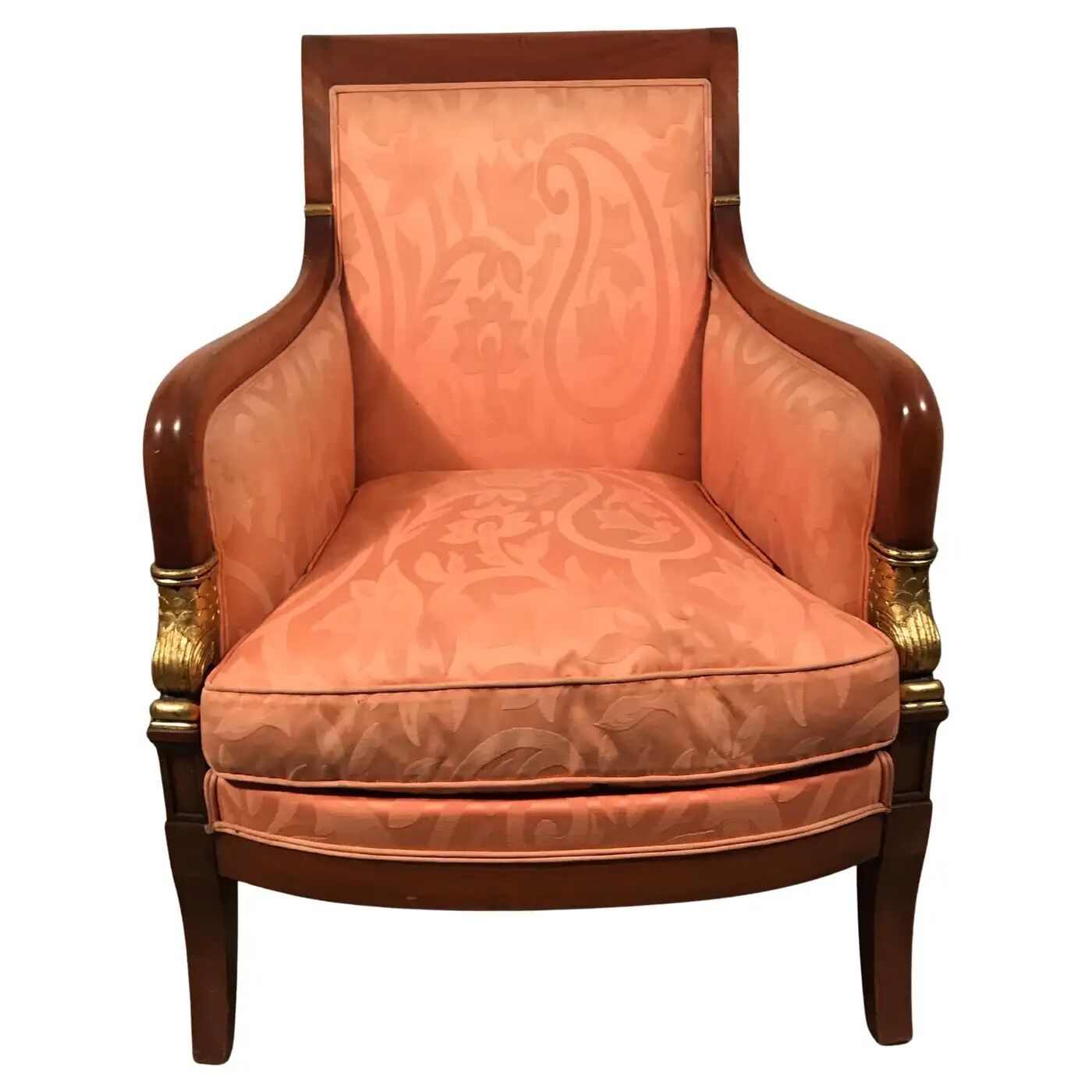 Discover an exquisite pair of Empire-style bergère chairs from the 19th century, crafted from luxurious mahogany. These elegant chairs embody timeless sophistication, featuring high backs and gracefully curved armrests that culminate in intricately carved dolphin head motifs—a hallmark of the Empire period’s refined artistry. The chairs are in good original condition, retaining their authentic charm and structural integrity. The upholstery, while showcasing some signs of use, reflects the chairs’ storied history and offers an opportunity for customization to suit modern or period-appropriate interiors. Ideal for adding a touch of historic elegance to your living space, these armchairs make a statement as decorative and functional pieces of furniture.