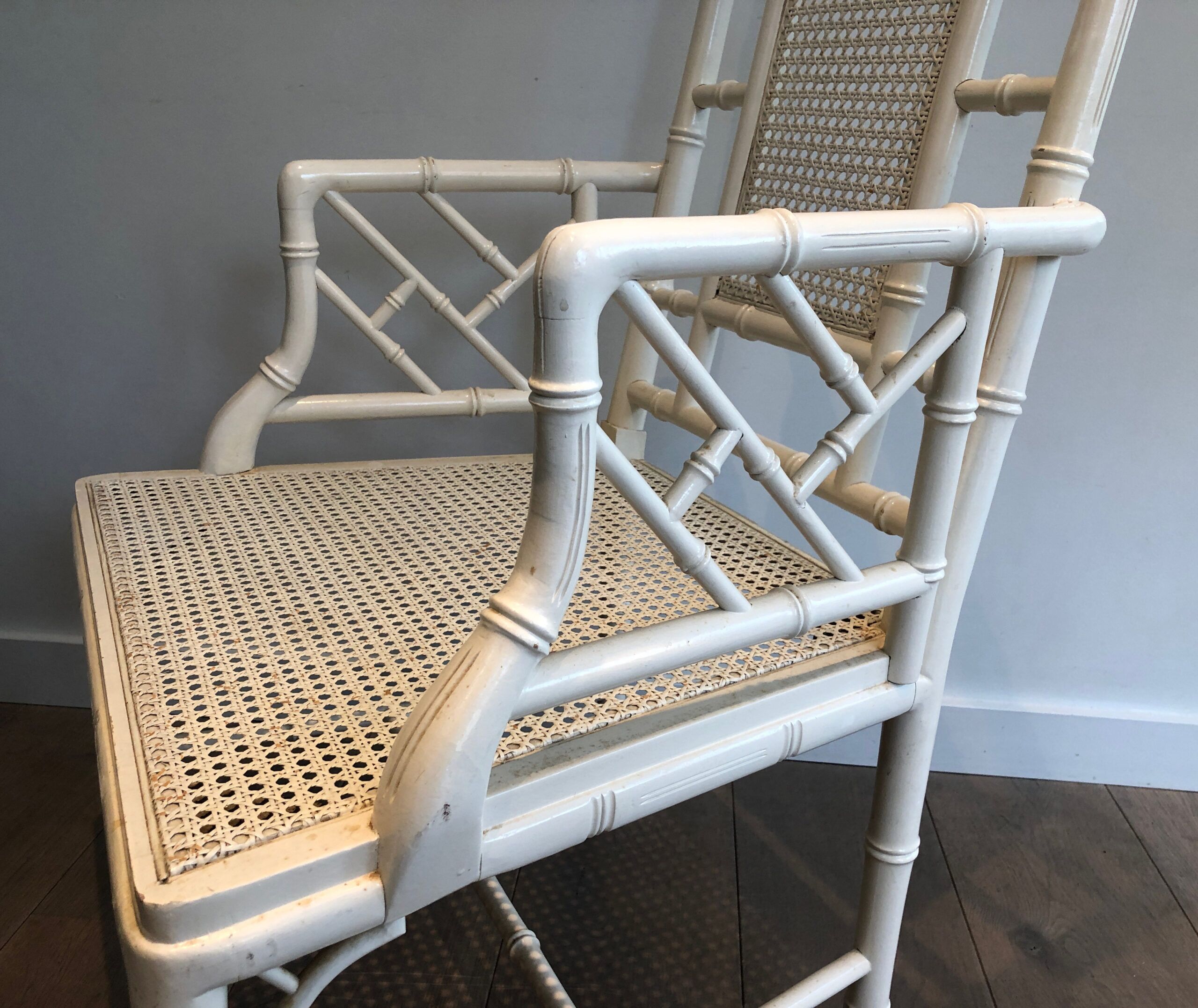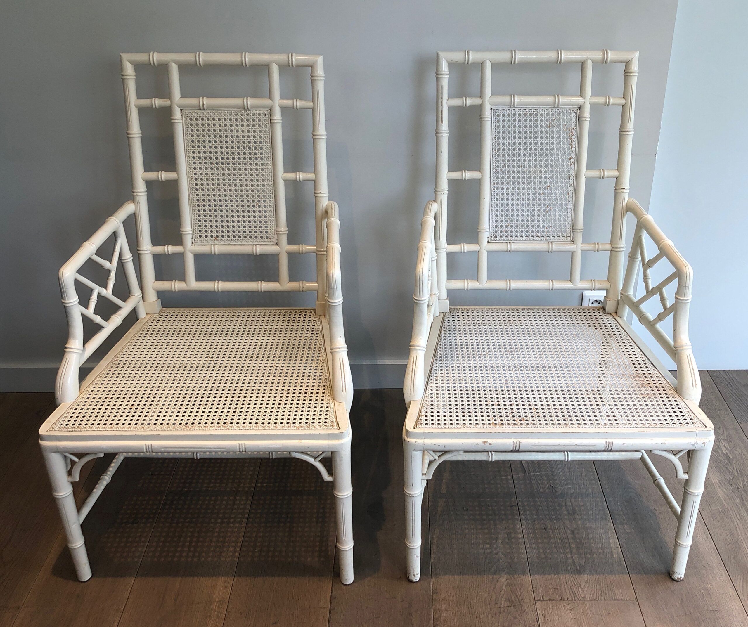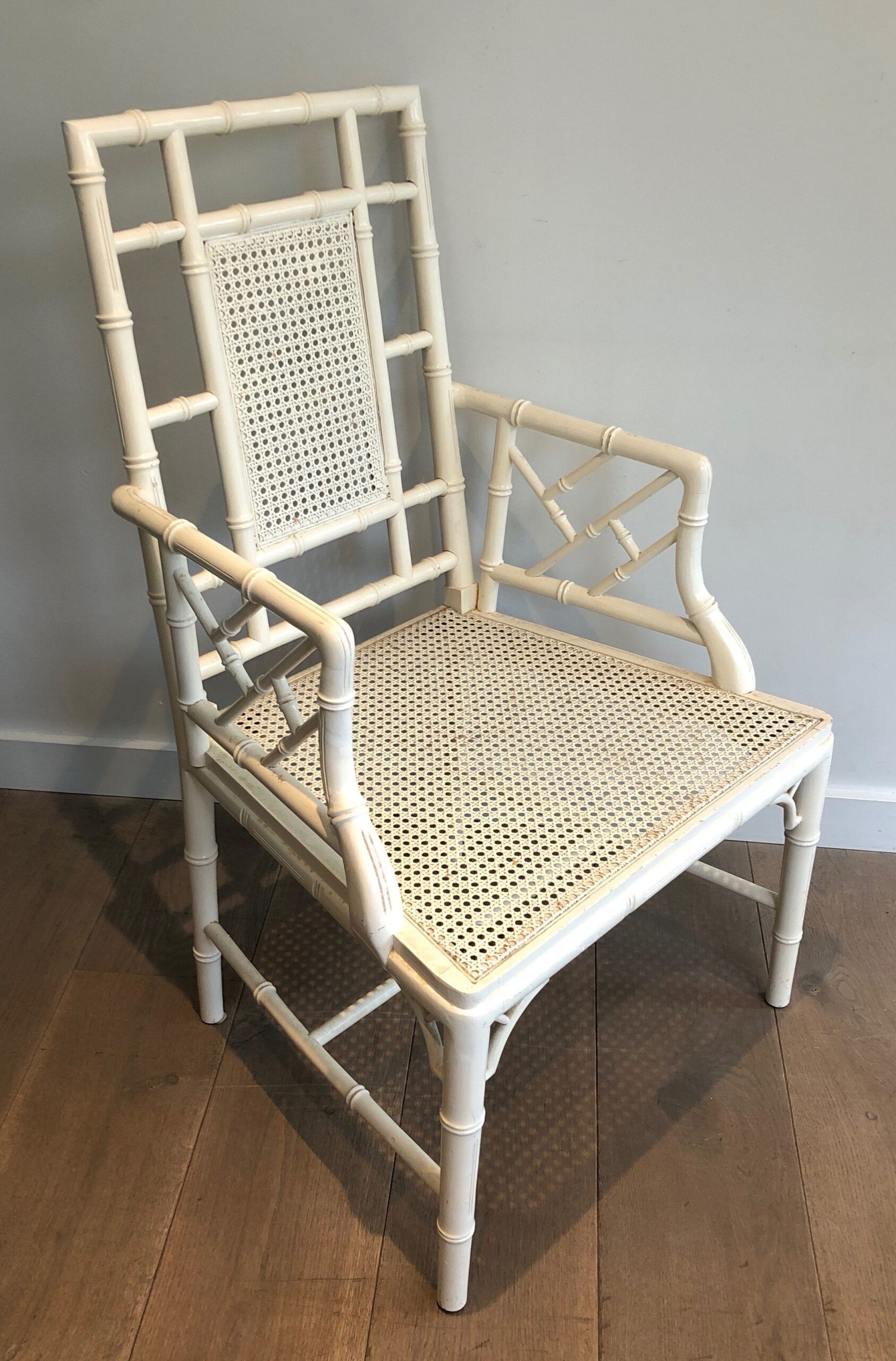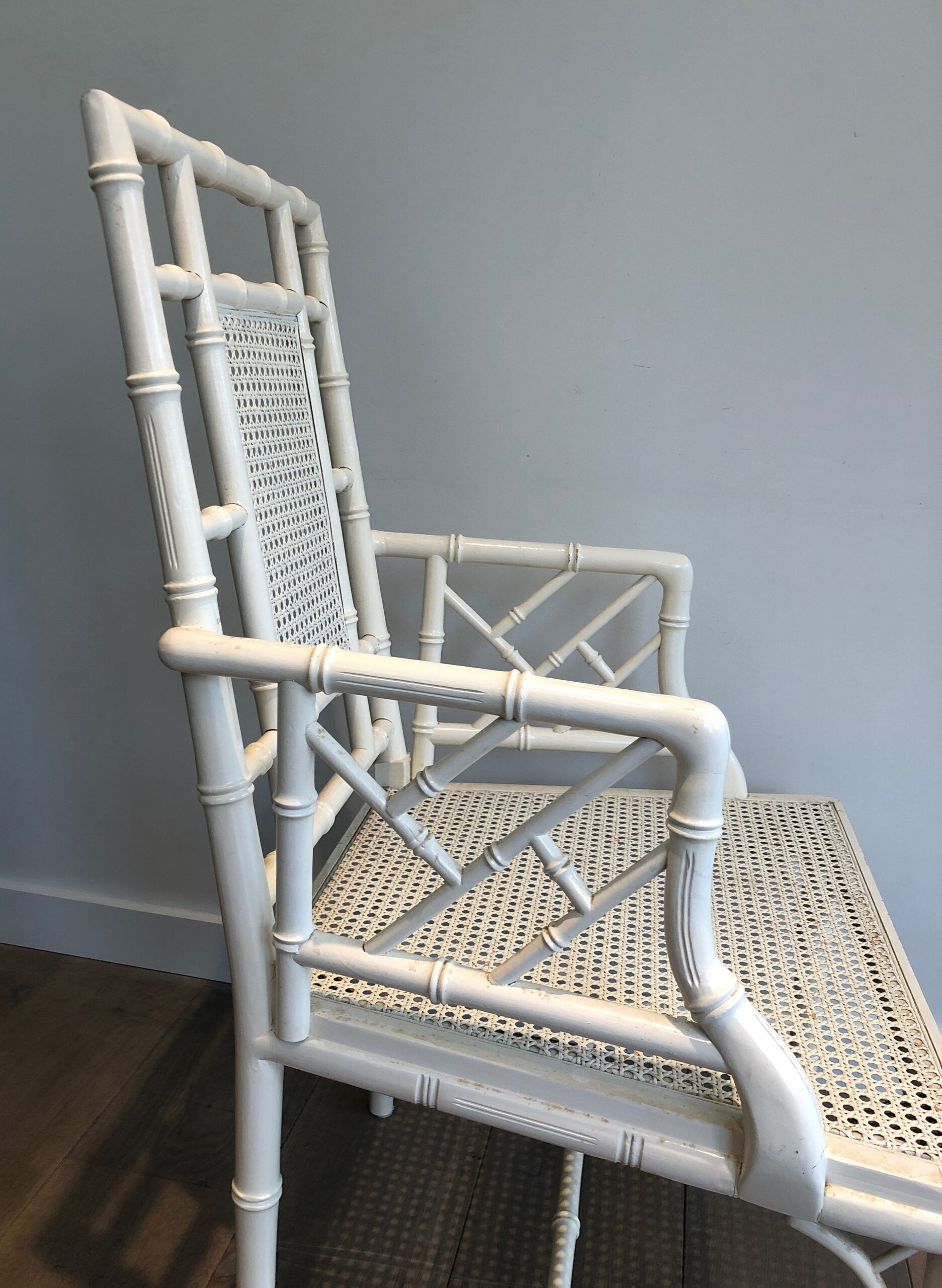 This striking pair of faux-bamboo armchairs showcases elegant craftsmanship in a white lacquered wood finish, reflecting the timeless style of Maison Jansen. French work, crafted circa 1970, these chairs feature a distinctive faux-bamboo design. Adding both charm and sophistication to any interior. The lacquered finish highlights the clean lines and intricate detailing of the frame, while the comfortable seats offer a stylish and functional seating option.