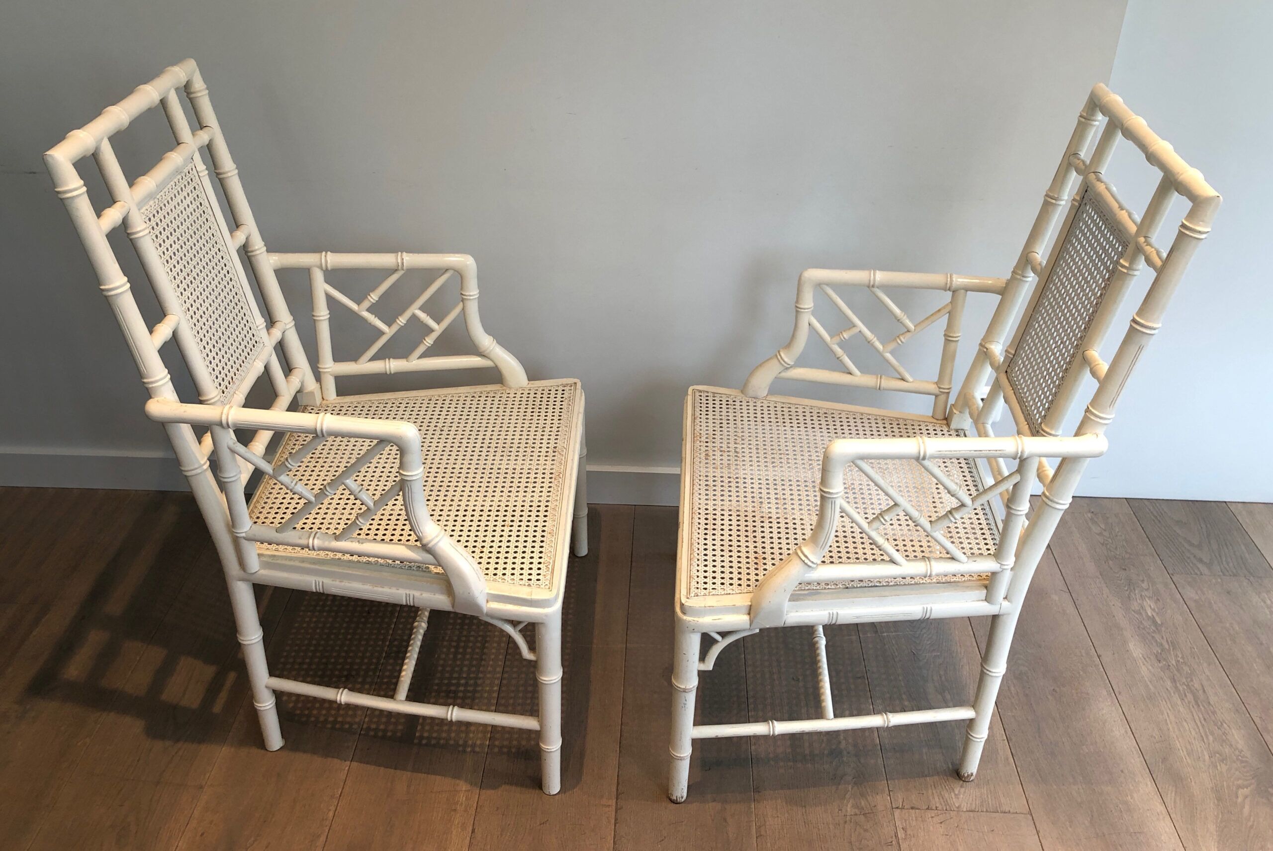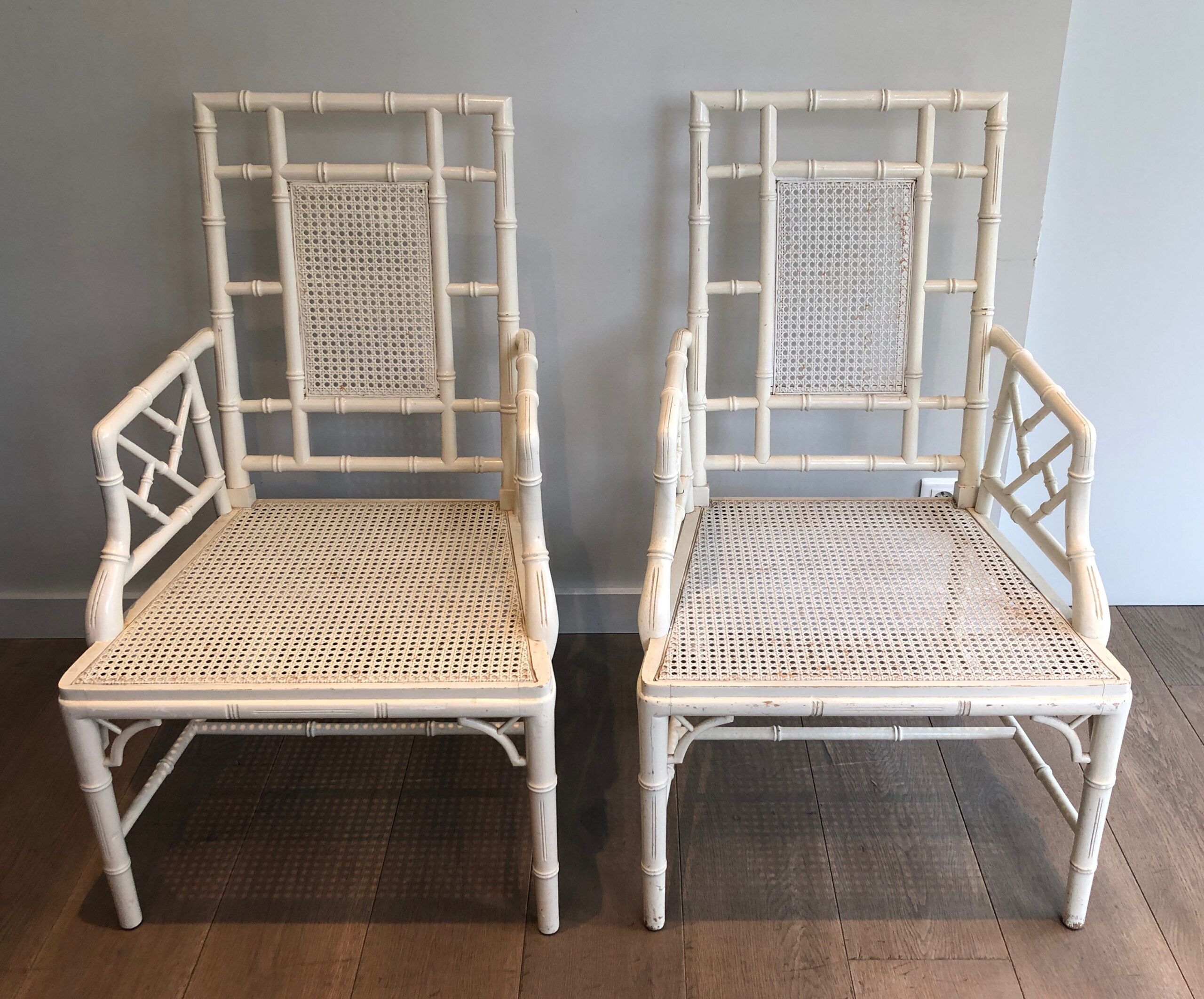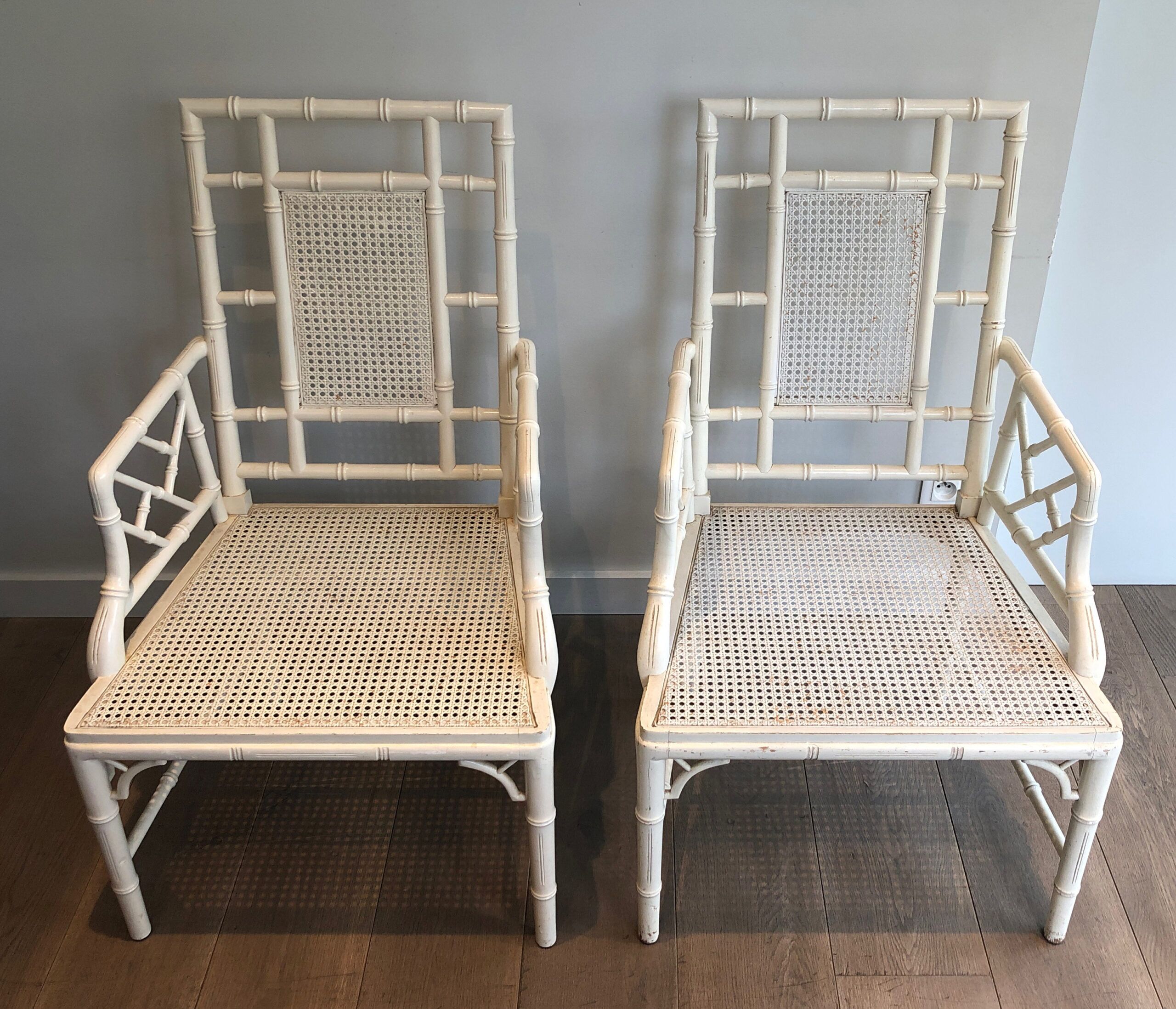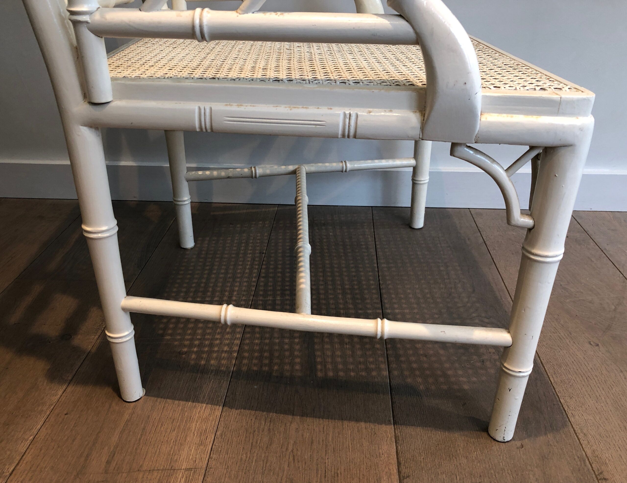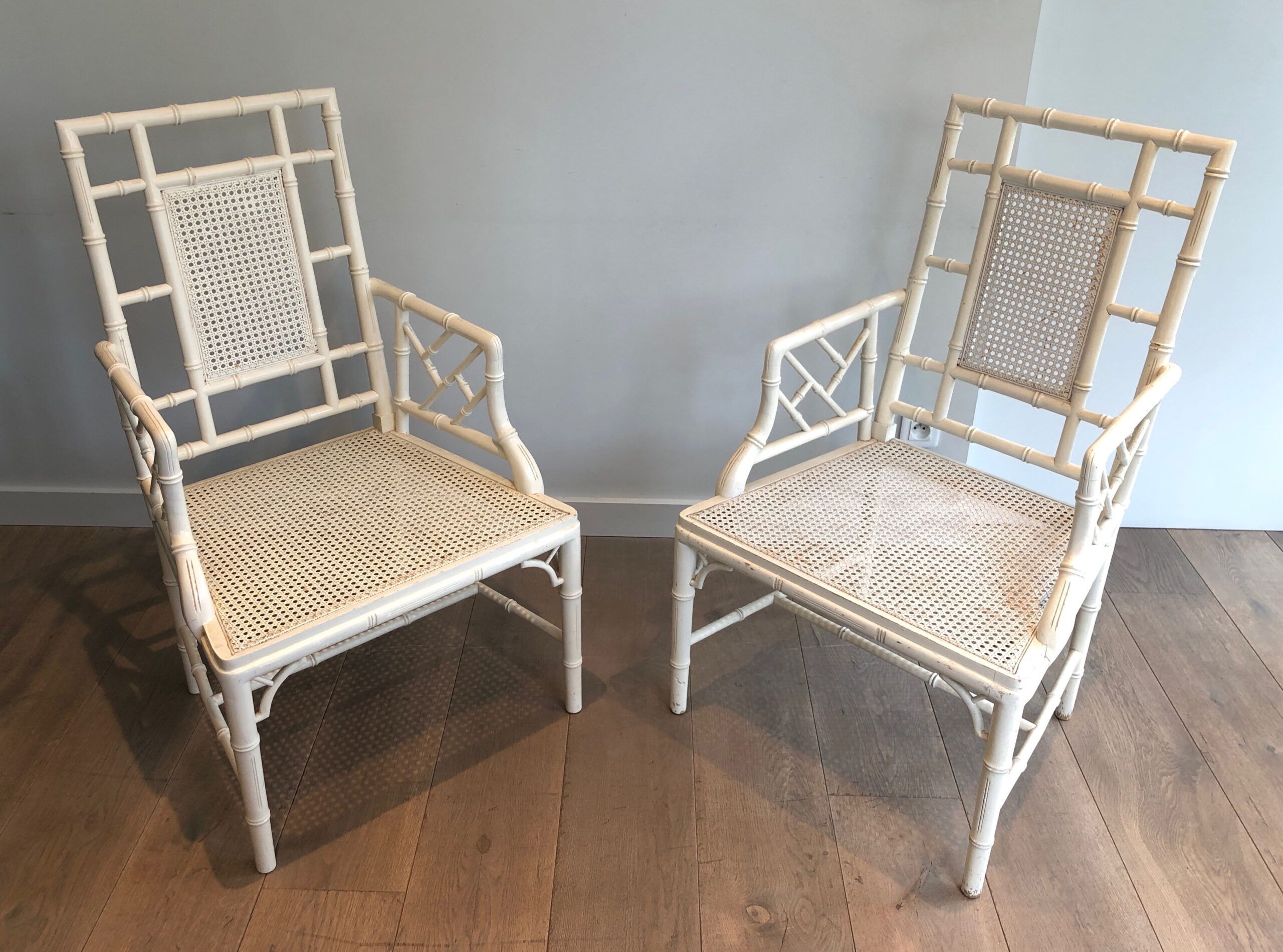 This striking pair of faux-bamboo armchairs showcases elegant craftsmanship in a white lacquered wood finish, reflecting the timeless style of Maison Jansen. French work, crafted circa 1970, these chairs feature a distinctive faux-bamboo design. Adding both charm and sophistication to any interior. The lacquered finish highlights the clean lines and intricate detailing of the frame, while the comfortable seats offer a stylish and functional seating option.