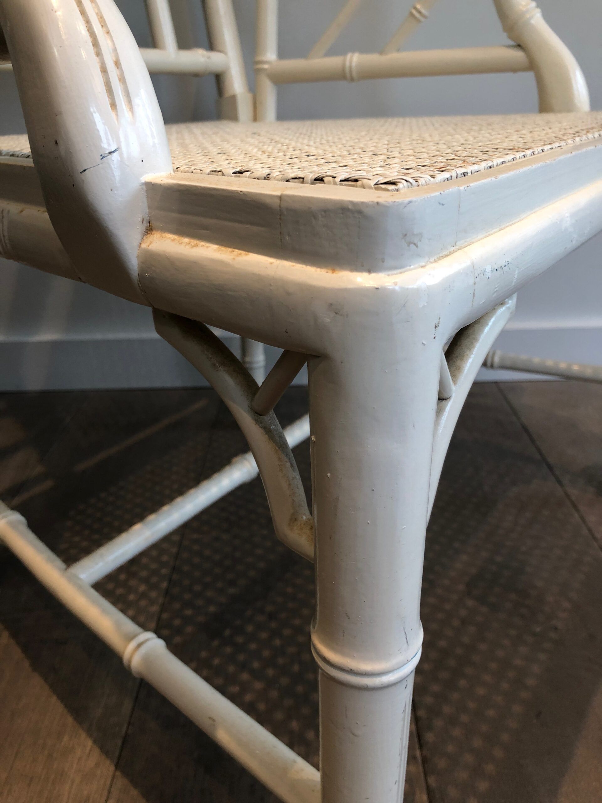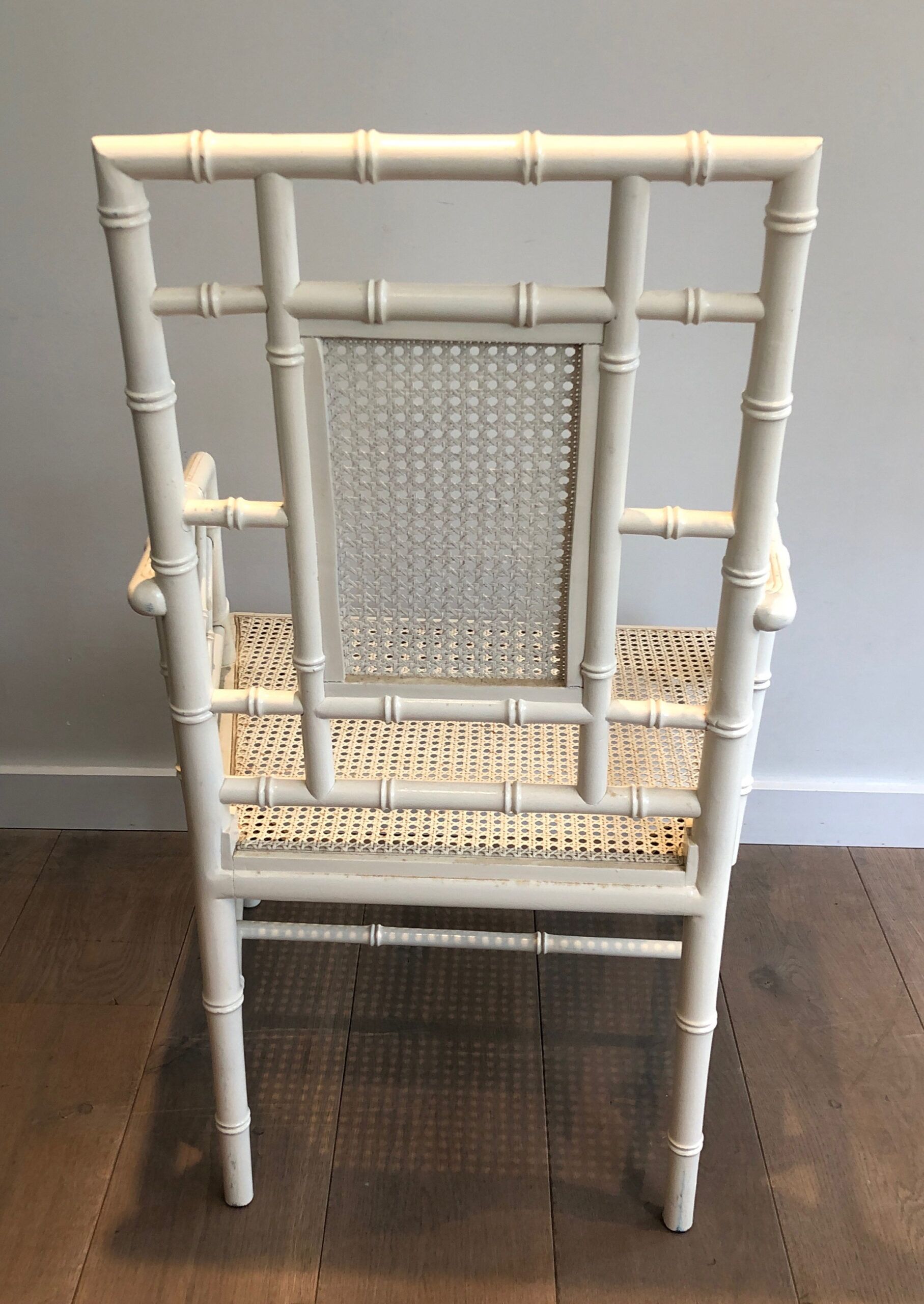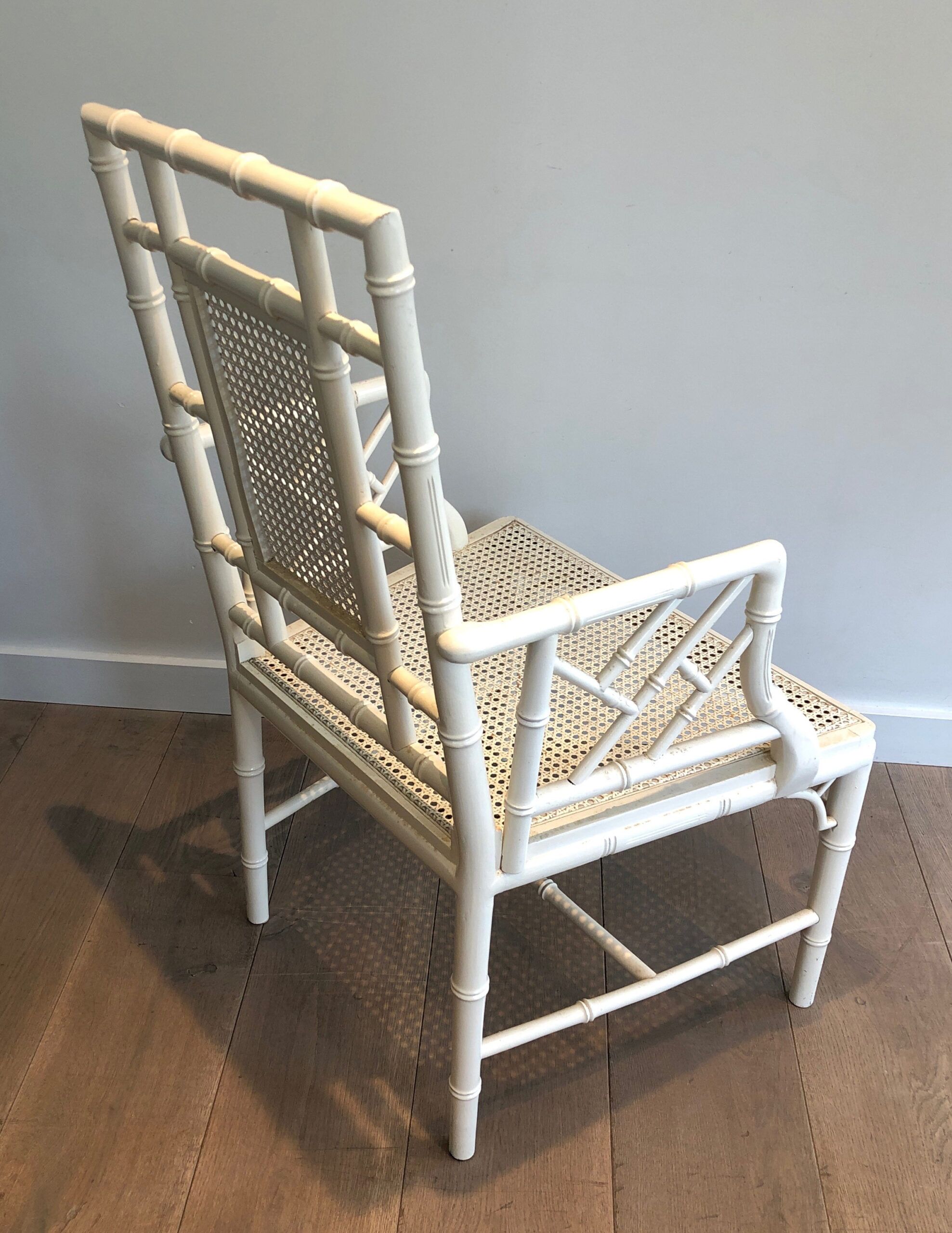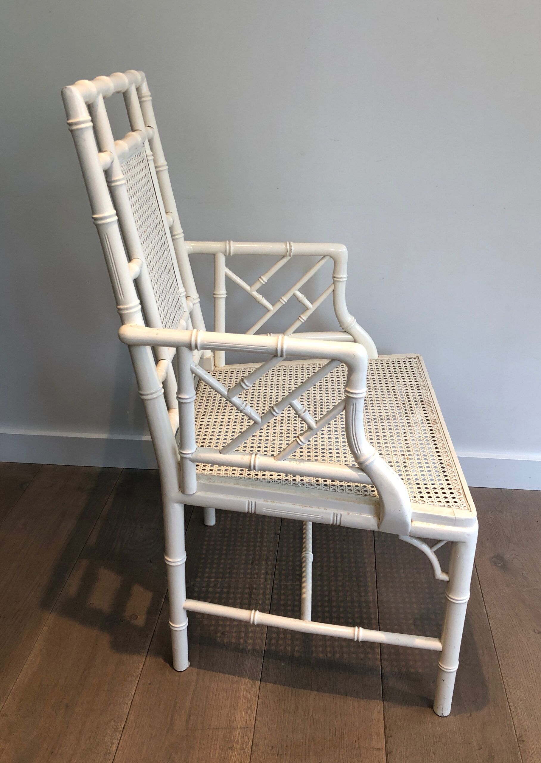 This striking pair of faux-bamboo armchairs showcases elegant craftsmanship in a white lacquered wood finish, reflecting the timeless style of Maison Jansen. French work, crafted circa 1970, these chairs feature a distinctive faux-bamboo design. Adding both charm and sophistication to any interior. The lacquered finish highlights the clean lines and intricate detailing of the frame, while the comfortable seats offer a stylish and functional seating option.