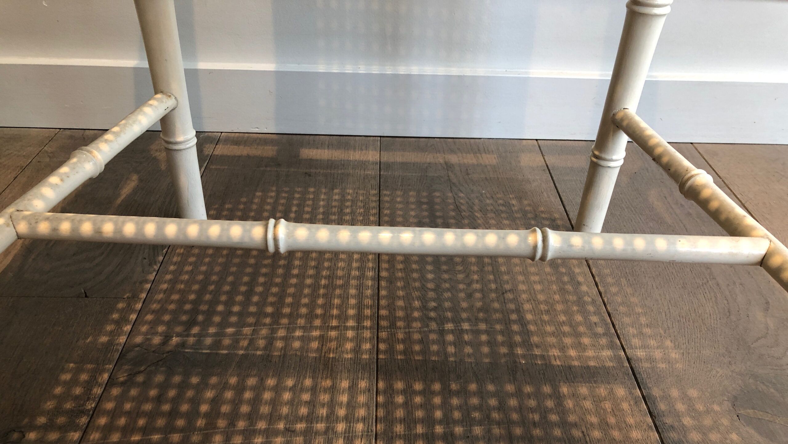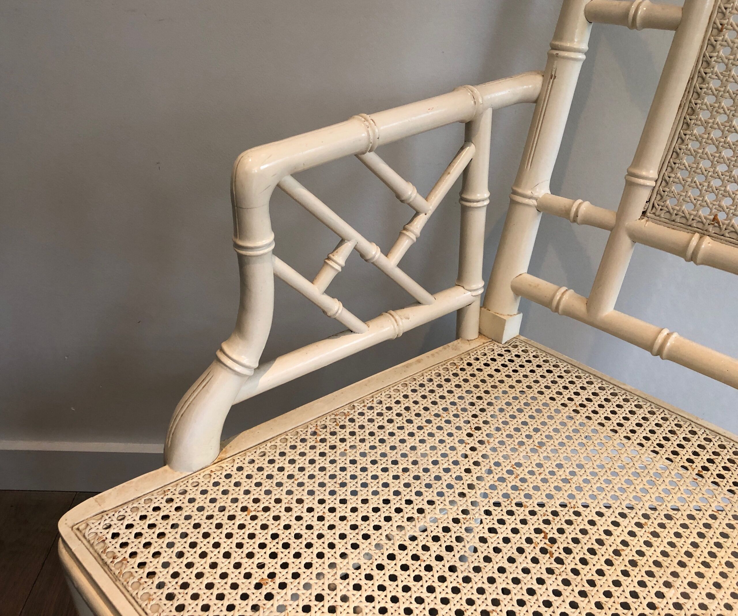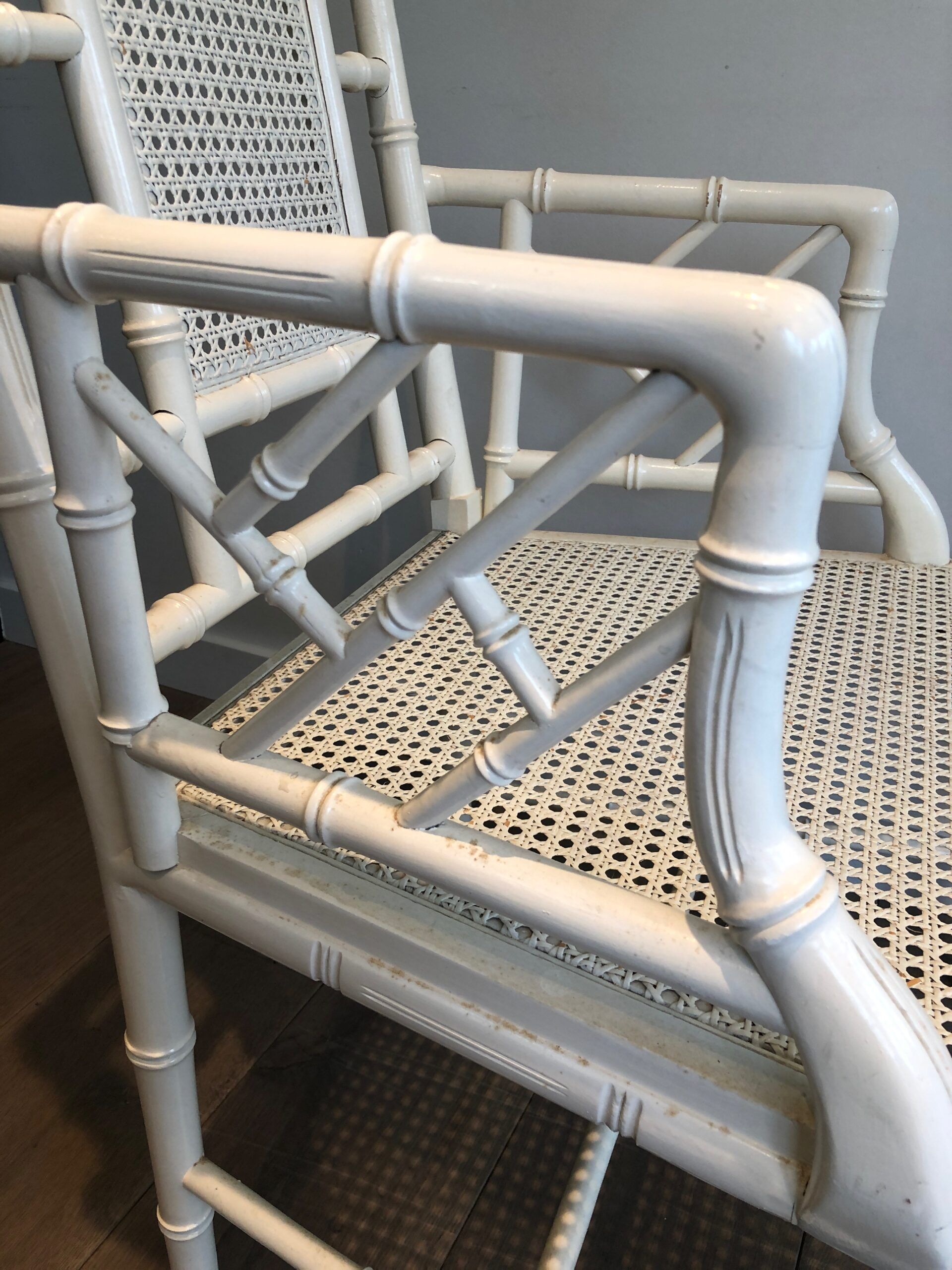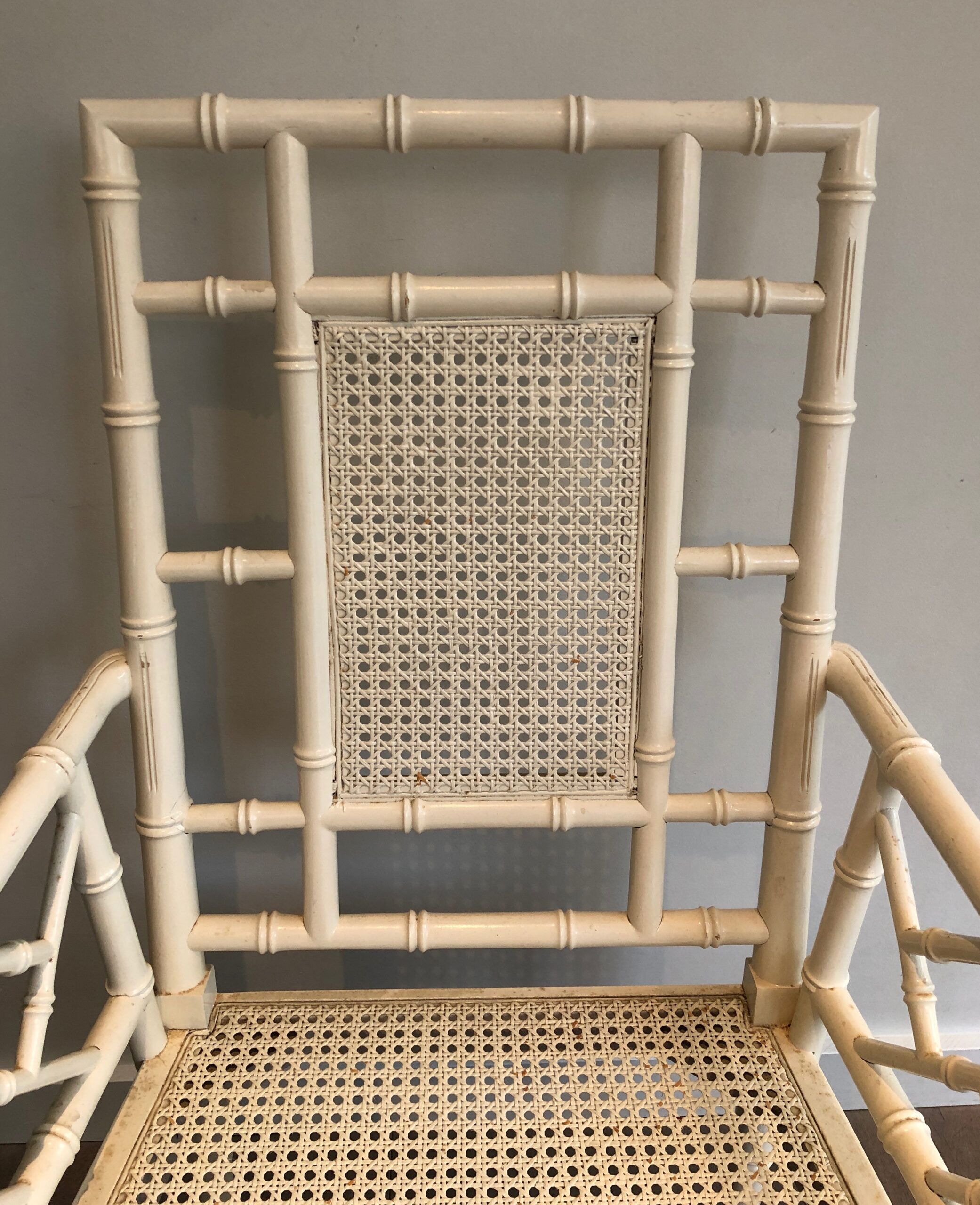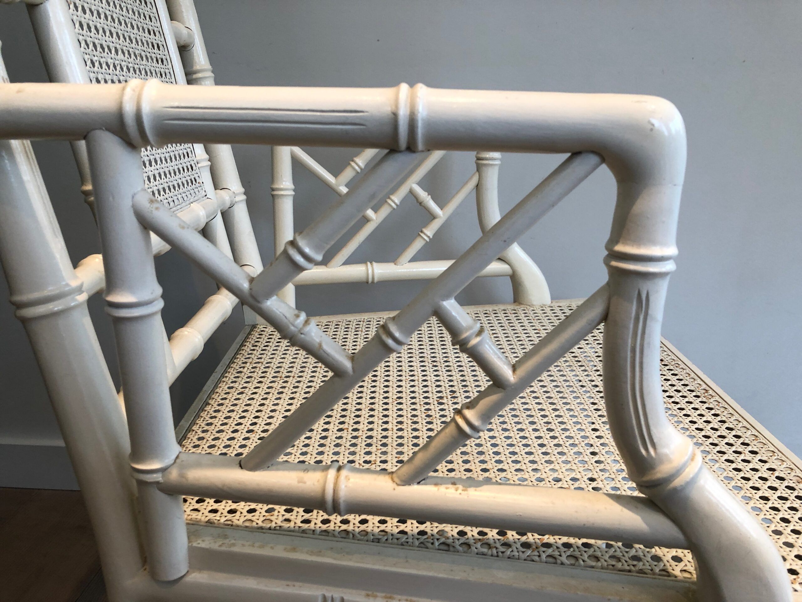This striking pair of faux-bamboo armchairs showcases elegant craftsmanship in a white lacquered wood finish, reflecting the timeless style of Maison Jansen. French work, crafted circa 1970, these chairs feature a distinctive faux-bamboo design. Adding both charm and sophistication to any interior. The lacquered finish highlights the clean lines and intricate detailing of the frame, while the comfortable seats offer a stylish and functional seating option.