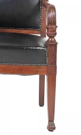 A distinctive design element lies in the small, vase-shaped supports that seamlessly connect the front legs to the armrests—an architectural motif typical of the Empire style, adding both visual interest and structural harmony.