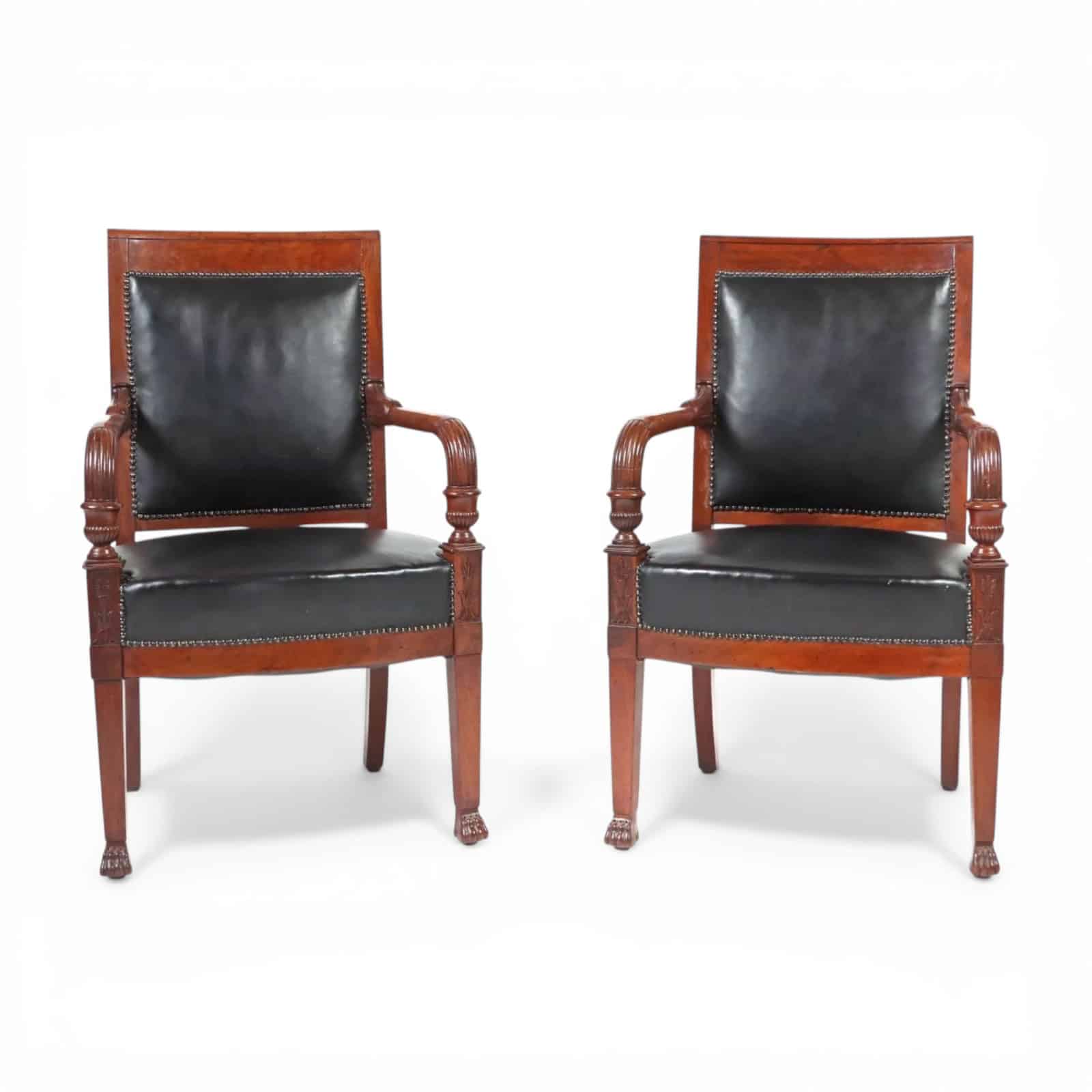 An elegant pair of early 19th-century Empire side chairs from France, showcasing the refined symmetry and neoclassical influence characteristic of the period. Crafted in rich mahogany, these armchairs feature beautifully sculpted armrests and finely carved details throughout.
