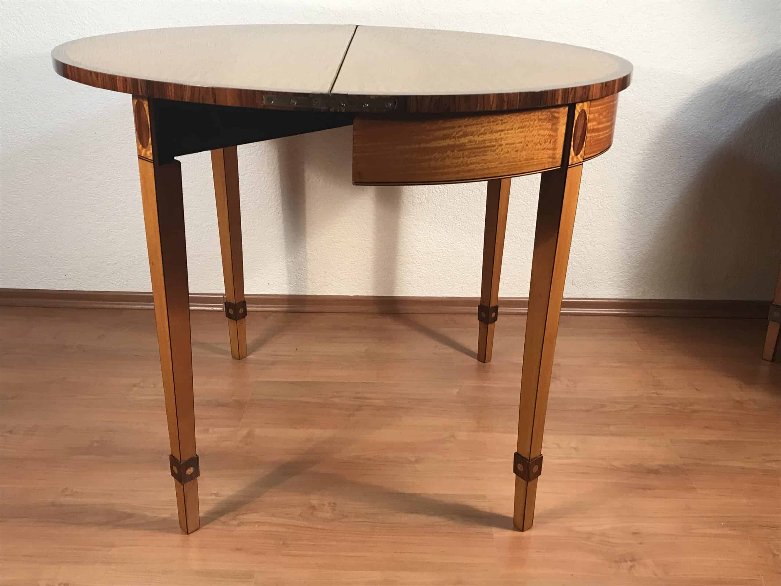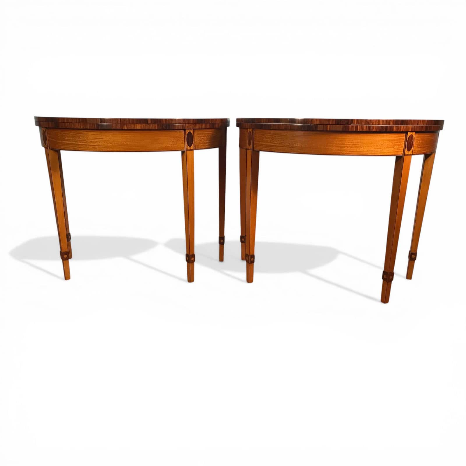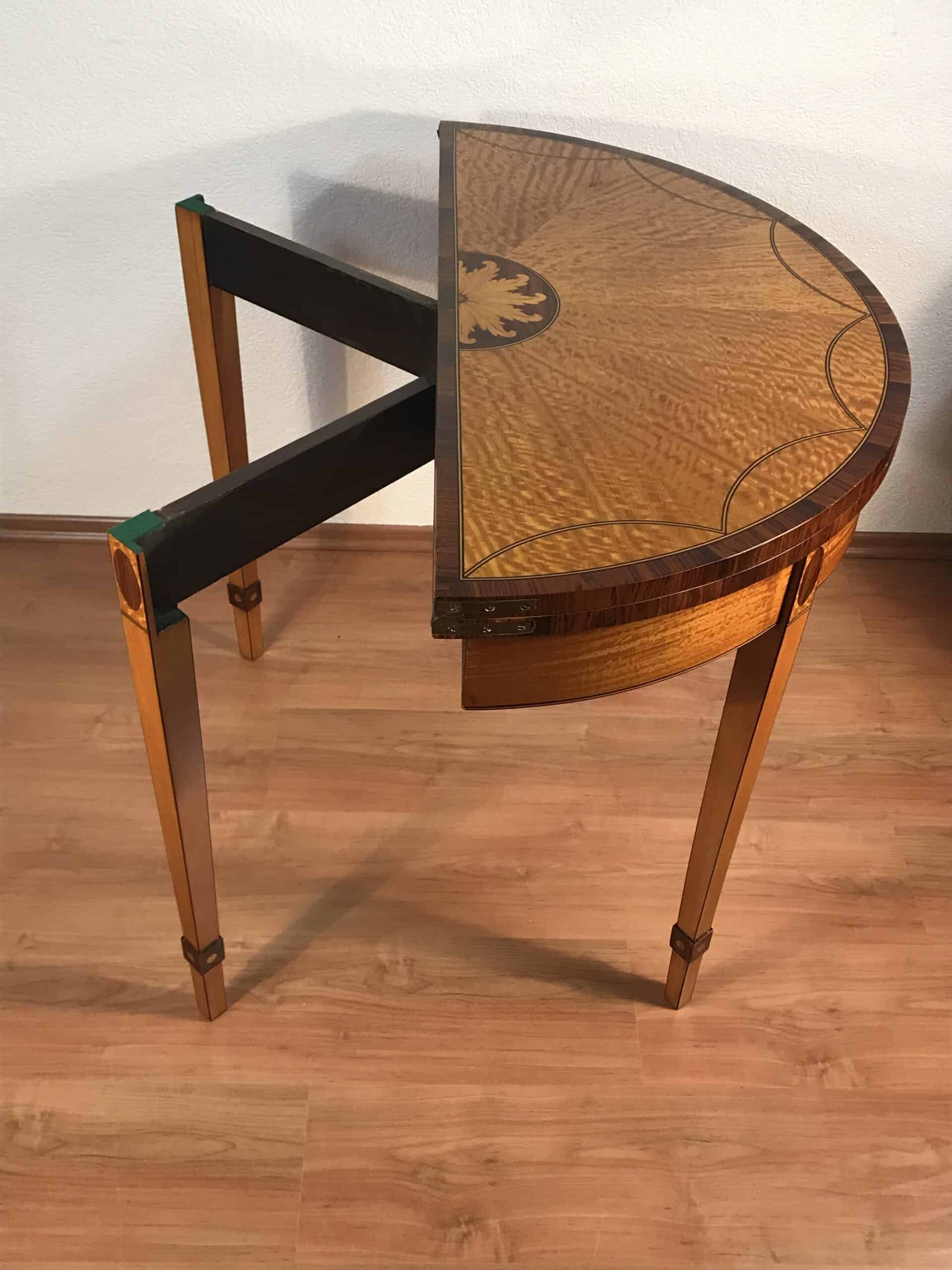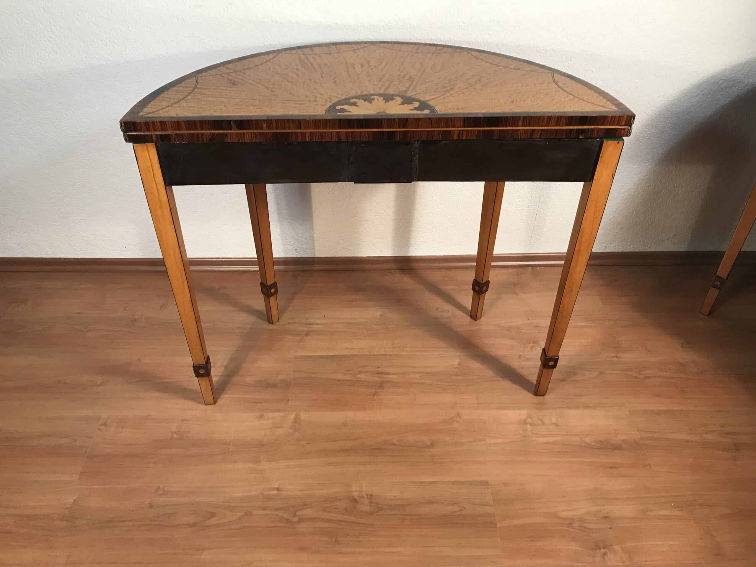 A refined pair of French Neoclassical demi-lune tables, dating to circa 1860, crafted in birch wood with contrasting plum wood veneer and delicate intarsia decoration. Each table features a demi-lune form that opens to reveal a full circular top, supported by elegant fold-out legs—combining practicality with sophisticated design.