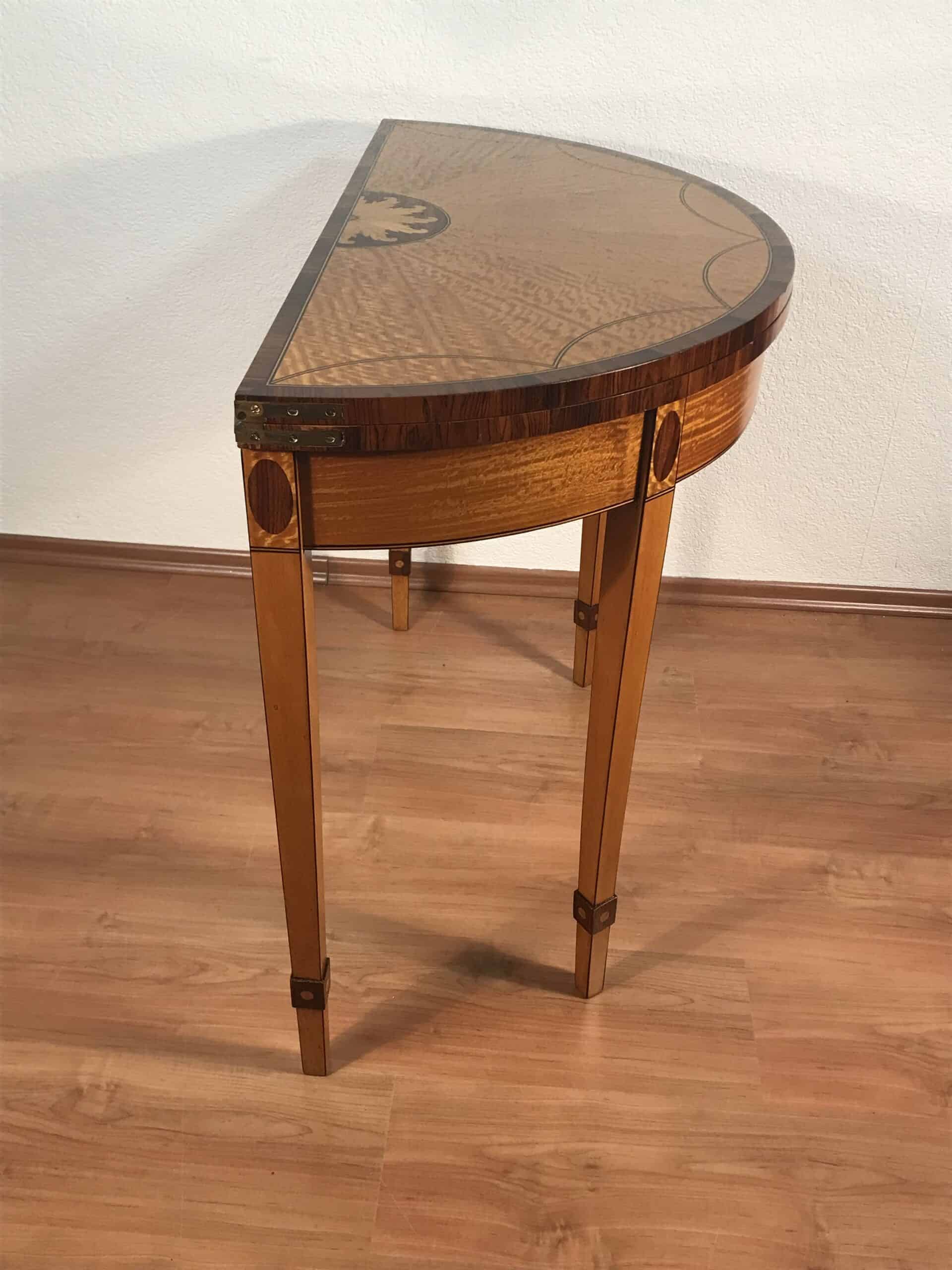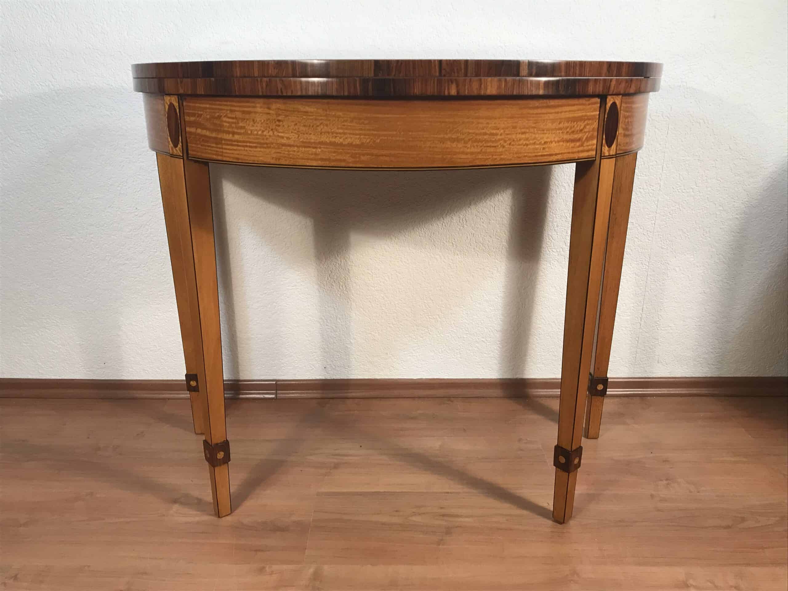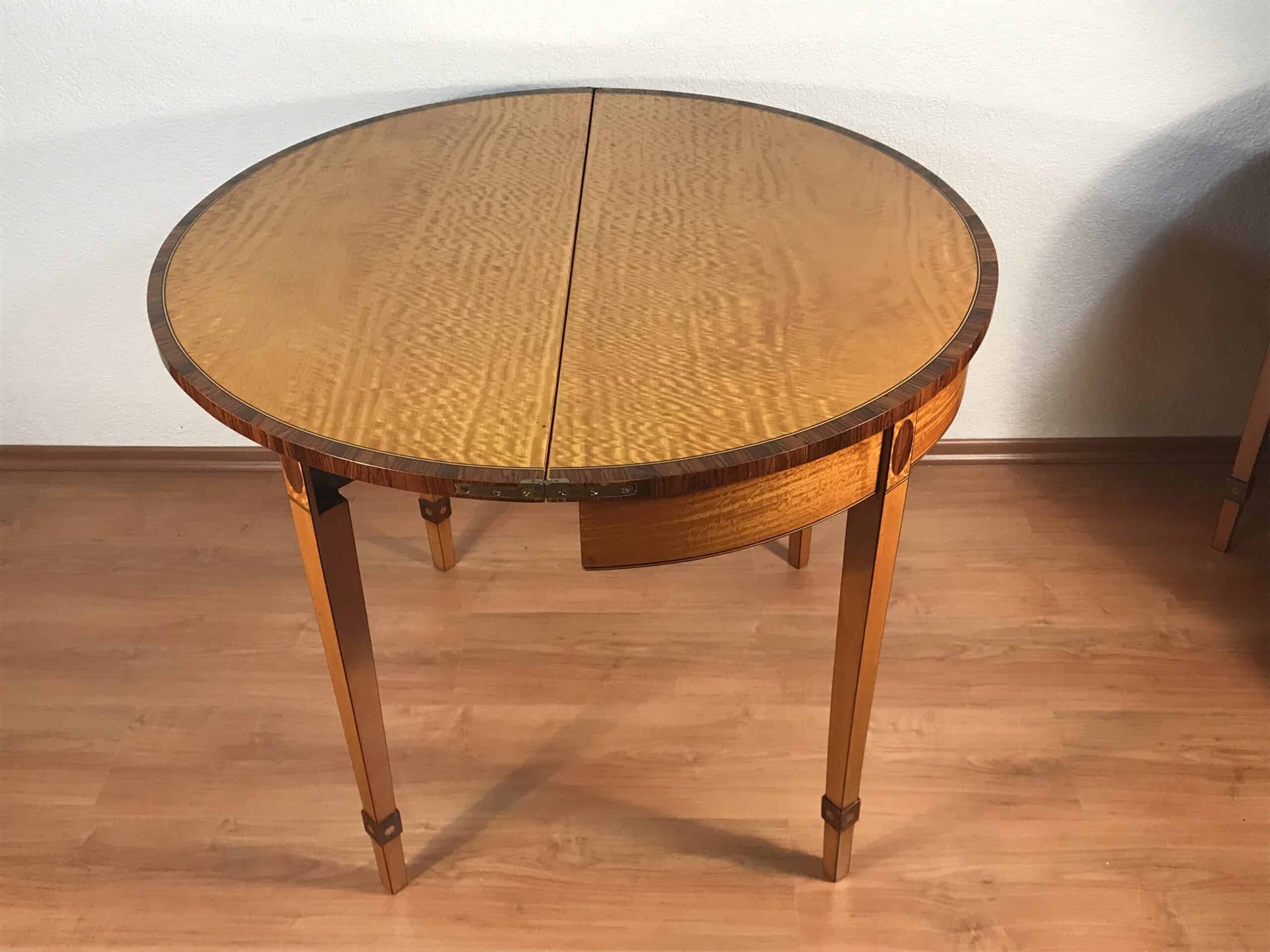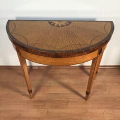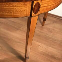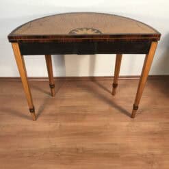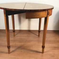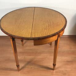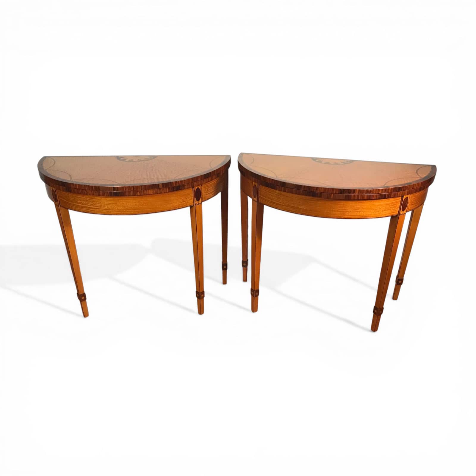 A refined pair of French Neoclassical demi-lune tables, dating to circa 1860, crafted in birch wood with contrasting plum wood veneer and delicate intarsia decoration. Each table features a demi-lune form that opens to reveal a full circular top, supported by elegant fold-out legs—combining practicality with sophisticated design.