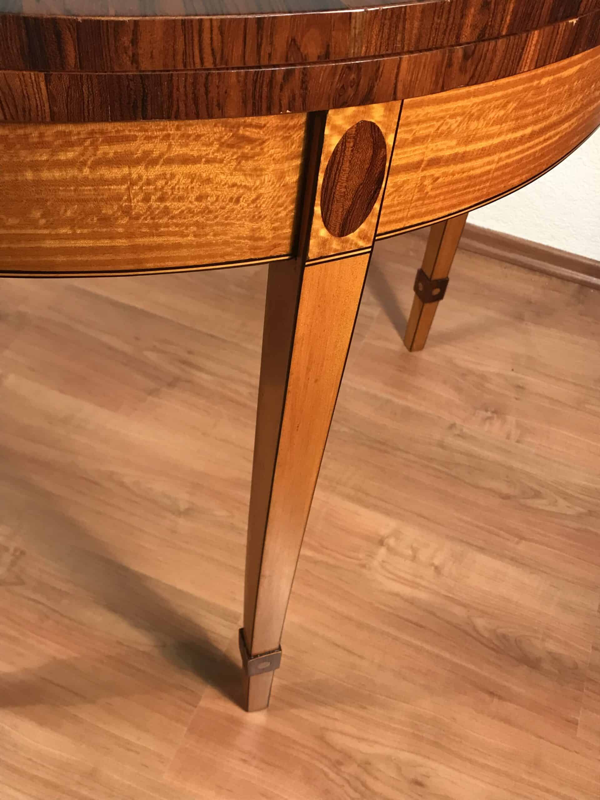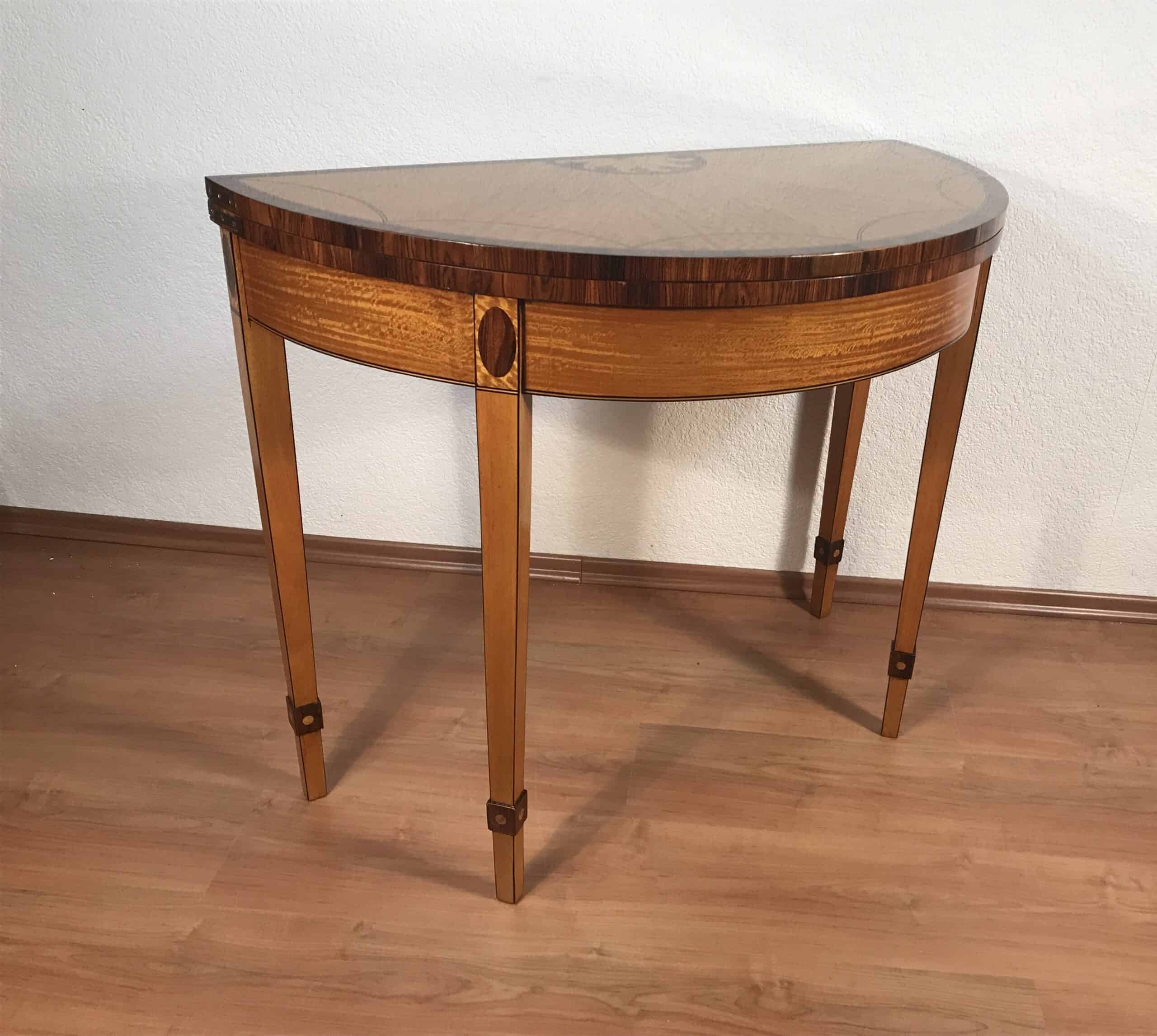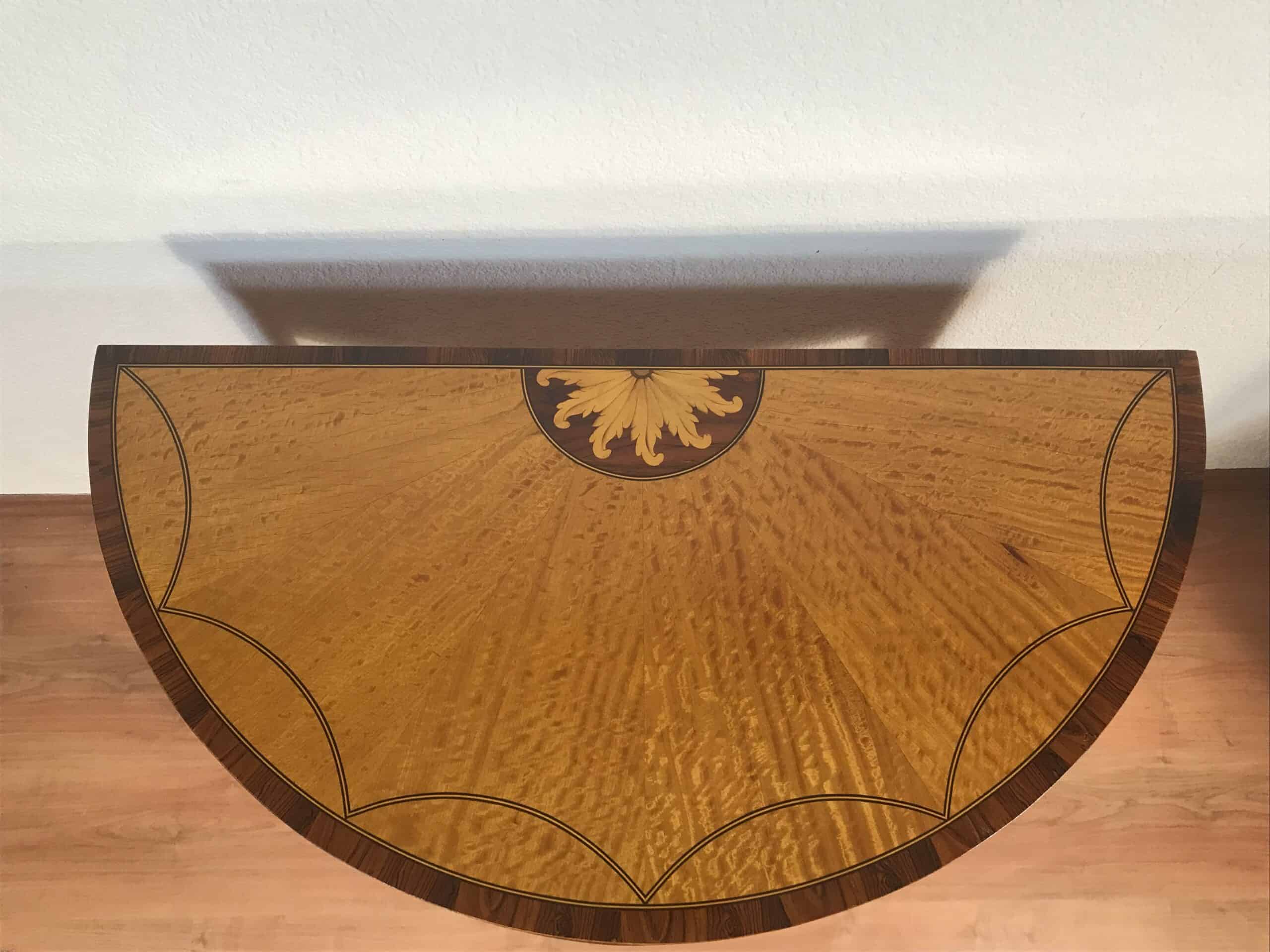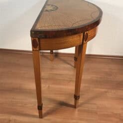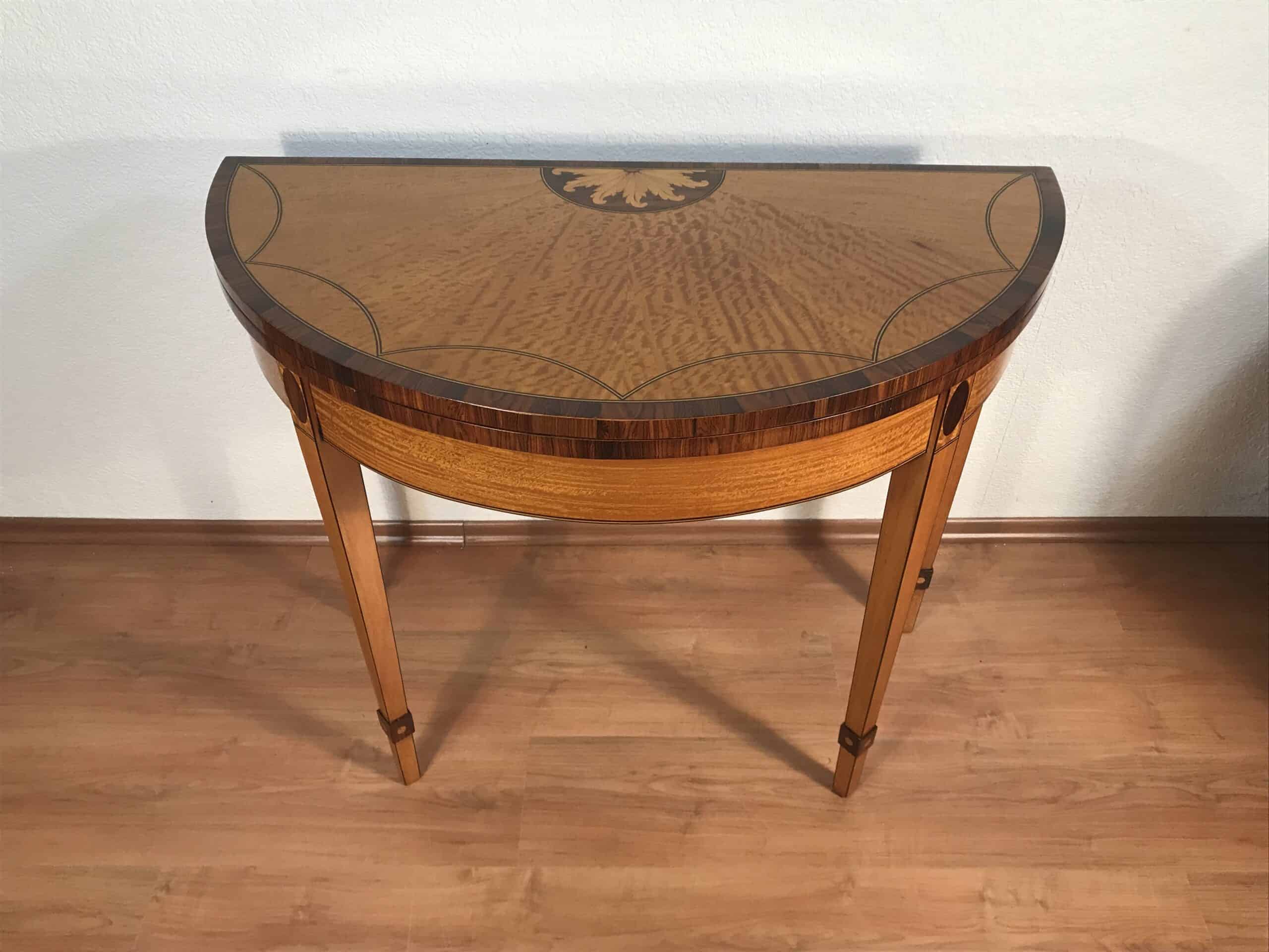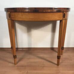 A refined pair of French Neoclassical demi-lune tables, dating to circa 1860, crafted in birch wood with contrasting plum wood veneer and delicate intarsia decoration. Each table features a demi-lune form that opens to reveal a full circular top, supported by elegant fold-out legs—combining practicality with sophisticated design.