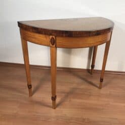 Pair of French Neoclassical Demi-Lune Tables, c.1860 in Birch & Plum Wood with Inlay