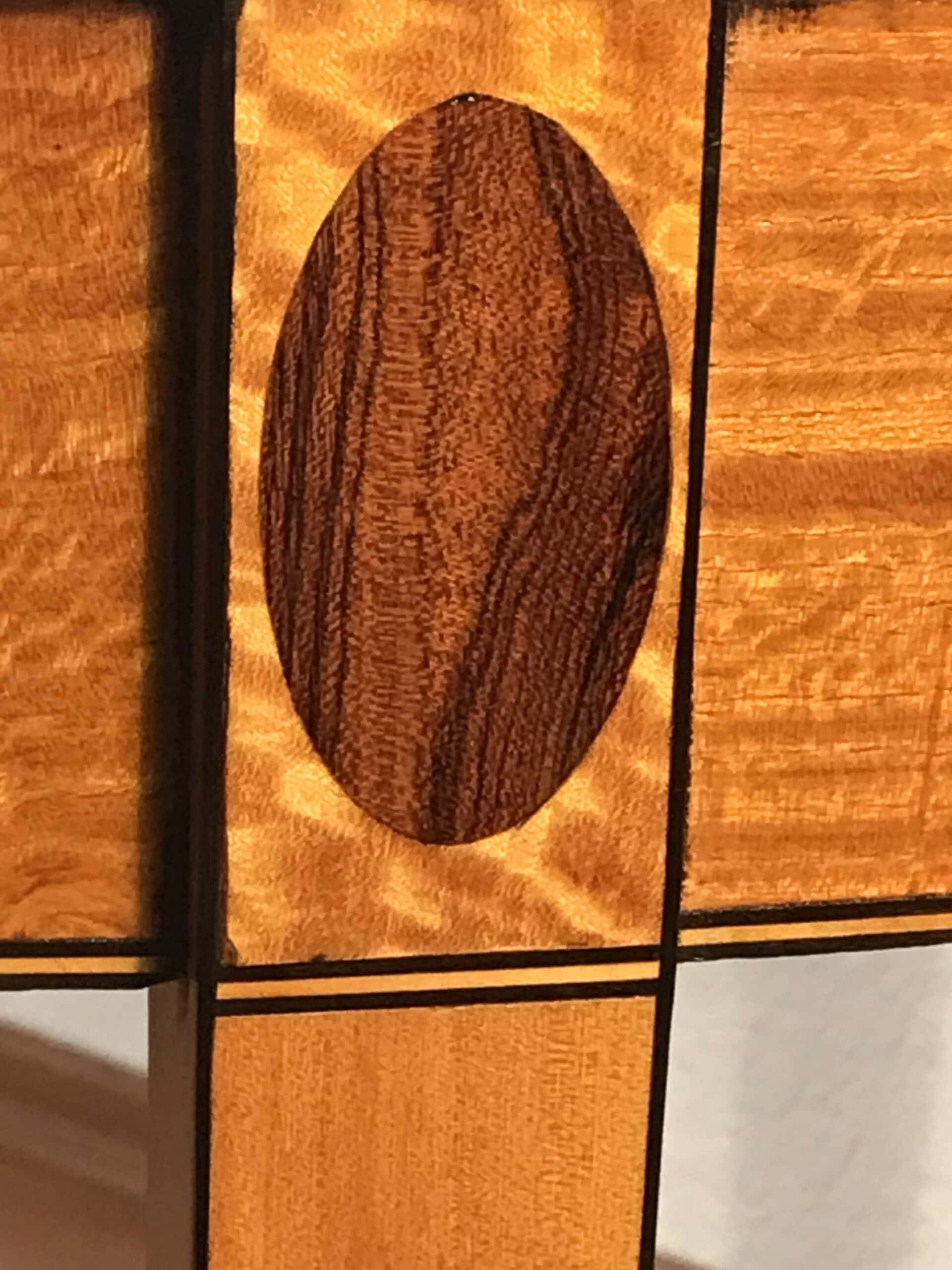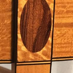 The exterior showcases finely executed acanthus leaf inlay in center back part of the top, complemented by intricate thread inlay patterns that highlight the craftsmanship. The contrast between the pale birch and the deeper tones of plum wood lends visual depth and a distinctive decorative character.