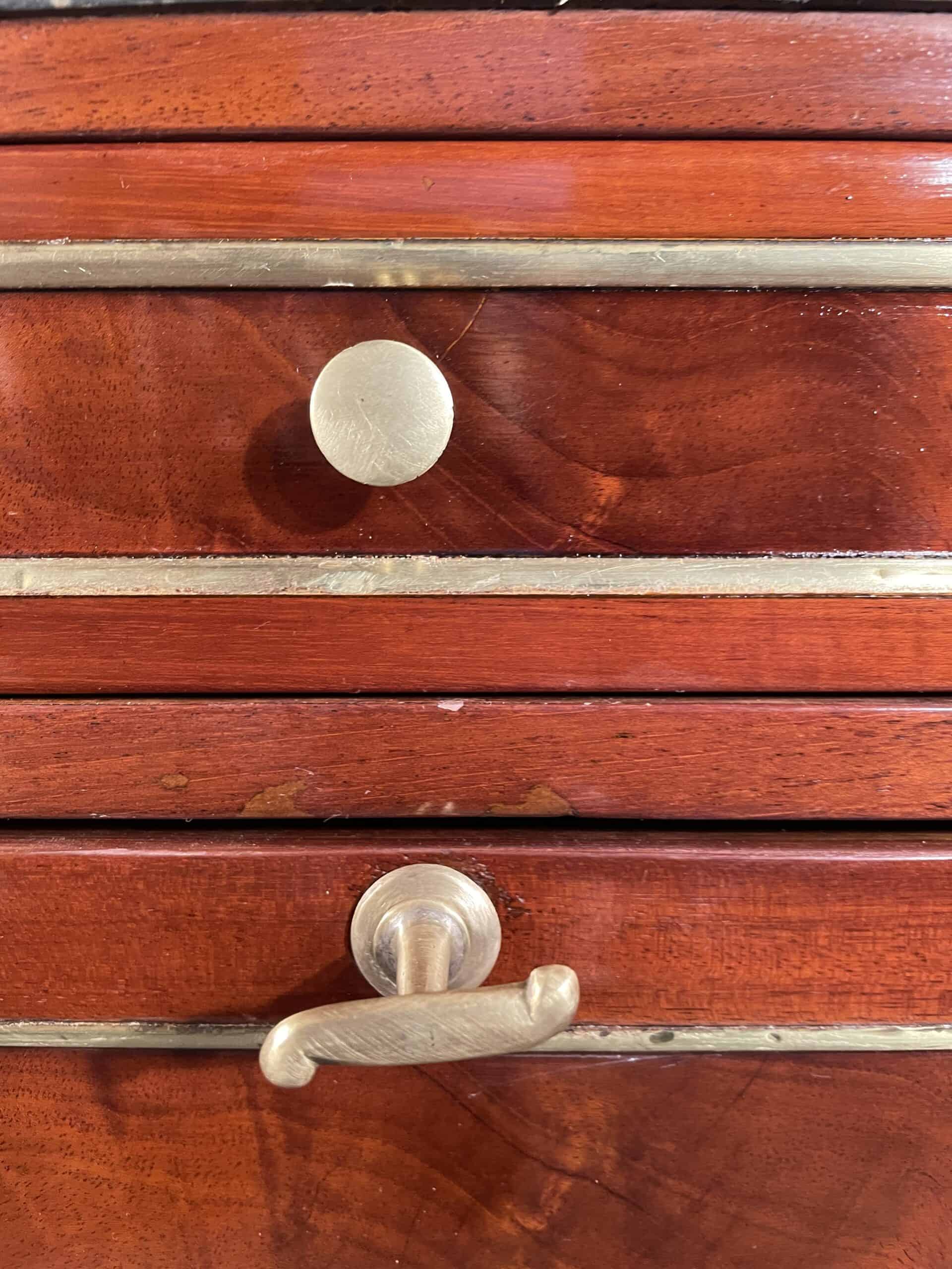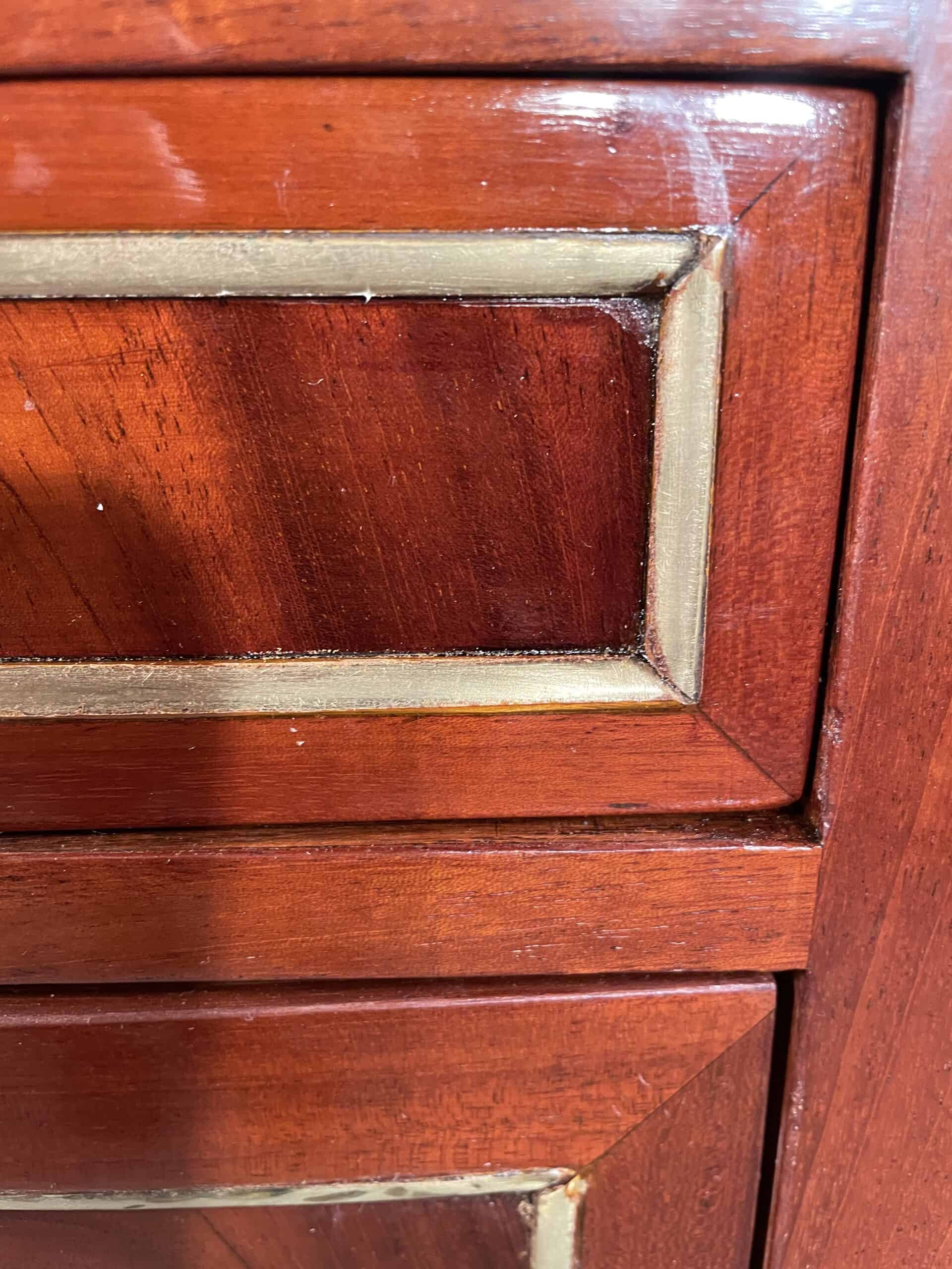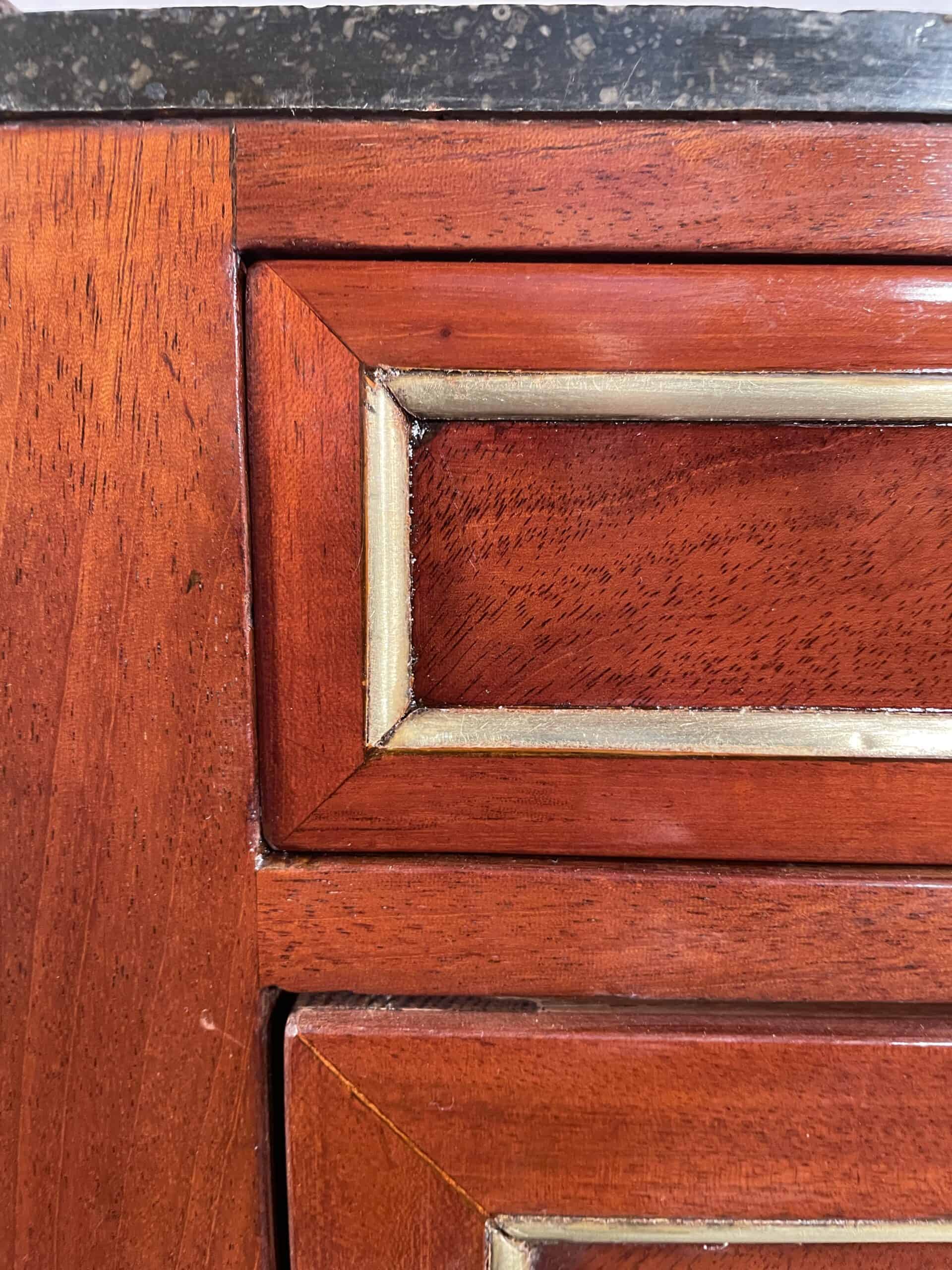 Adorned with captivating veneer decor on all sides, these nightstands boast brass bands on the front and retain their original bronze fittings, adding to their authenticity and charm.