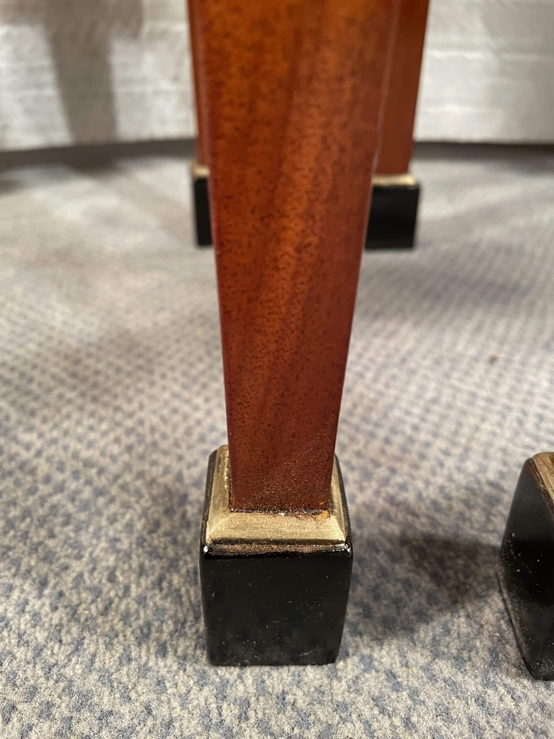 These exquisite side tables exude timeless charm, standing gracefully on slender legs while showcasing the allure of mahogany veneer and lustrous dark marble tops.