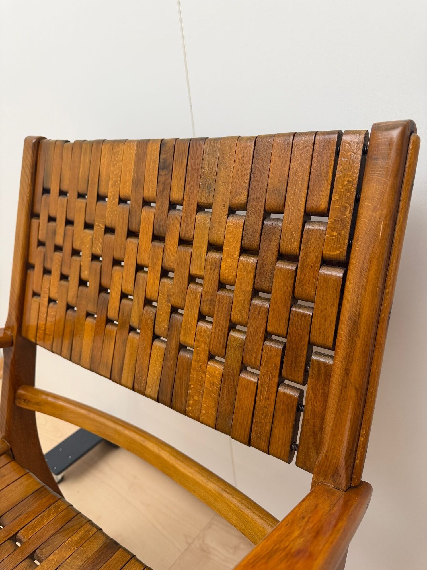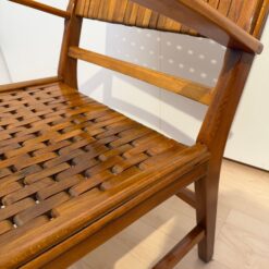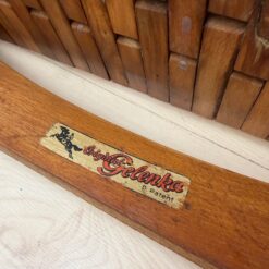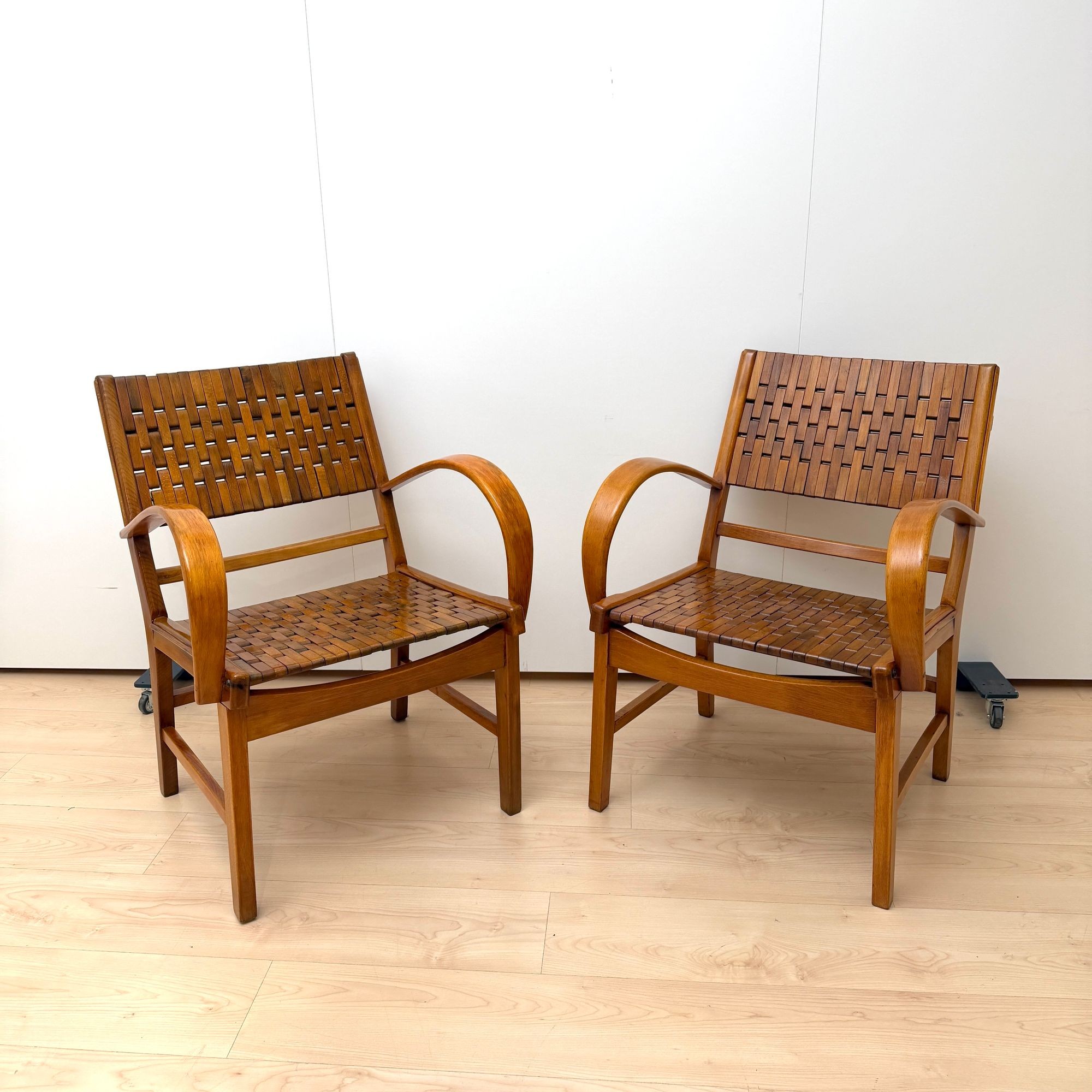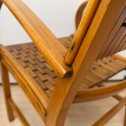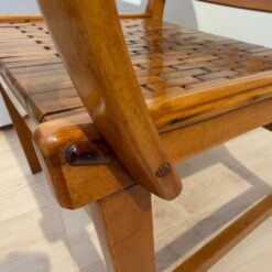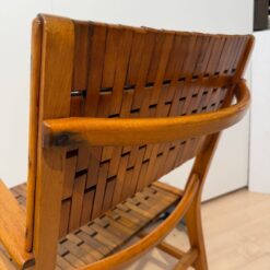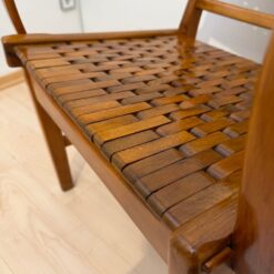The seats are constructed with elastic straps and solid beechwood elements, offering comfort and durability. Professionally restored, the chairs retain a beautiful original patina consistent with age and use.