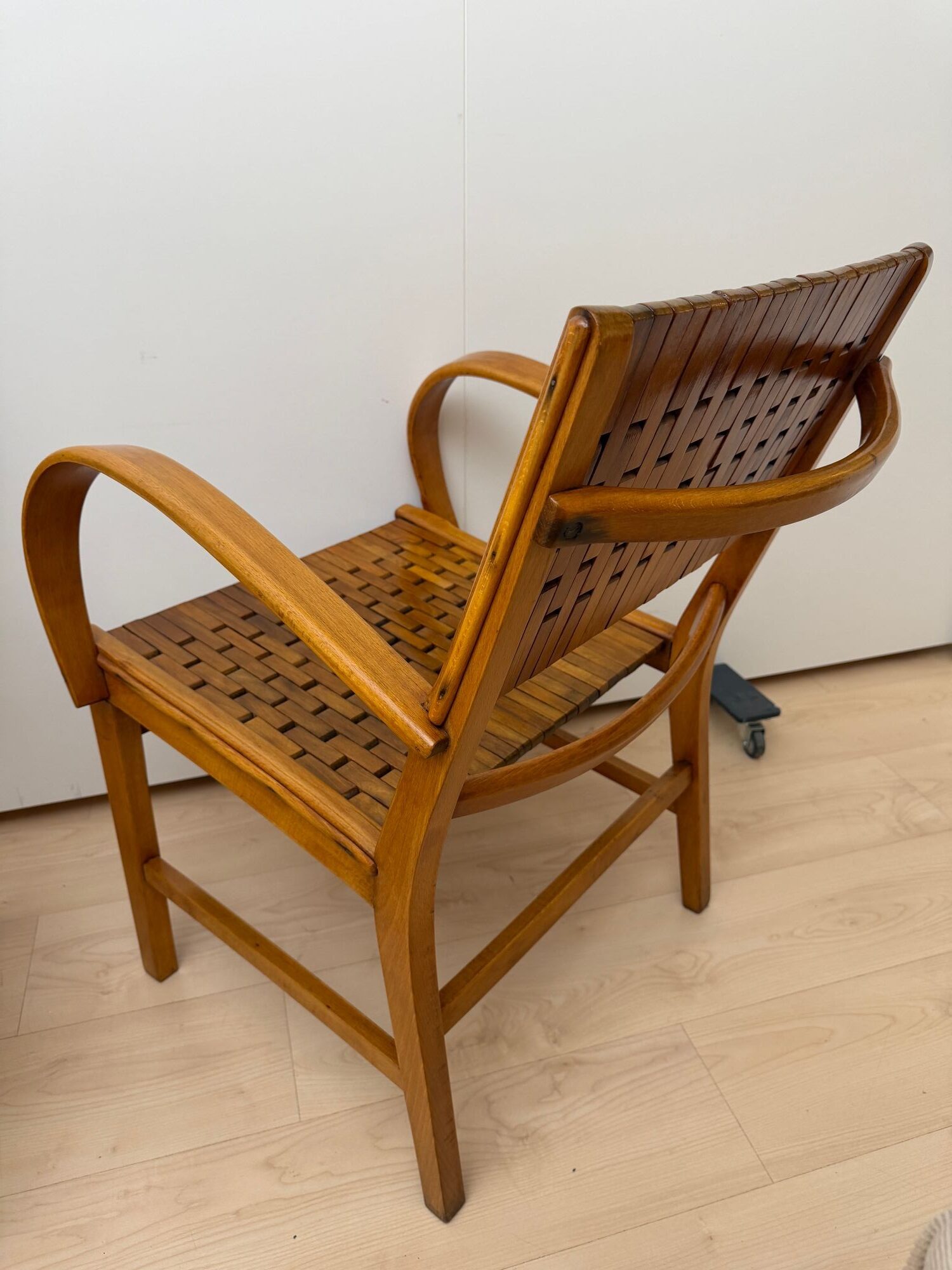 Striking pair of German midcentury armchairs by Gelenka-Patentmöbelfabrik, featuring sculptural curved beechwood armrests and elegant proportions. Designed in the late 1940s–1950s and attributed to Ernst Breitenborn and/or Erich Dieckmann, these chairs exemplify Gelenka’s refined bentwood craftsmanship.
