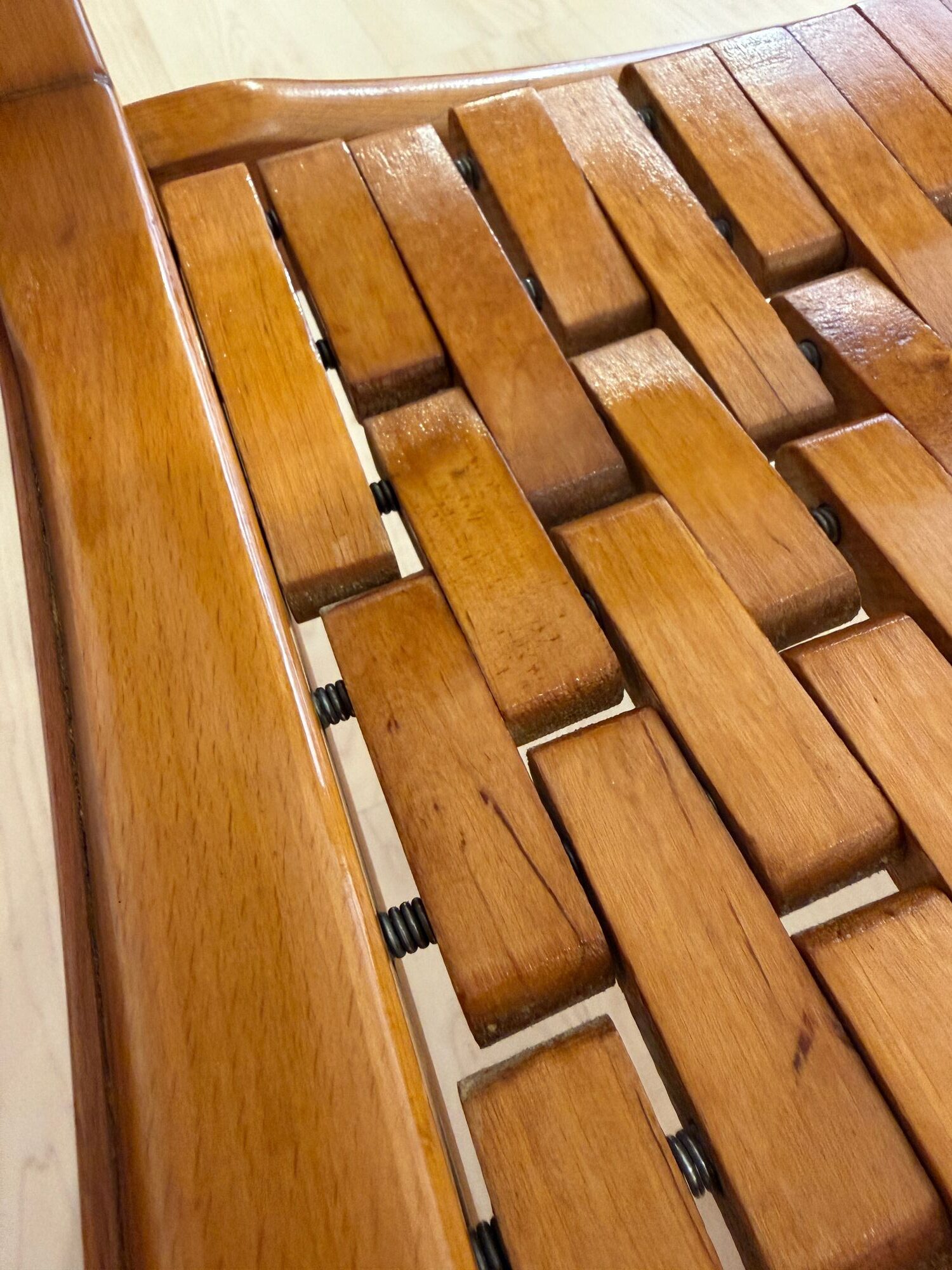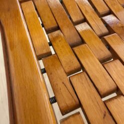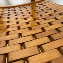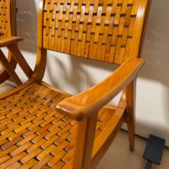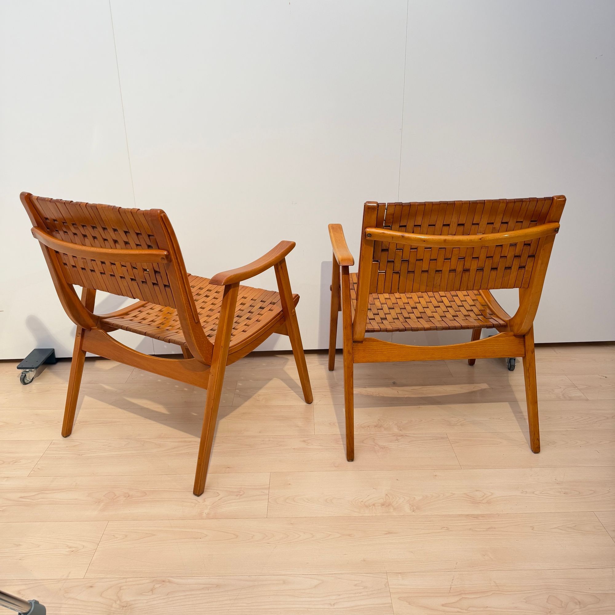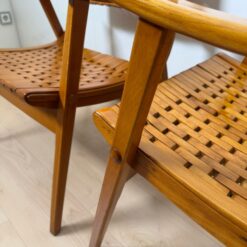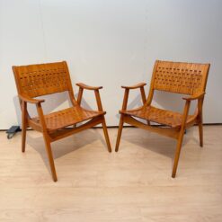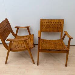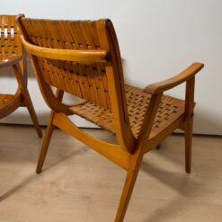 The seats are constructed with elastic straps and solid beechwood elements, offering comfort and durability. Professionally restored, the chairs retain a beautiful original patina consistent with age and use.