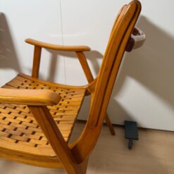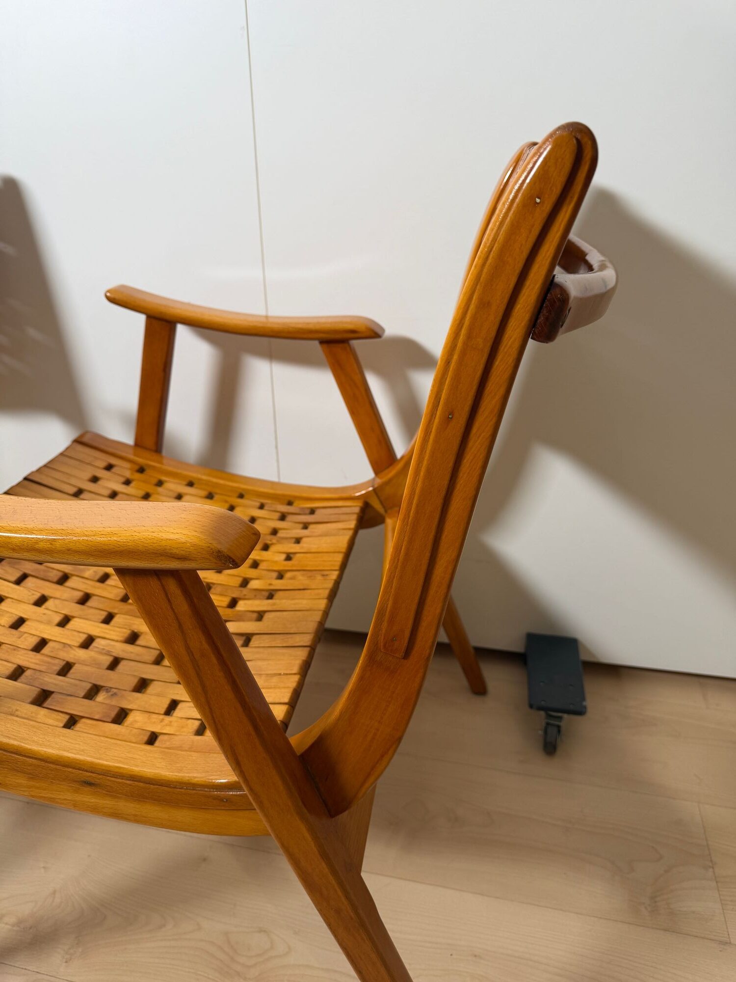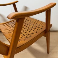 Striking pair of German midcentury armchairs by Gelenka-Patentmöbelfabrik, featuring sculptural curved beechwood armrests and elegant proportions. Designed in the late 1940s–1950s and attributed to Ernst Breitenborn and/or Erich Dieckmann, these chairs exemplify Gelenka’s refined bentwood craftsmanship.
