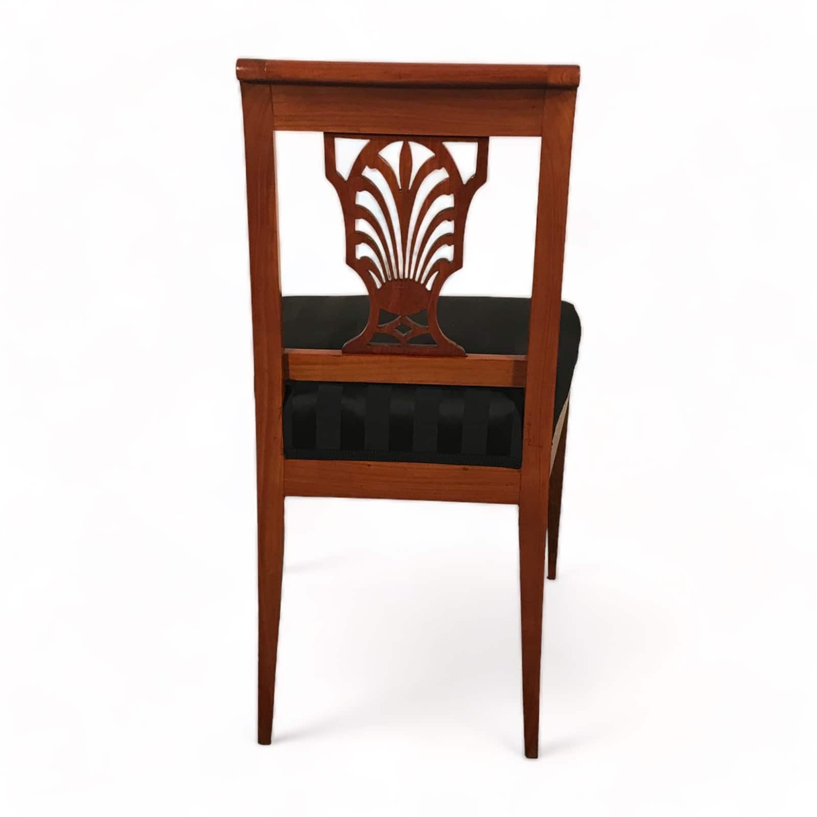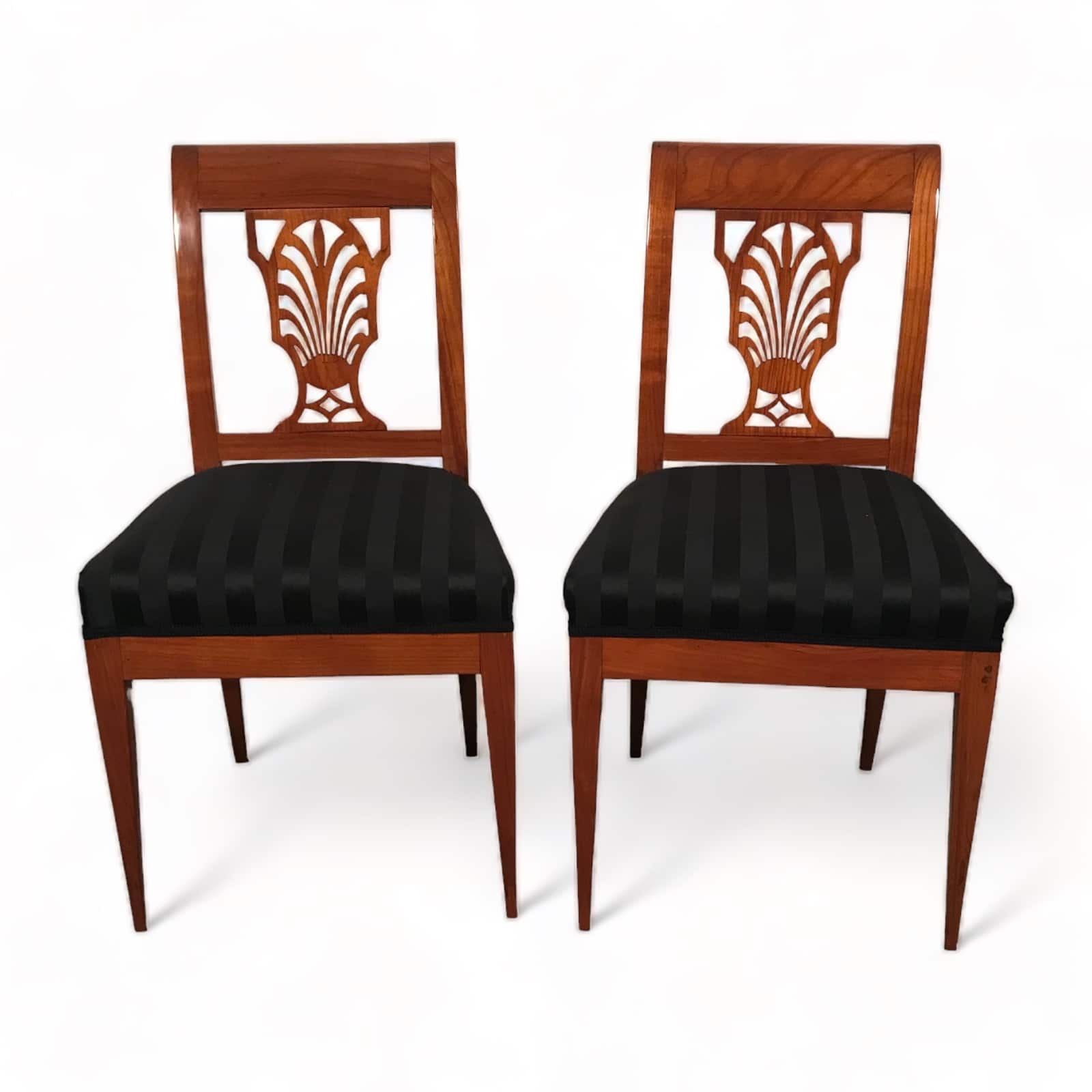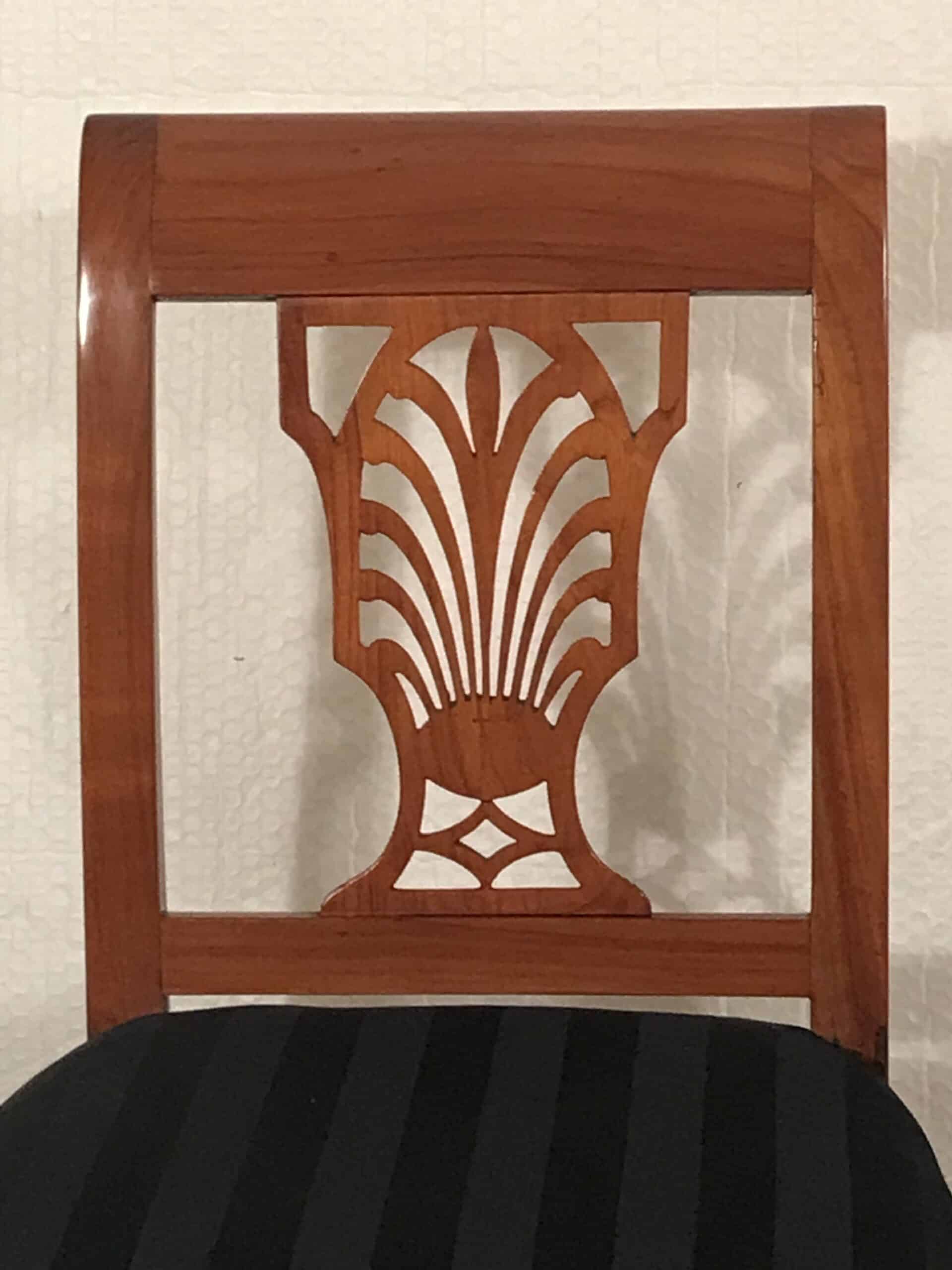 Exquisite Design with Palmette Motif . Discover the elegance of the past with this stunning pair of Neoclassical cherrywood chairs, hailing from Germany and crafted between 1810-1820. A detailed openwork backrest characterizes their timeless Neoclassical design, adorned with a delicate palmette motif. These chairs have been thoughtfully refurbished to restore their original beauty and charm. They now feature a fresh upholstery and fabric, ensuring both comfort and aesthetics align with contemporary standards.