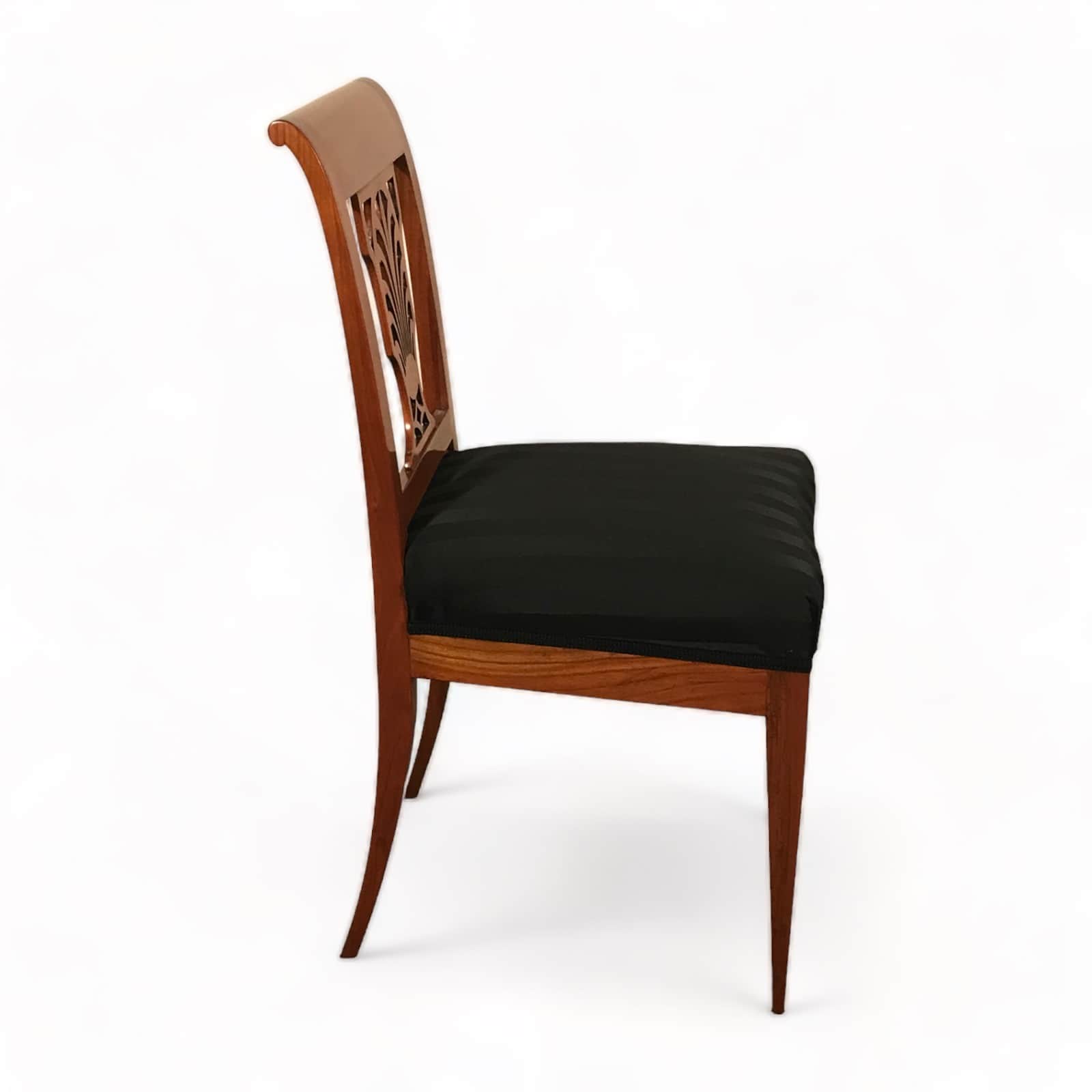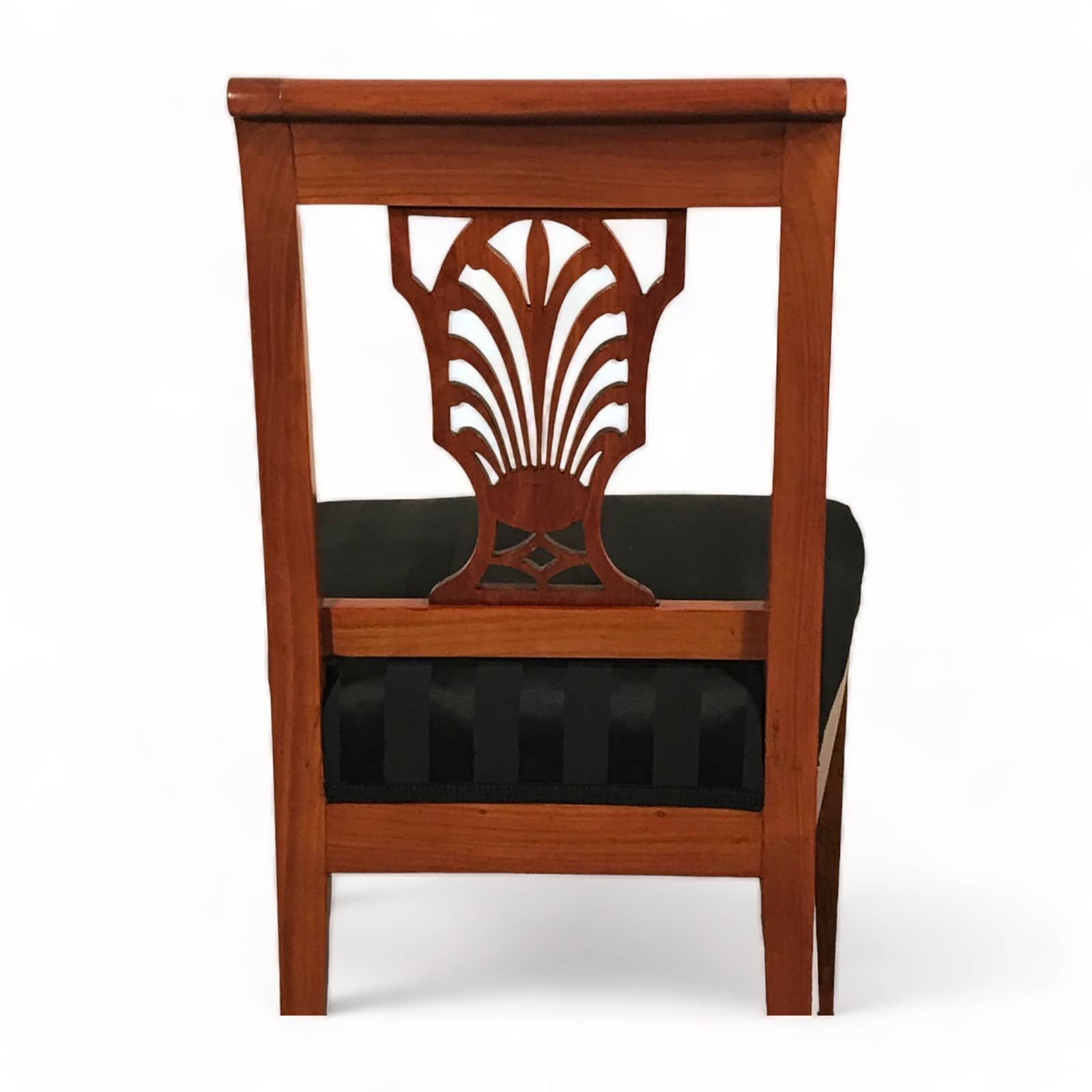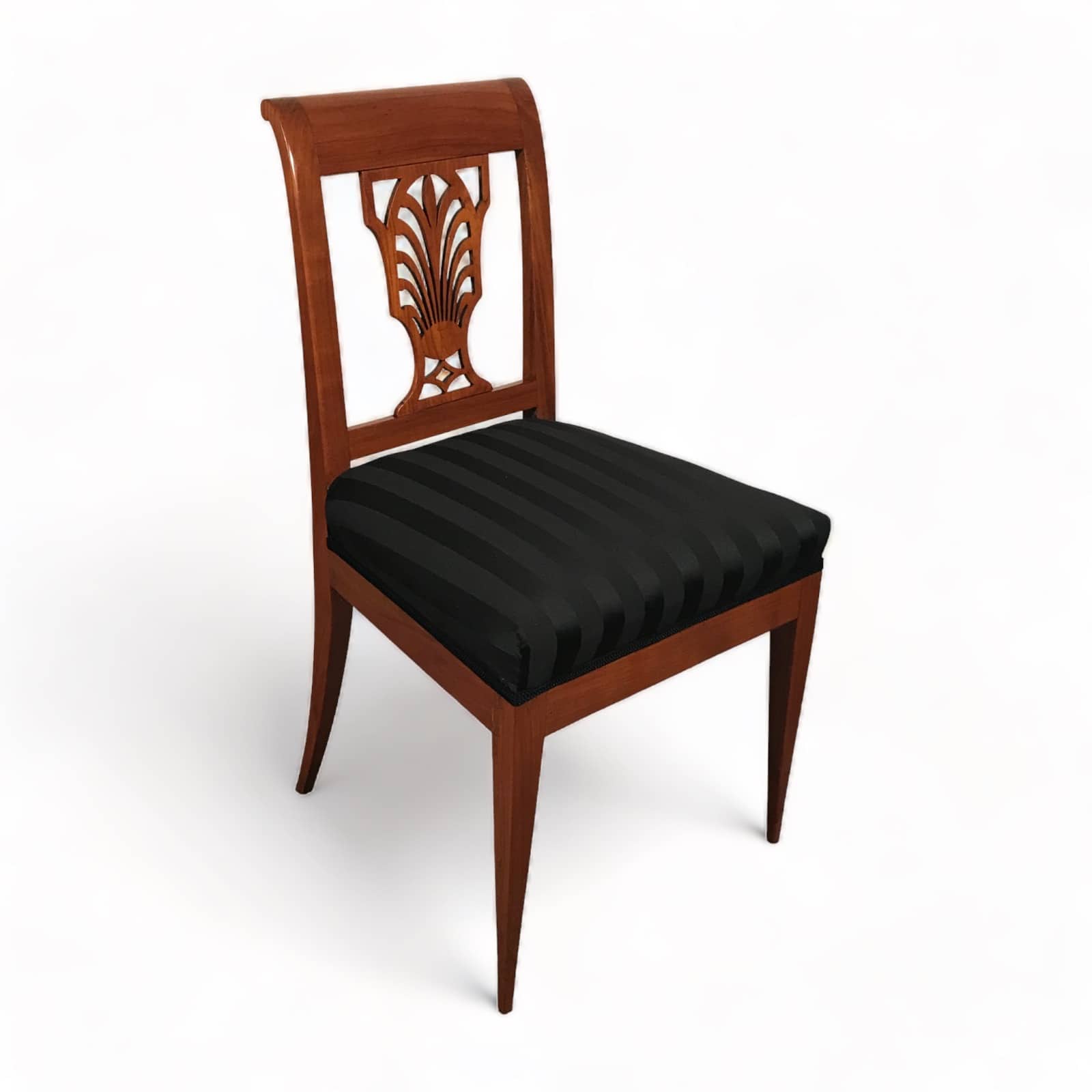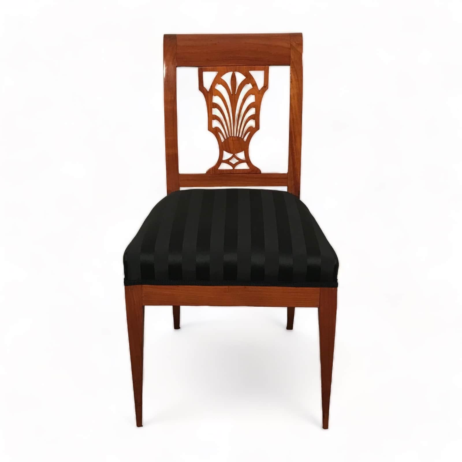 Exquisite Design with Palmette Motif . Discover the elegance of the past with this stunning pair of Neoclassical cherrywood chairs, hailing from Germany and crafted between 1810-1820. A detailed openwork backrest characterizes their timeless Neoclassical design, adorned with a delicate palmette motif. These chairs have been thoughtfully refurbished to restore their original beauty and charm. They now feature a fresh upholstery and fabric, ensuring both comfort and aesthetics align with contemporary standards.