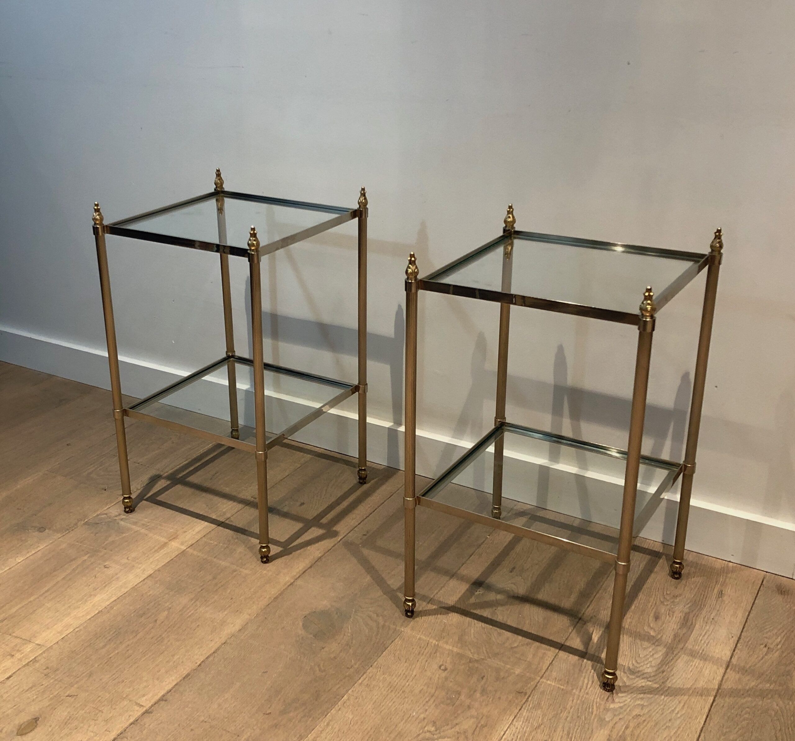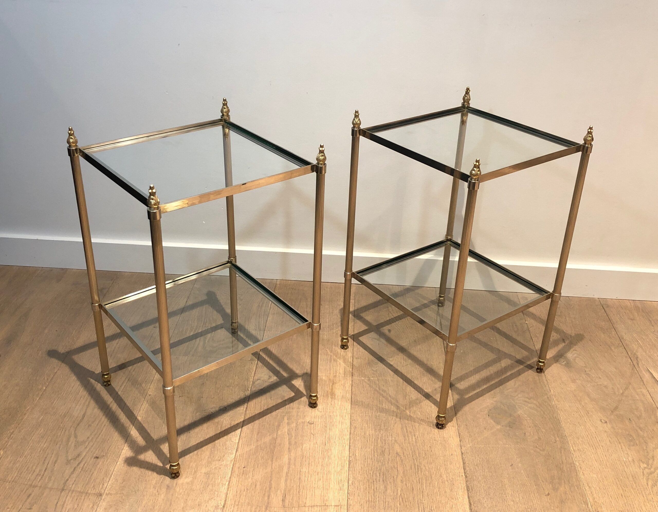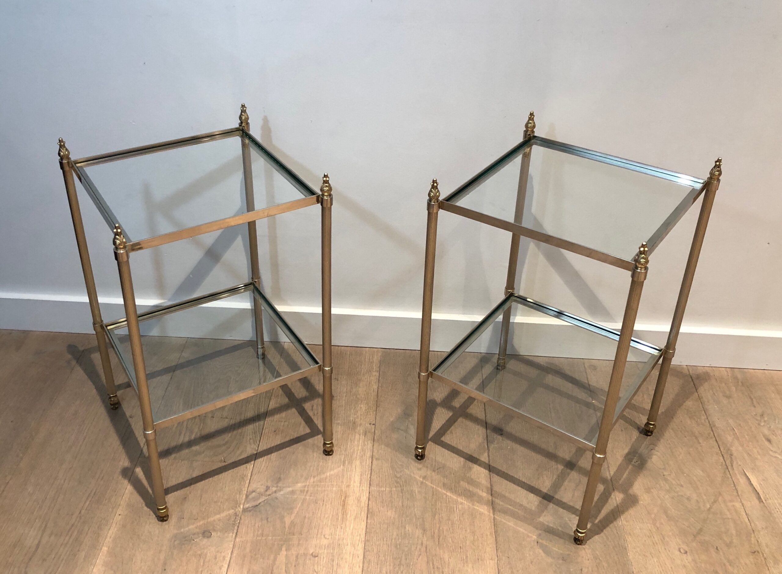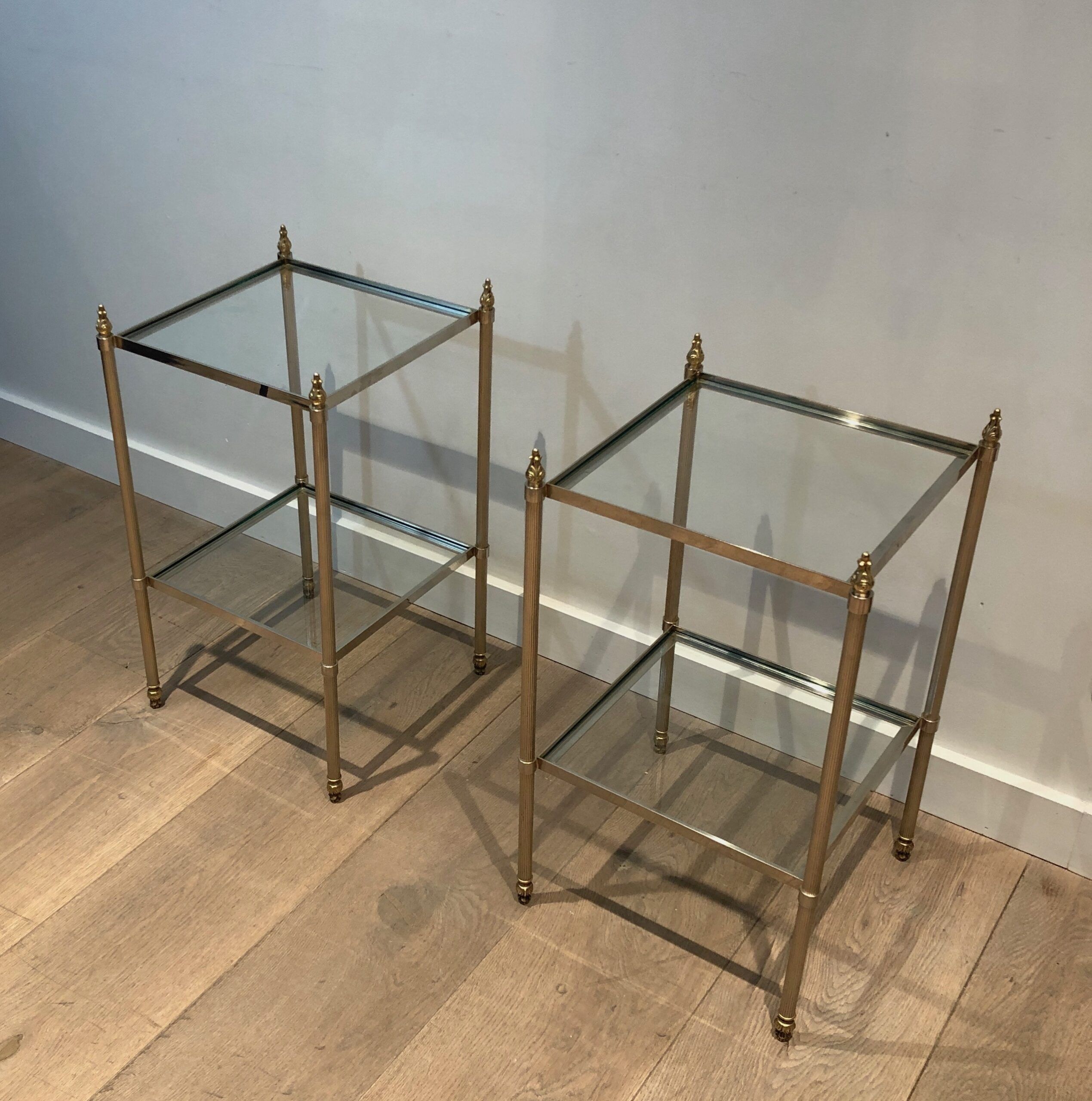 This pair of elegant side tables is attributed to the renowned Maison Jansen, showcasing silver-plated and brass craftsmanship. Featuring two tiers for versatile use and fluted legs that add texture and sophistication, these tables embody timeless style. The French work from circa 1940 brings both luxury and function, making them a standout addition to any interior. Their neoclassical design and fine materials ensure they complement a variety of settings with understated elegance.