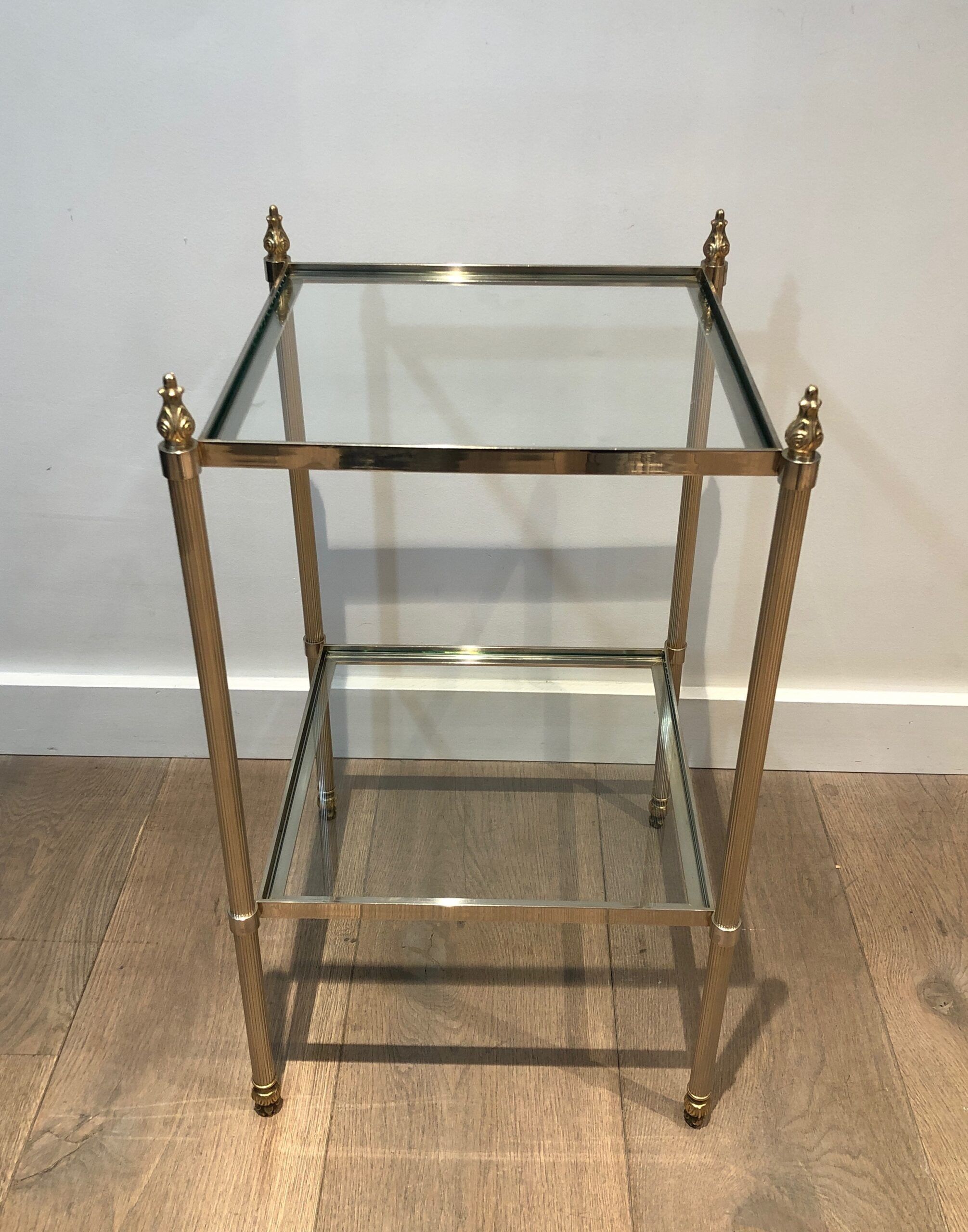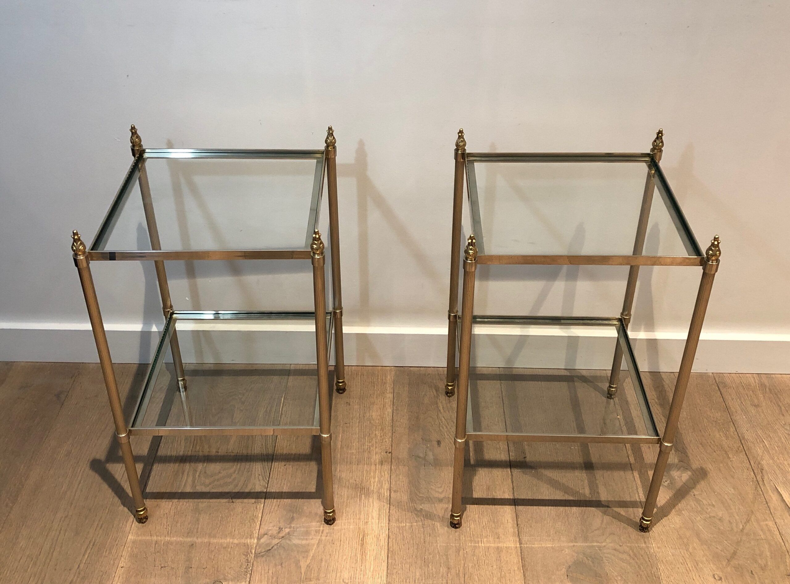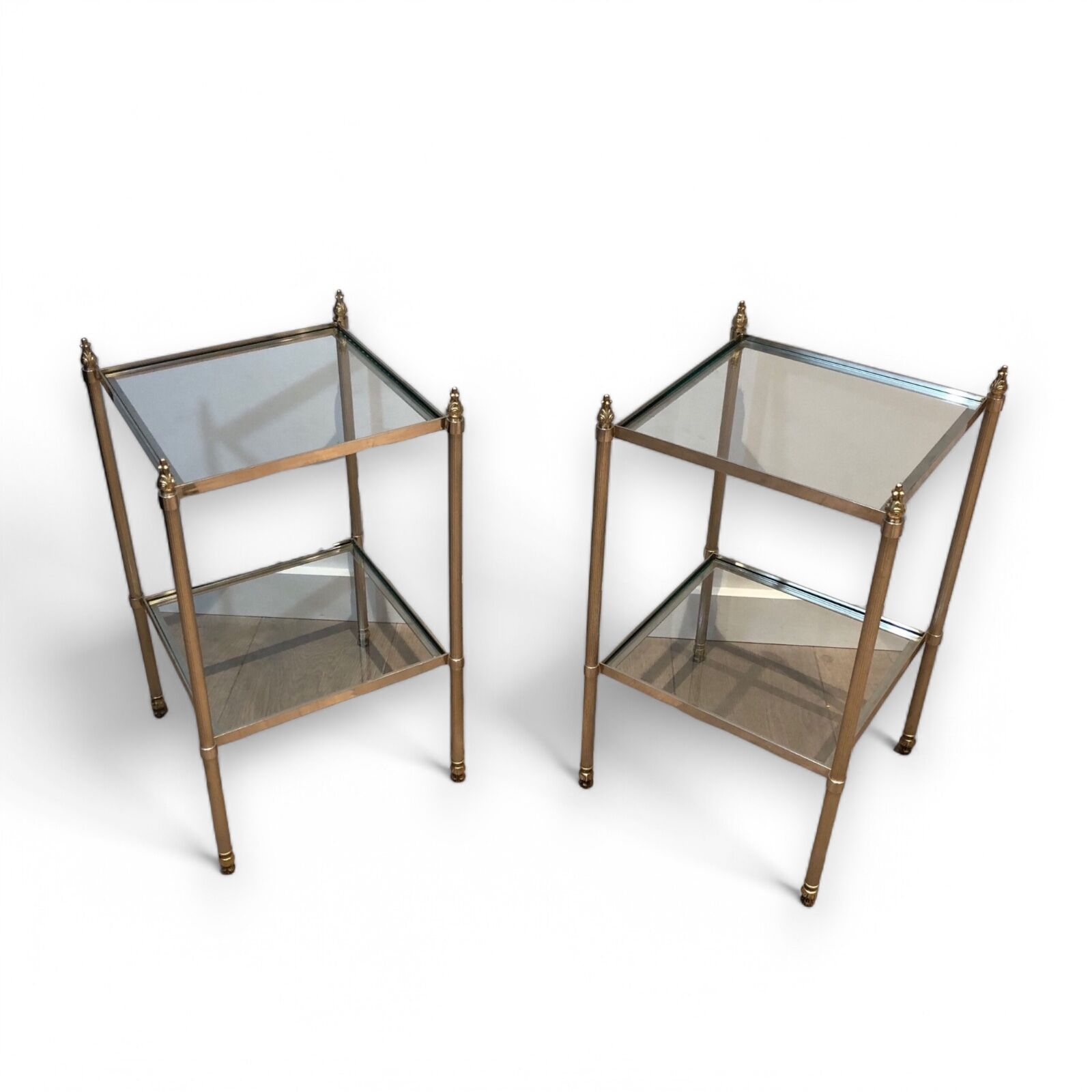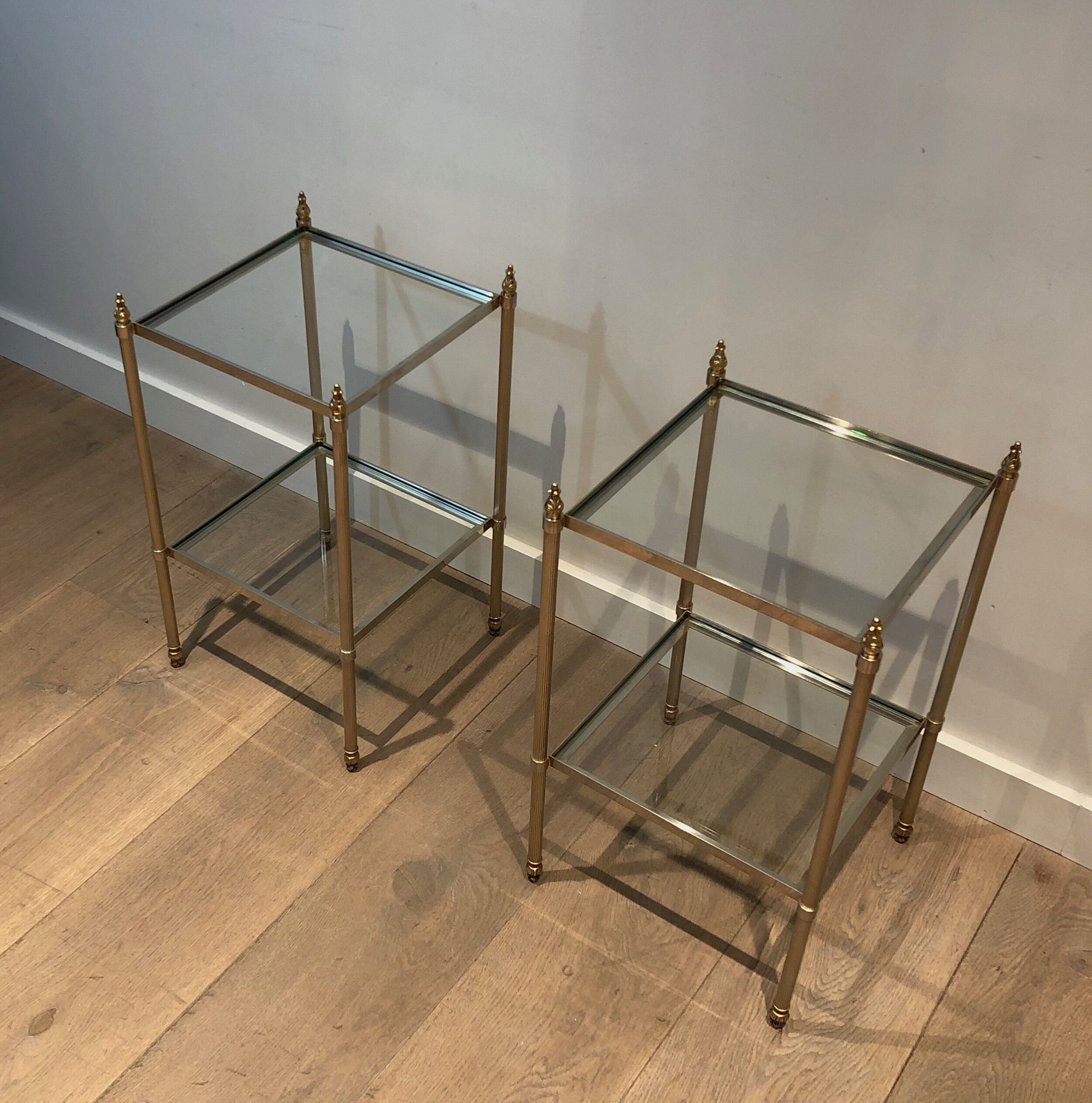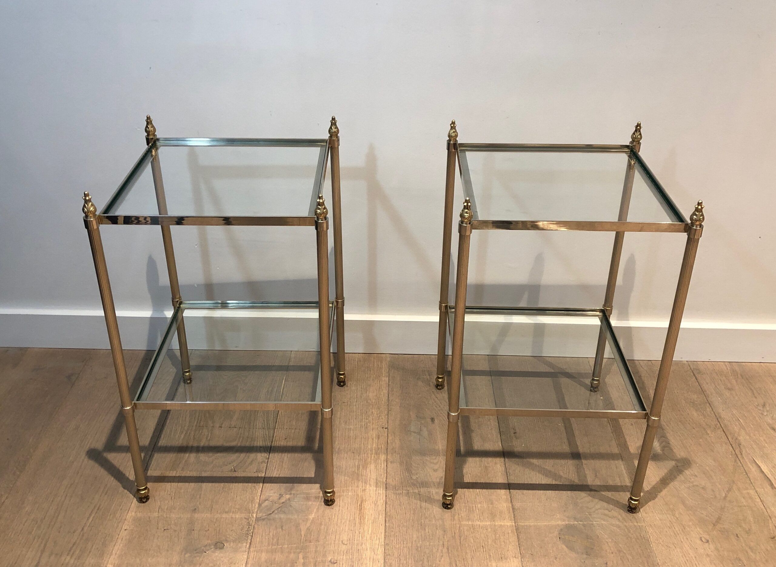This pair of elegant side tables is attributed to the renowned Maison Jansen, showcasing silver-plated and brass craftsmanship. Featuring two tiers for versatile use and fluted legs that add texture and sophistication, these tables embody timeless style. The French work from circa 1940 brings both luxury and function, making them a standout addition to any interior. Their neoclassical design and fine materials ensure they complement a variety of settings with understated elegance.