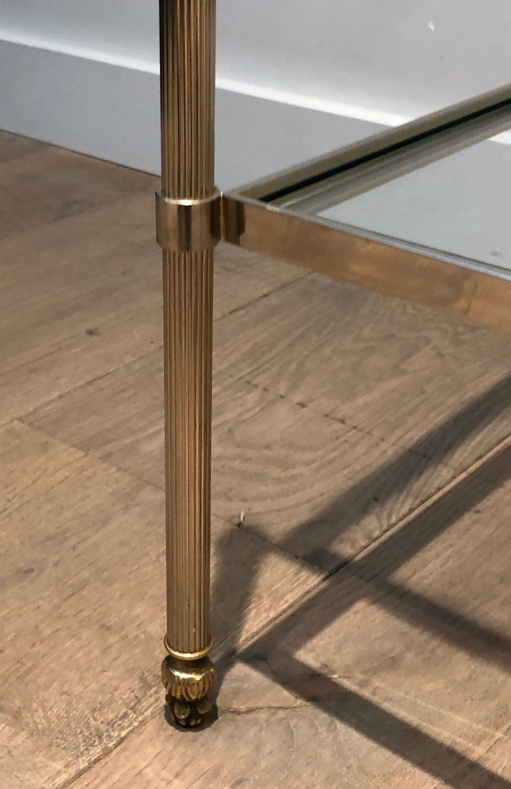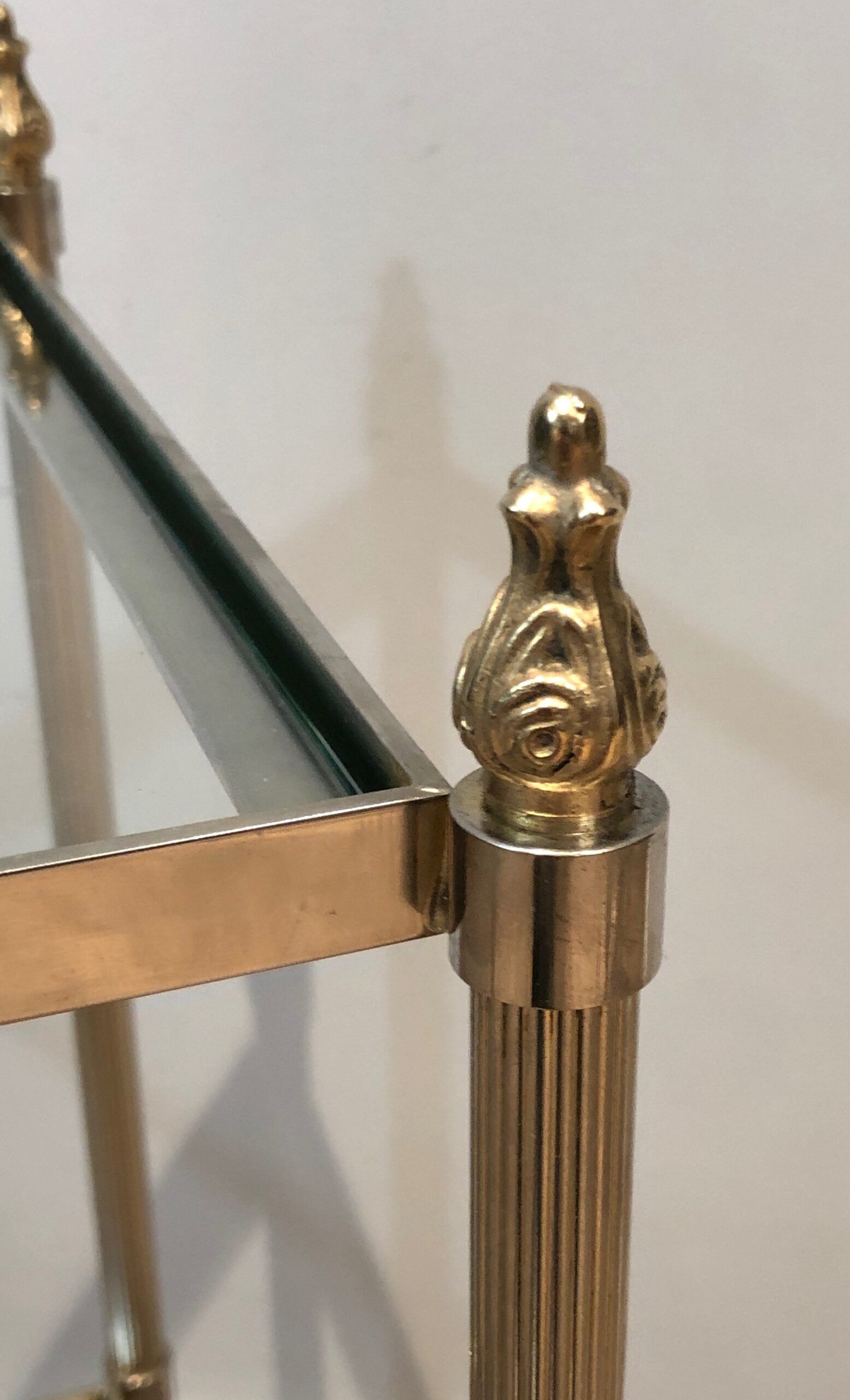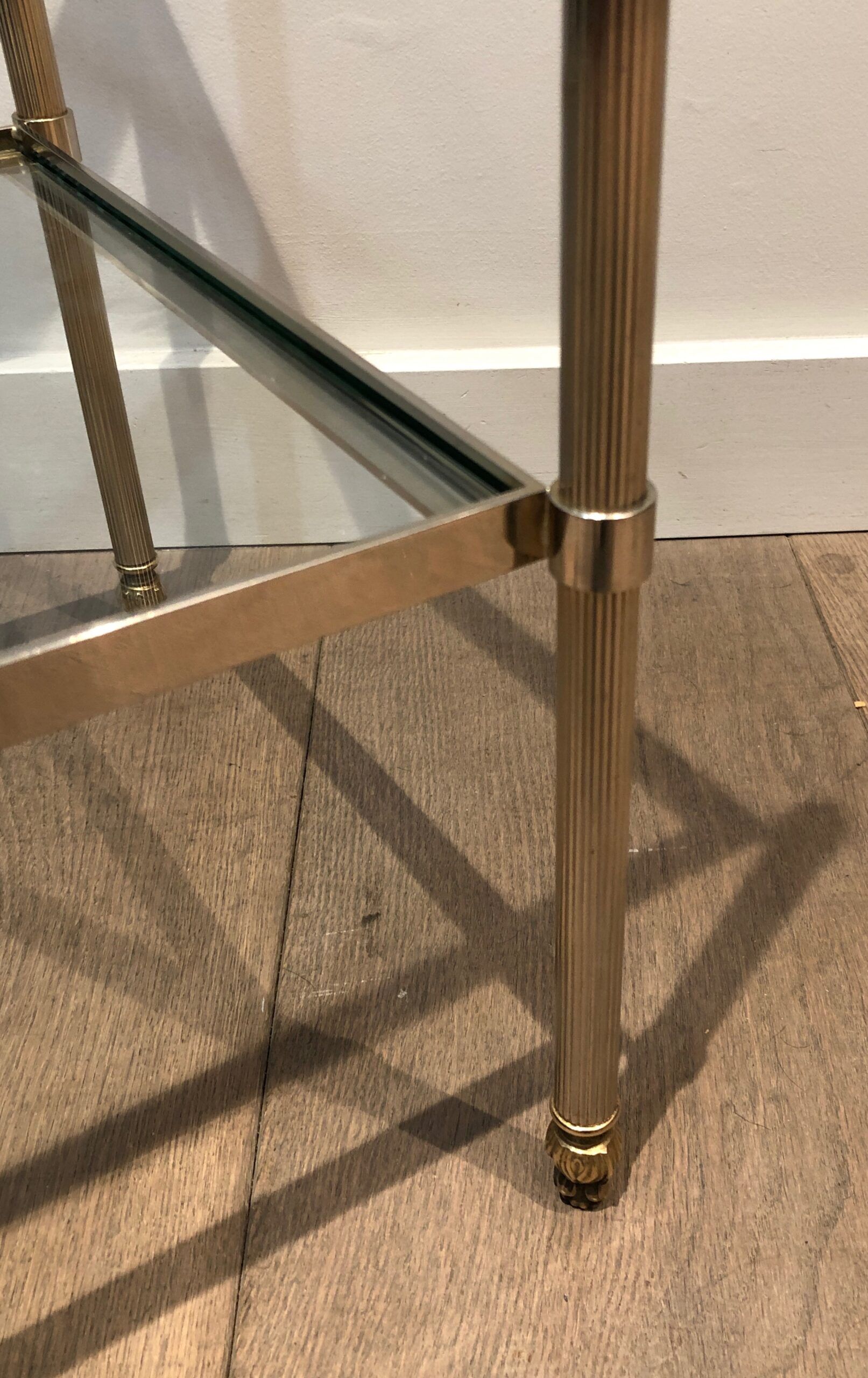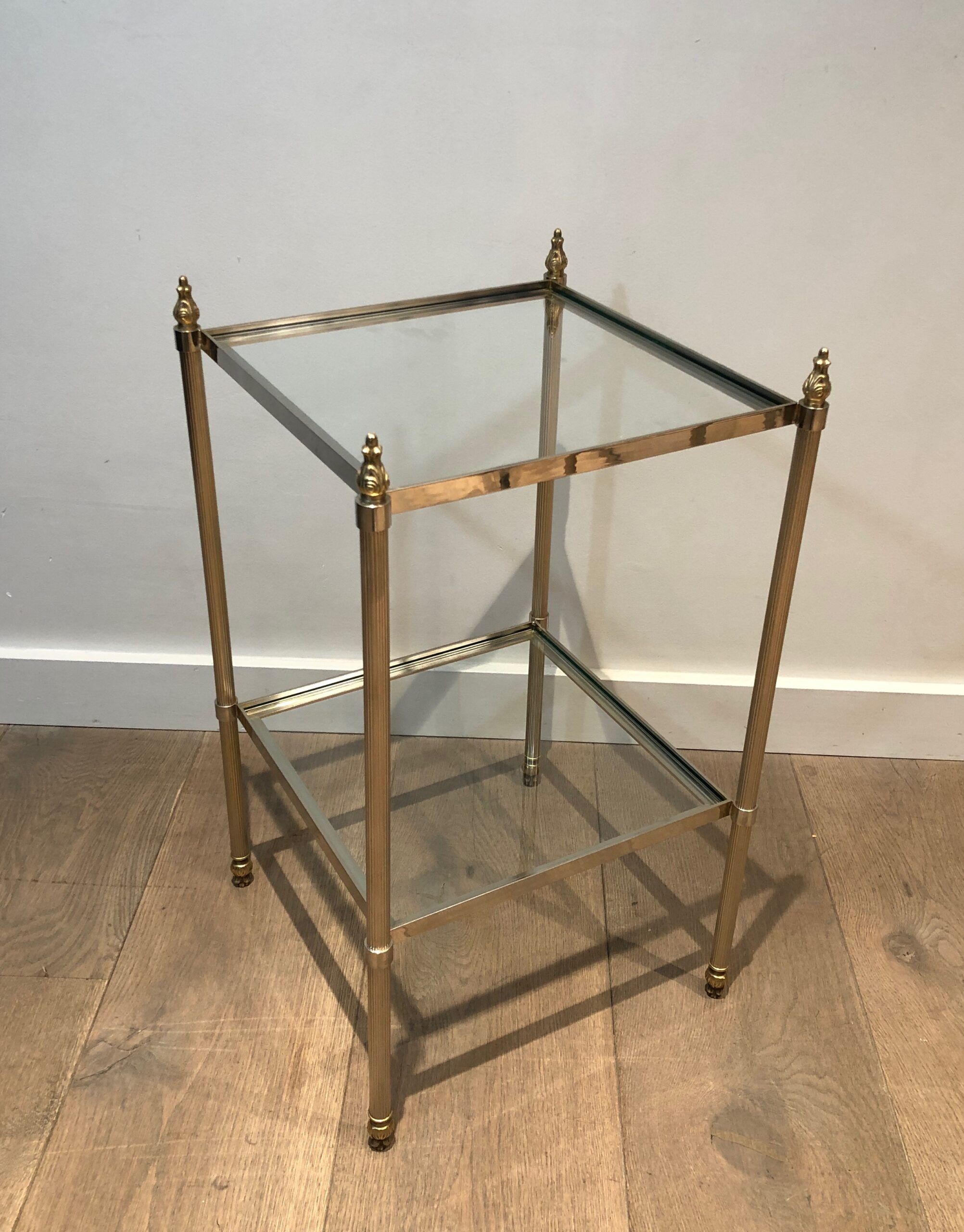 This pair of elegant side tables is attributed to the renowned Maison Jansen, showcasing silver-plated and brass craftsmanship. Featuring two tiers for versatile use and fluted legs that add texture and sophistication, these tables embody timeless style. The French work from circa 1940 brings both luxury and function, making them a standout addition to any interior. Their neoclassical design and fine materials ensure they complement a variety of settings with understated elegance.
