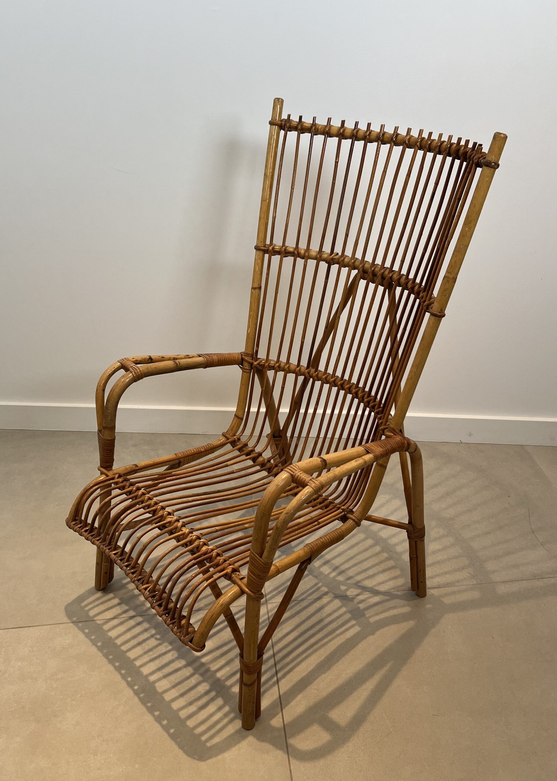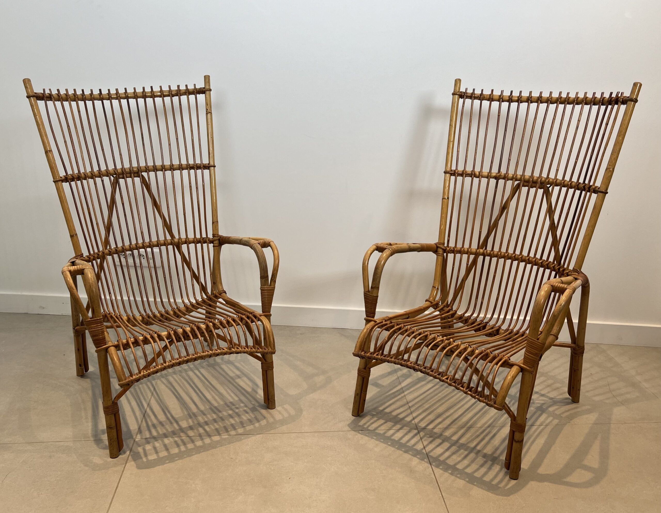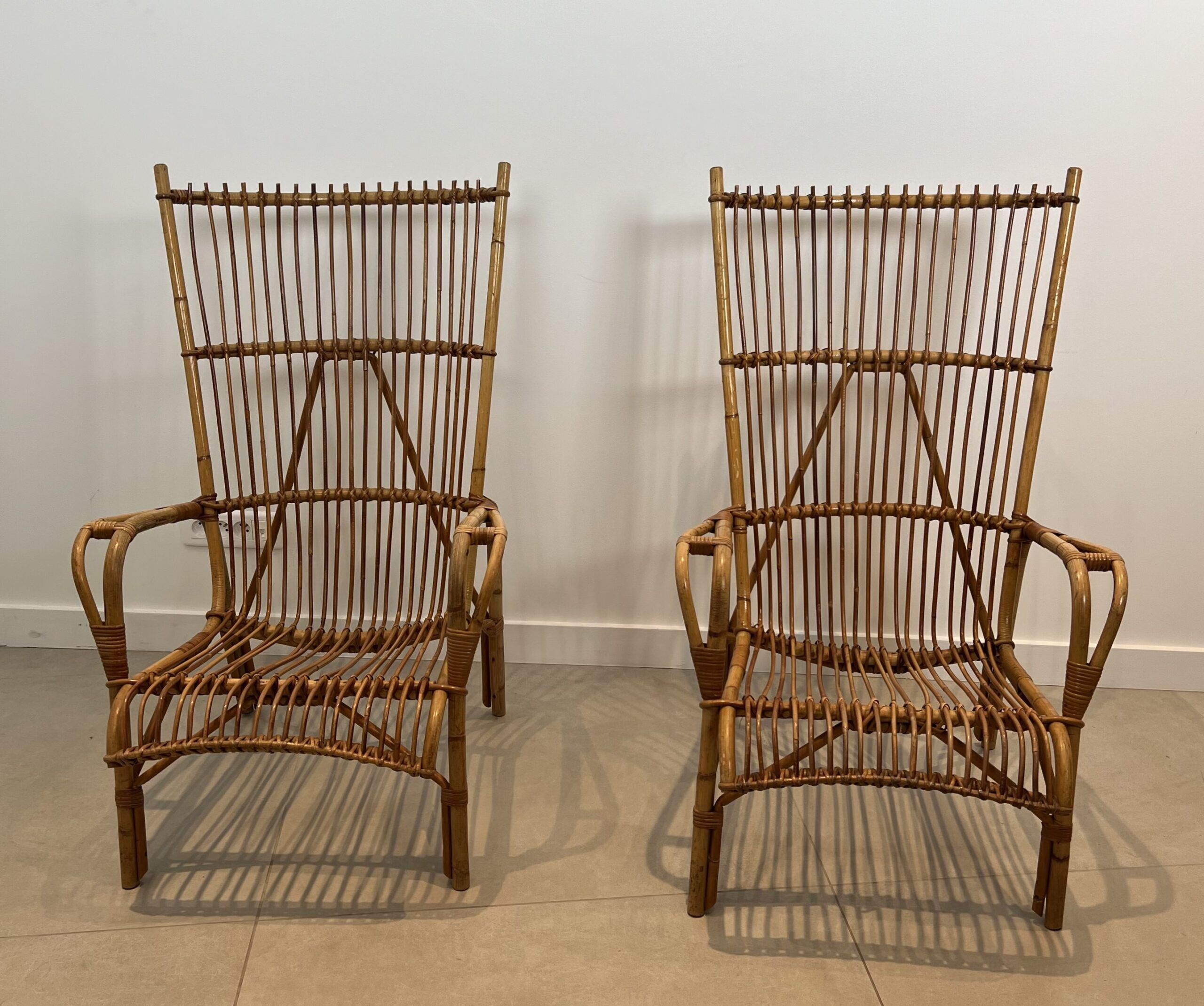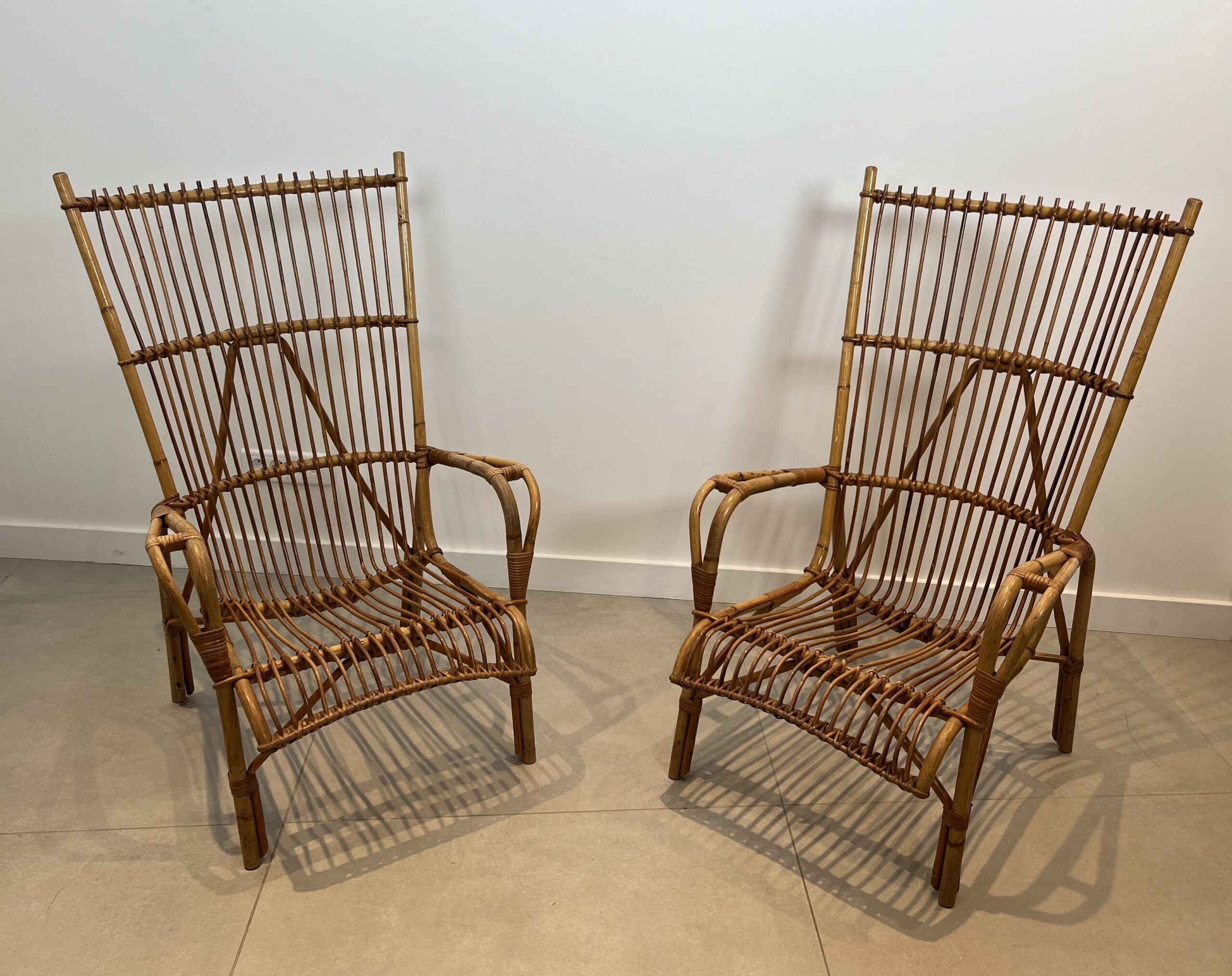 Bring timeless elegance and natural charm to your space with this pair of tall design rattan armchairs, crafted in France circa 1950. Featuring graceful high backs and intricate woven rattan. These chairs embody the perfect balance of comfort and mid-century French craftsmanship.