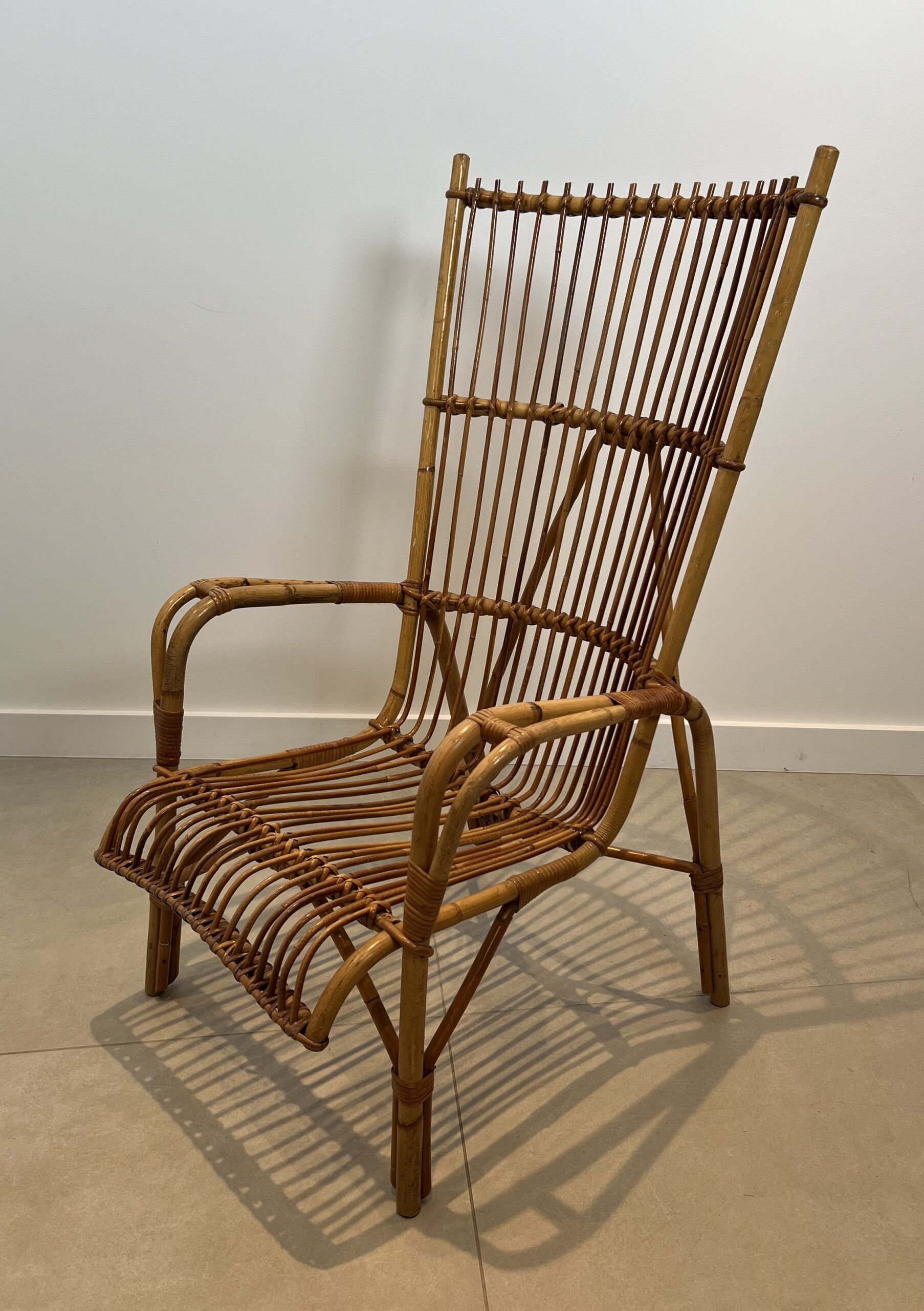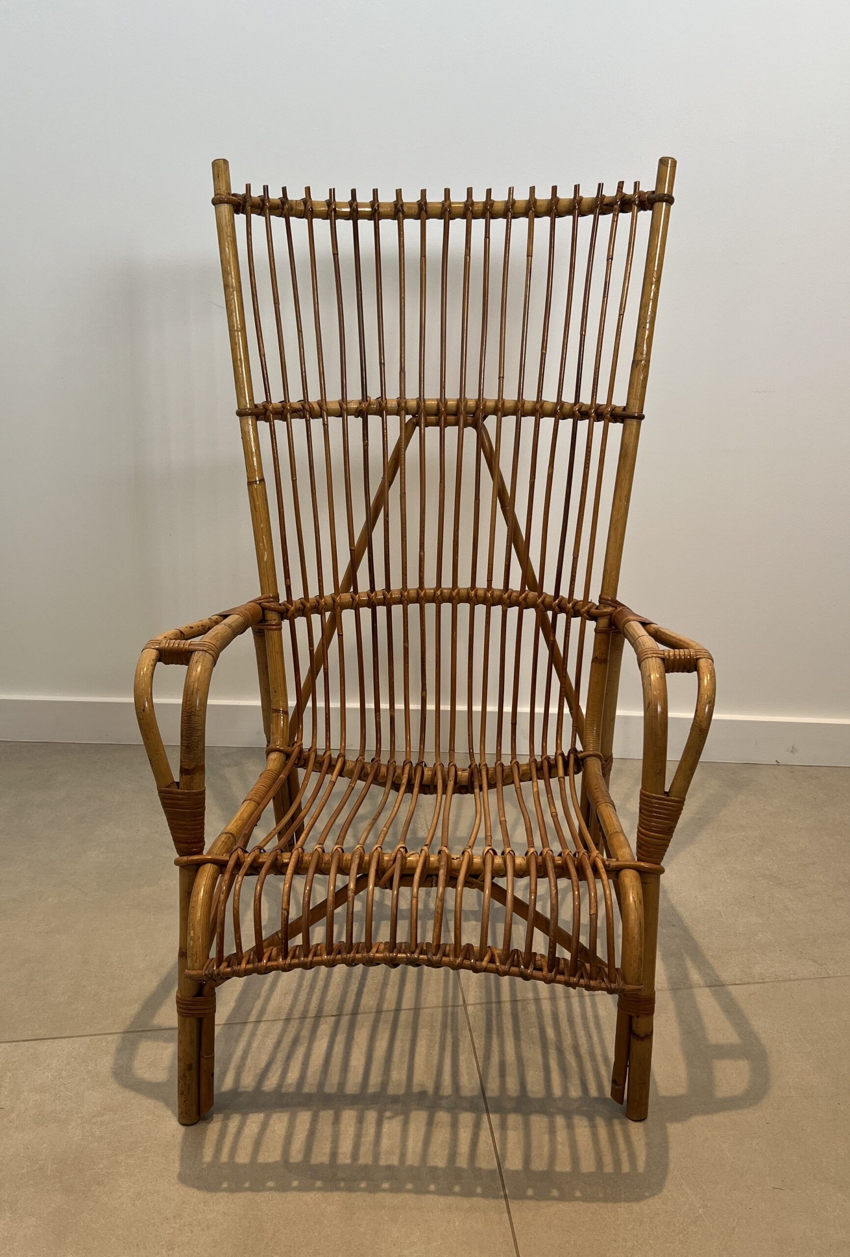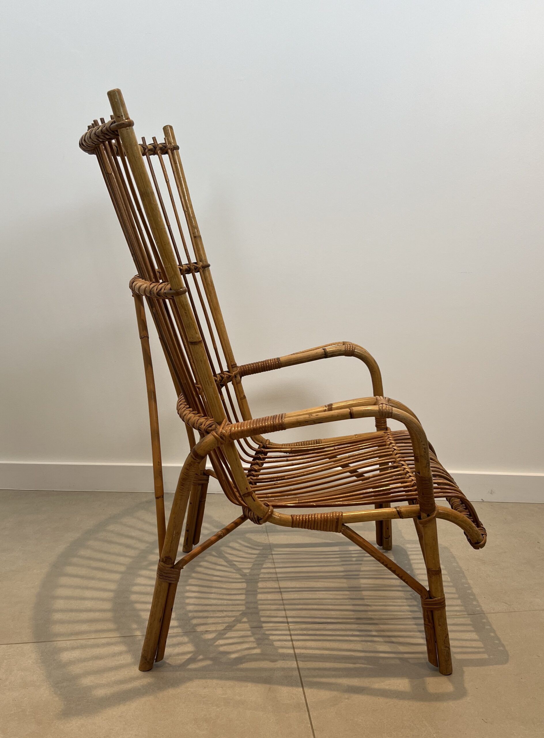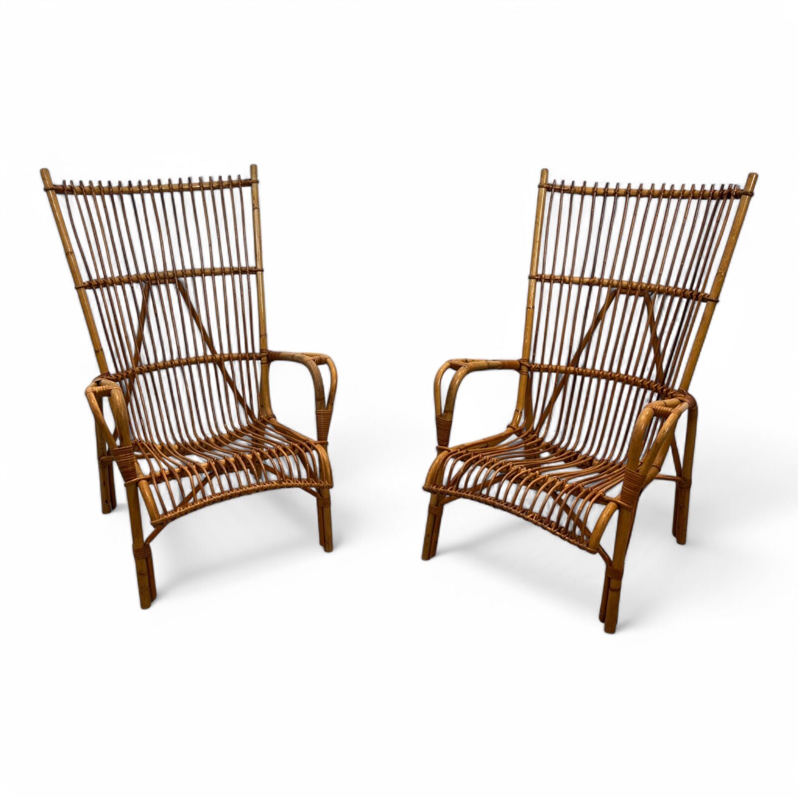 Bring timeless elegance and natural charm to your space with this pair of tall design rattan armchairs, crafted in France circa 1950. Featuring graceful high backs and intricate woven rattan. These chairs embody the perfect balance of comfort and mid-century French craftsmanship.