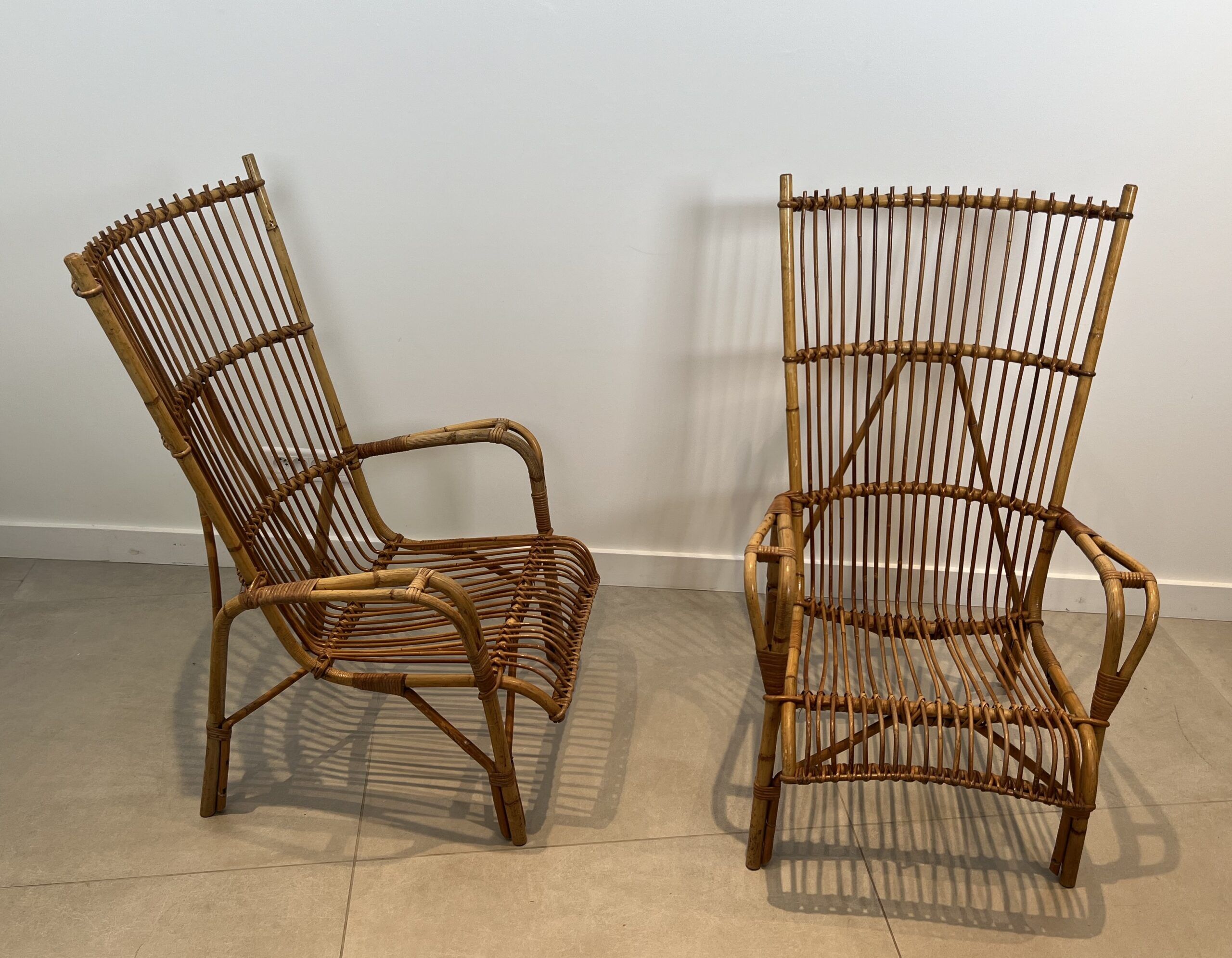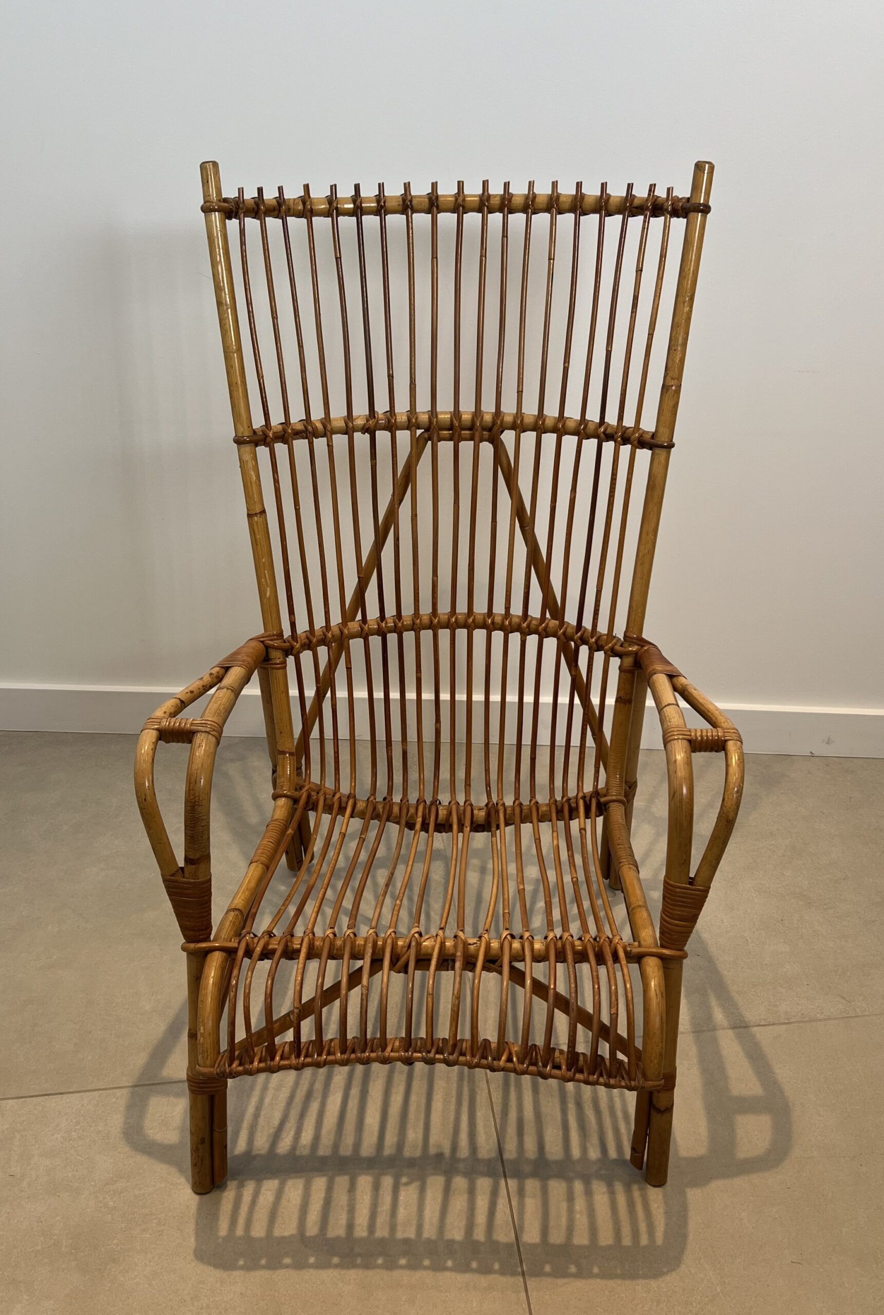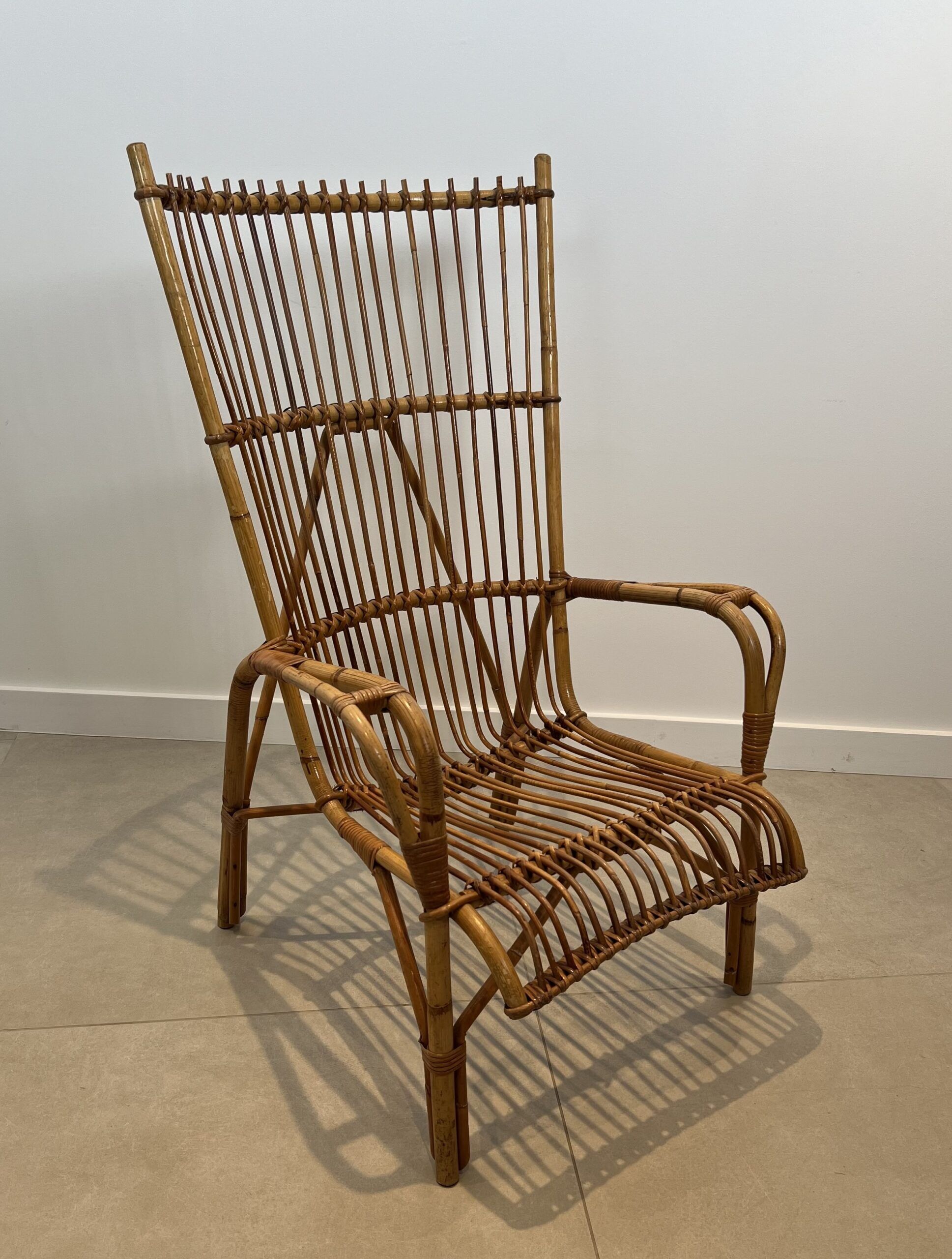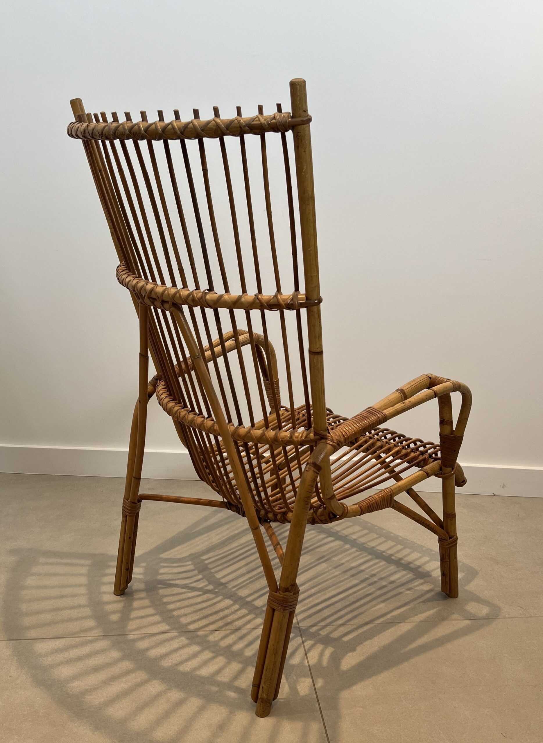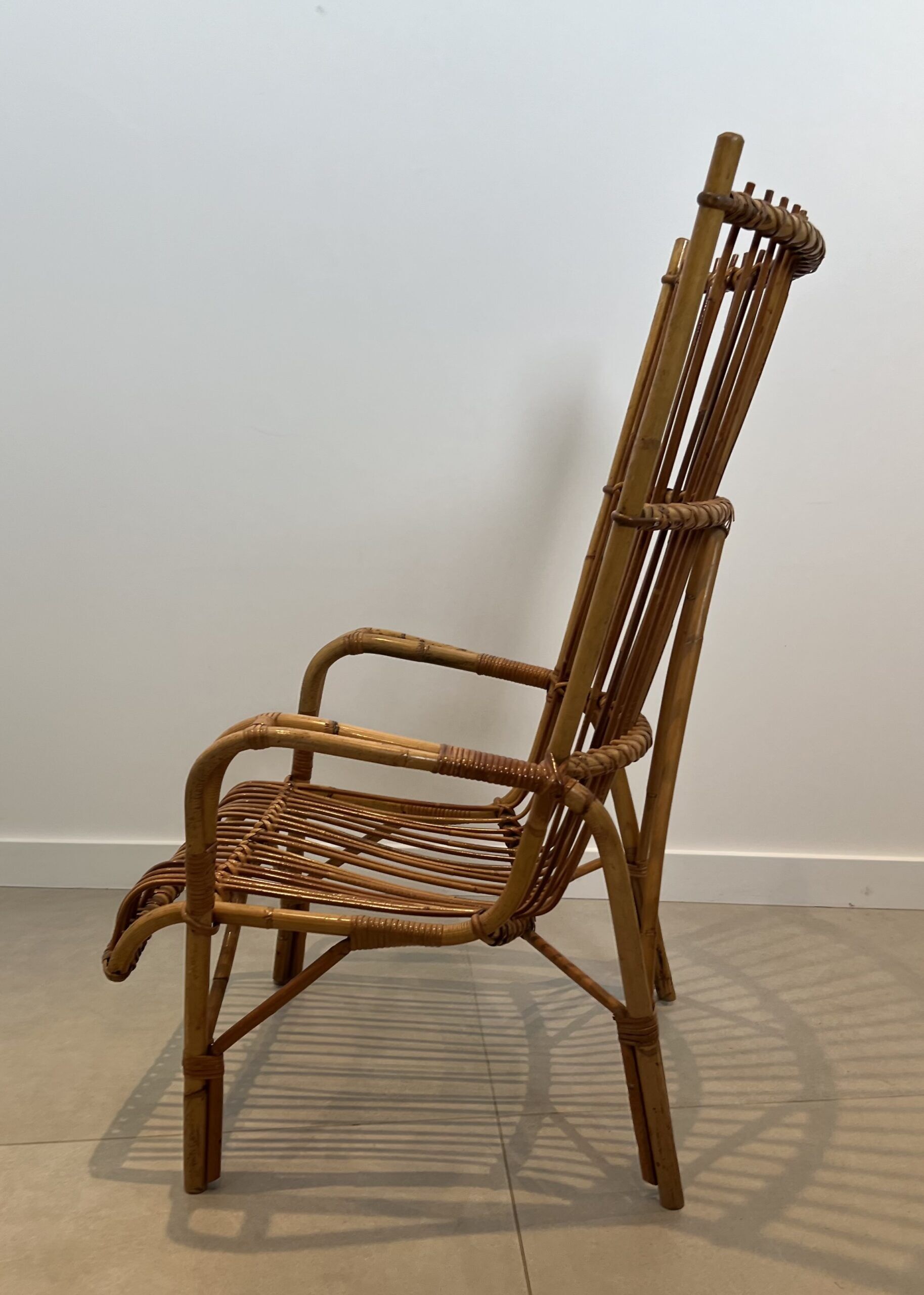 Bring timeless elegance and natural charm to your space with this pair of tall design rattan armchairs, crafted in France circa 1950. Featuring graceful high backs and intricate woven rattan. These chairs embody the perfect balance of comfort and mid-century French craftsmanship.