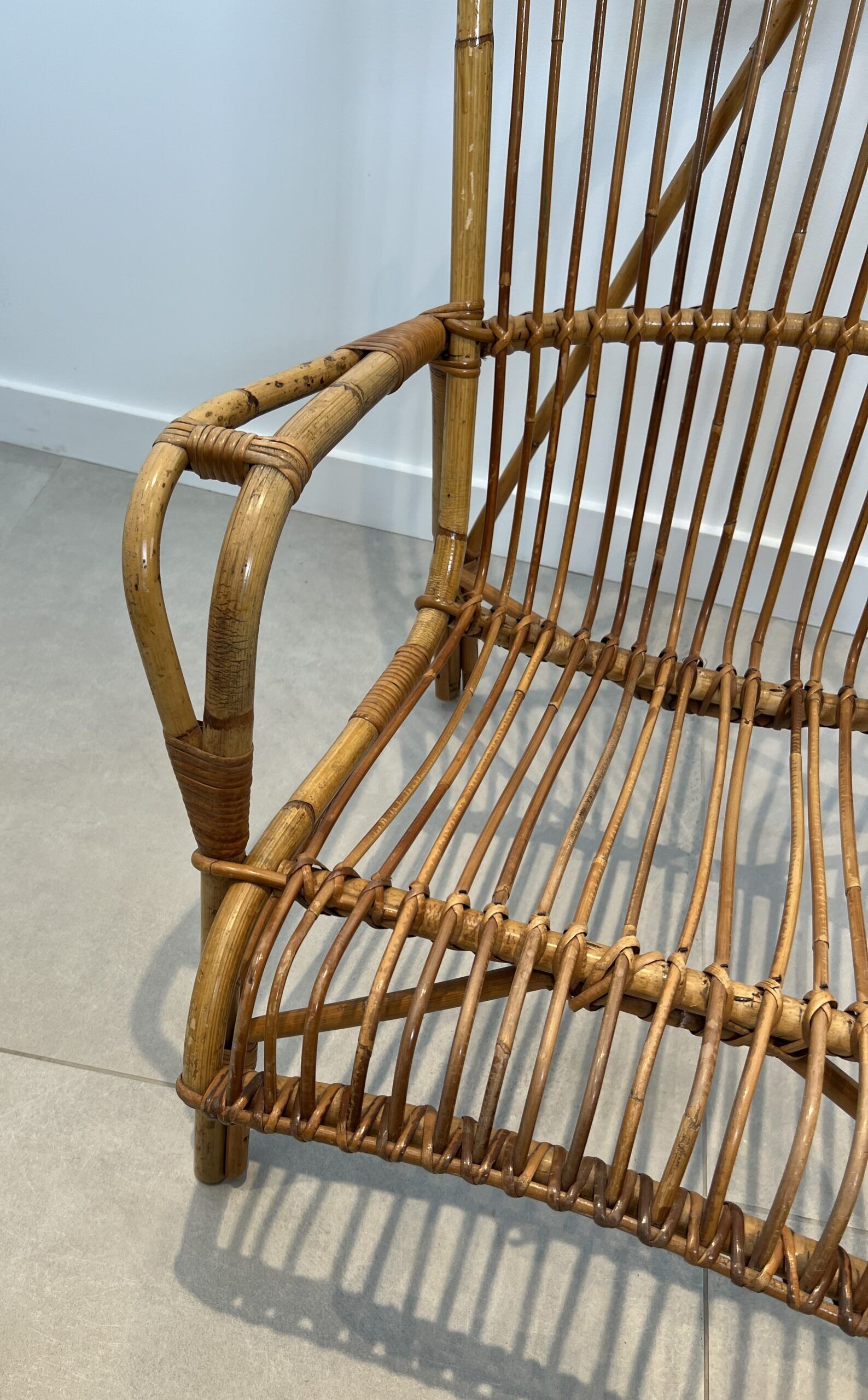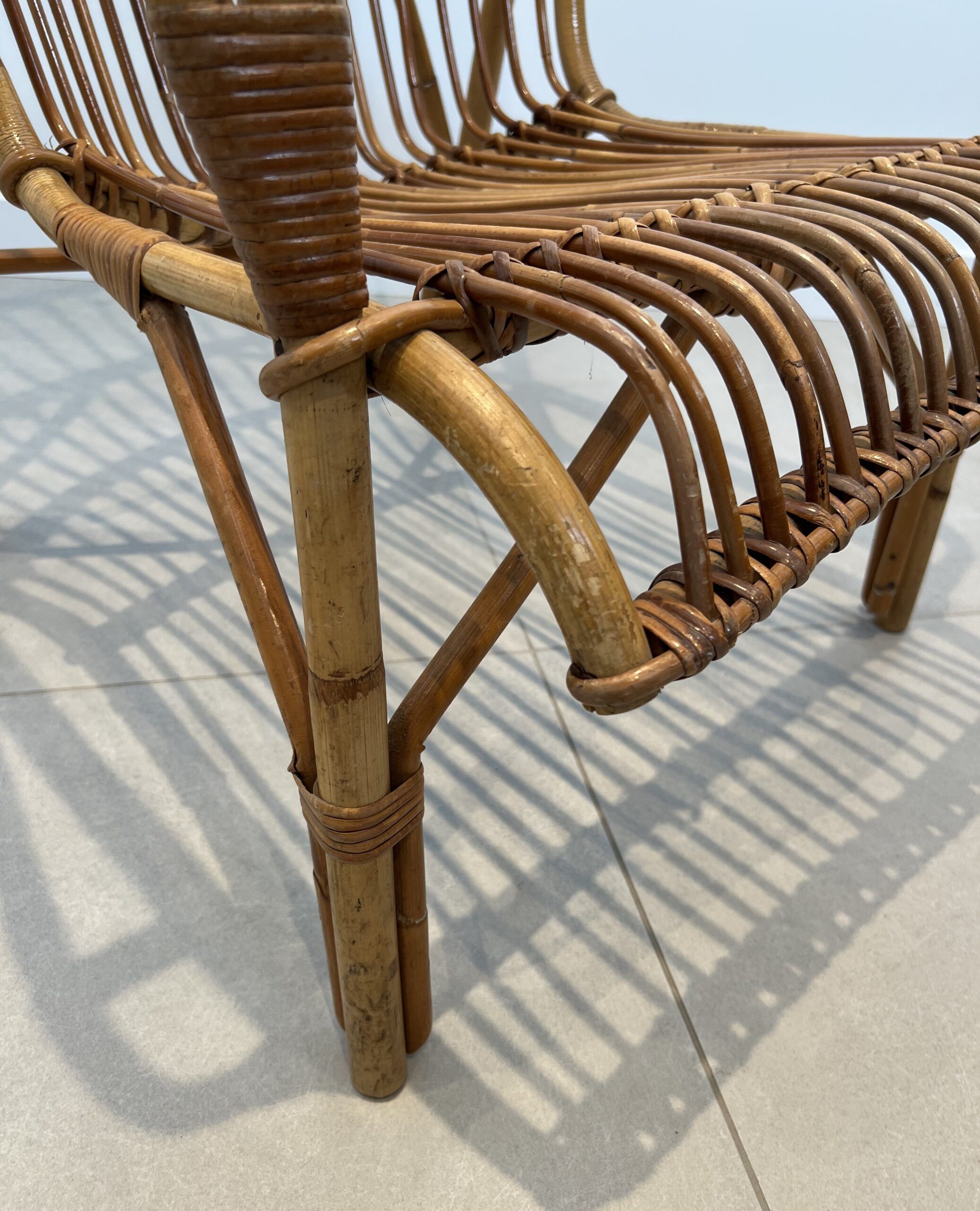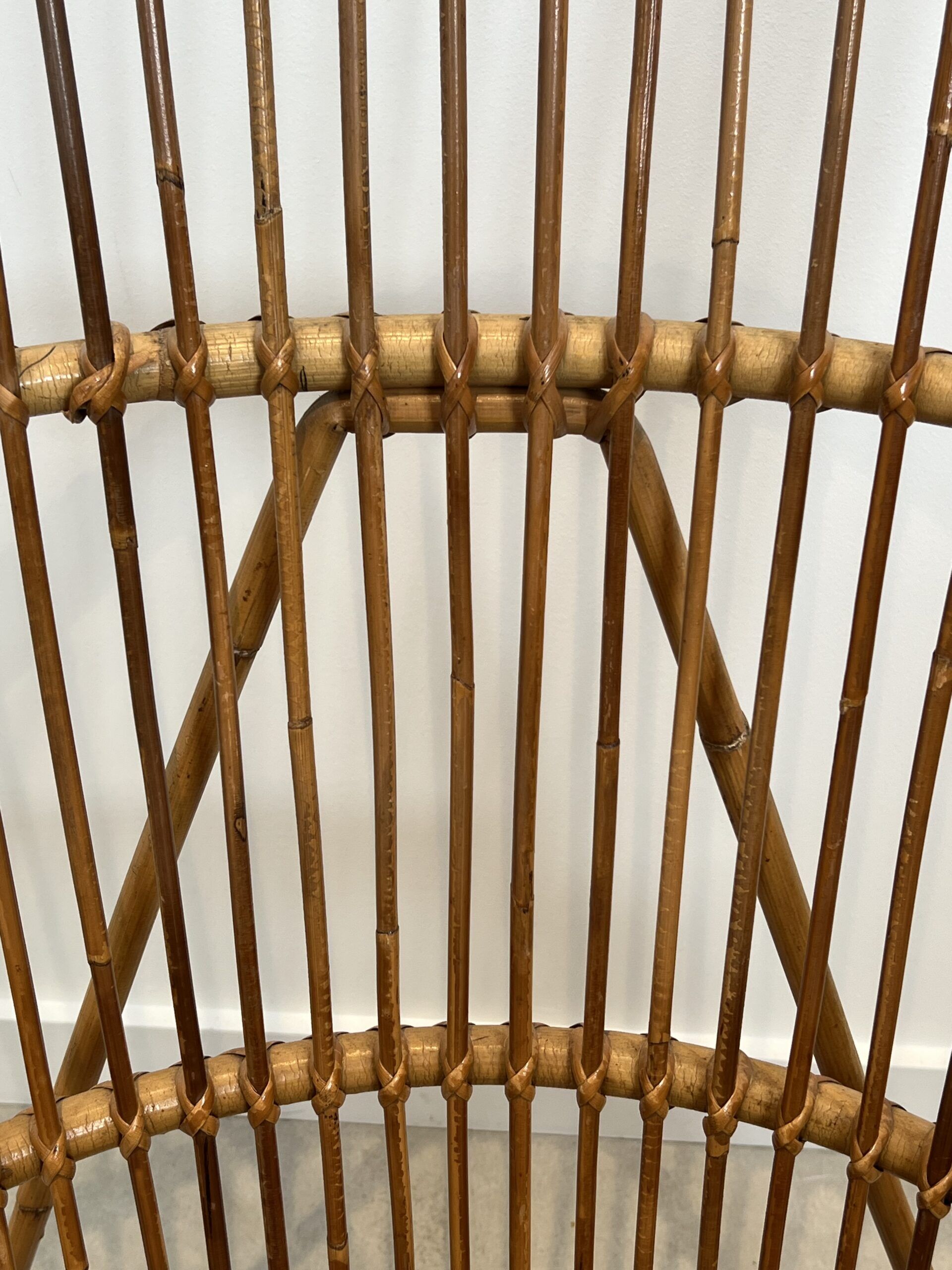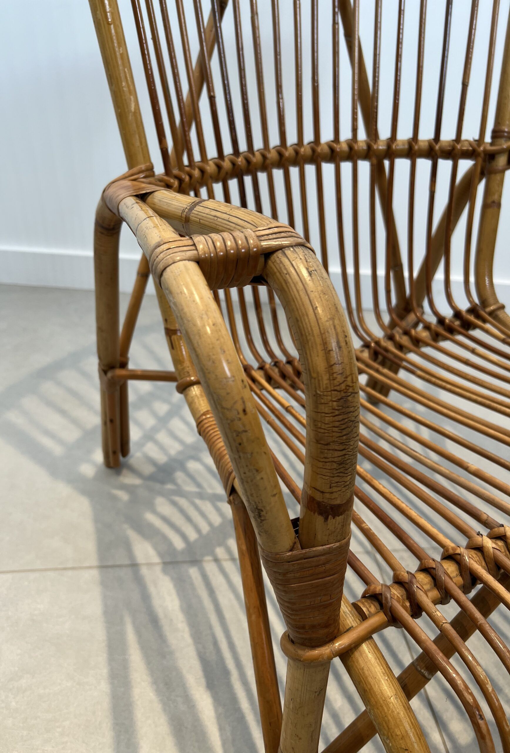 Bring timeless elegance and natural charm to your space with this pair of tall design rattan armchairs, crafted in France circa 1950. Featuring graceful high backs and intricate woven rattan. These chairs embody the perfect balance of comfort and mid-century French craftsmanship.