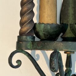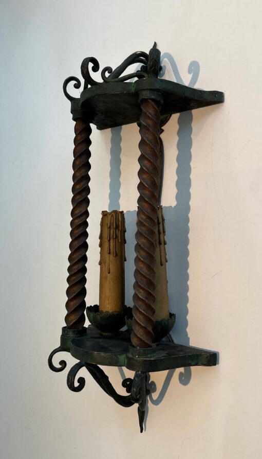 This pair of wrought iron wall lanterns showcases intricate craftsmanship with a patinated green finish and delicate gilded accents. The elegant design of the lanterns captures the charm and character of French artistry from the mid-20th century, with the contrasting finishes enhancing their timeless appeal. These lanterns are perfect for adding a touch of vintage sophistication to any interior or exterior space. French work, circa 1940, they offer both beauty and functionality, creating a warm, inviting atmosphere.