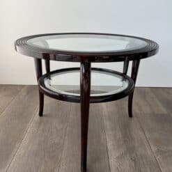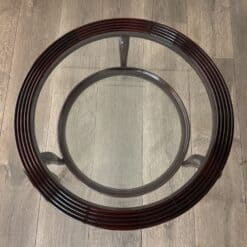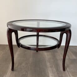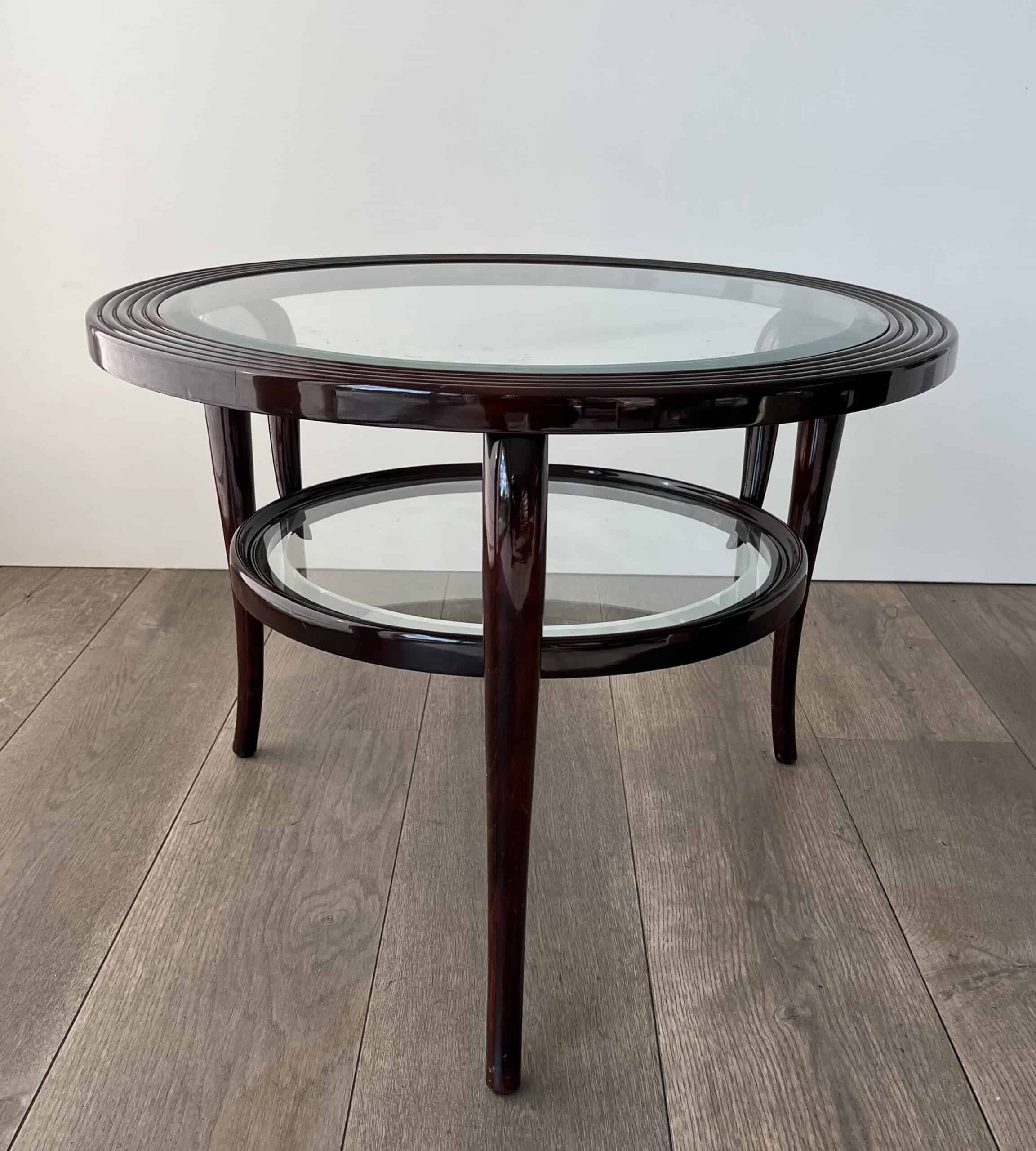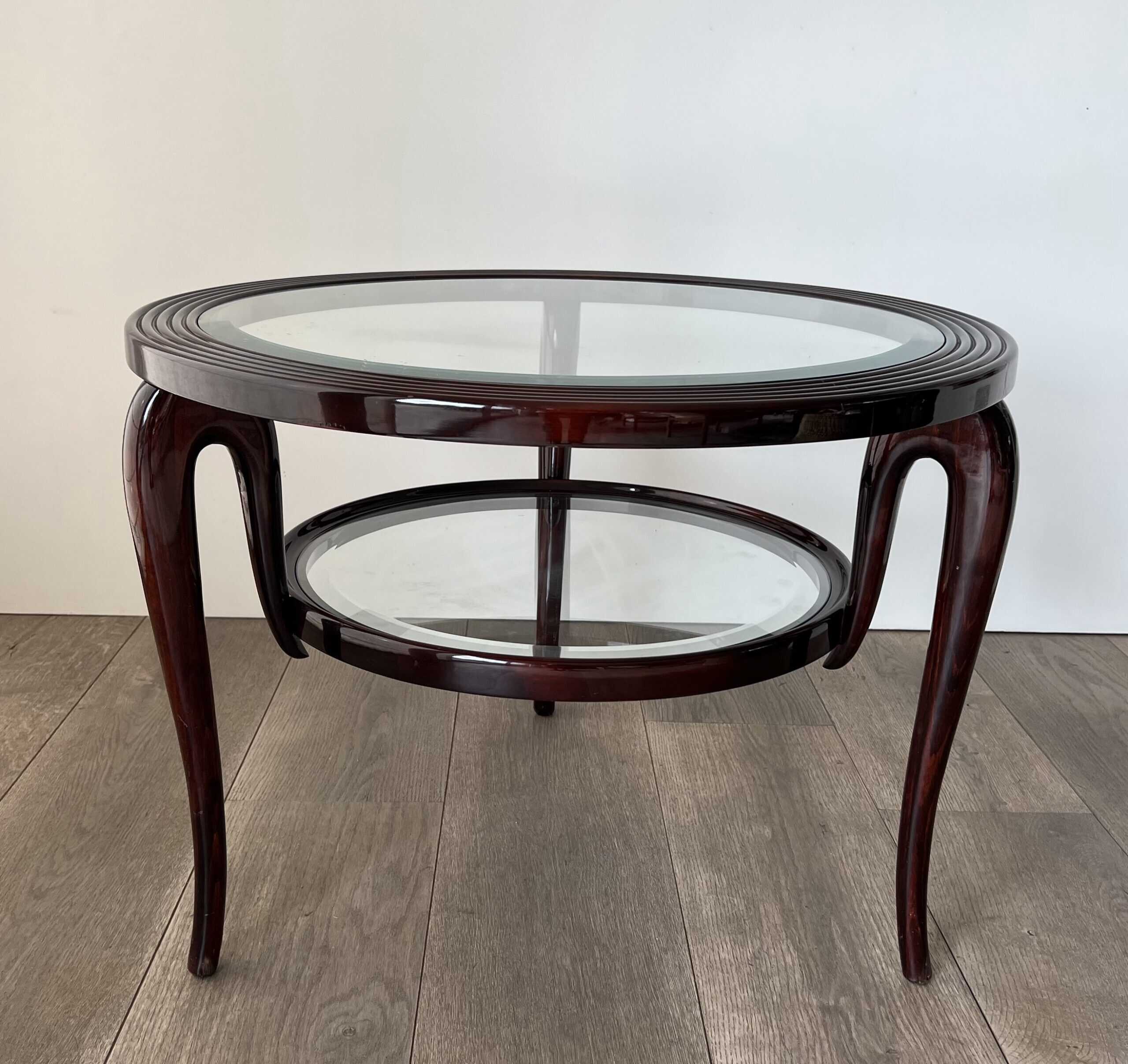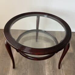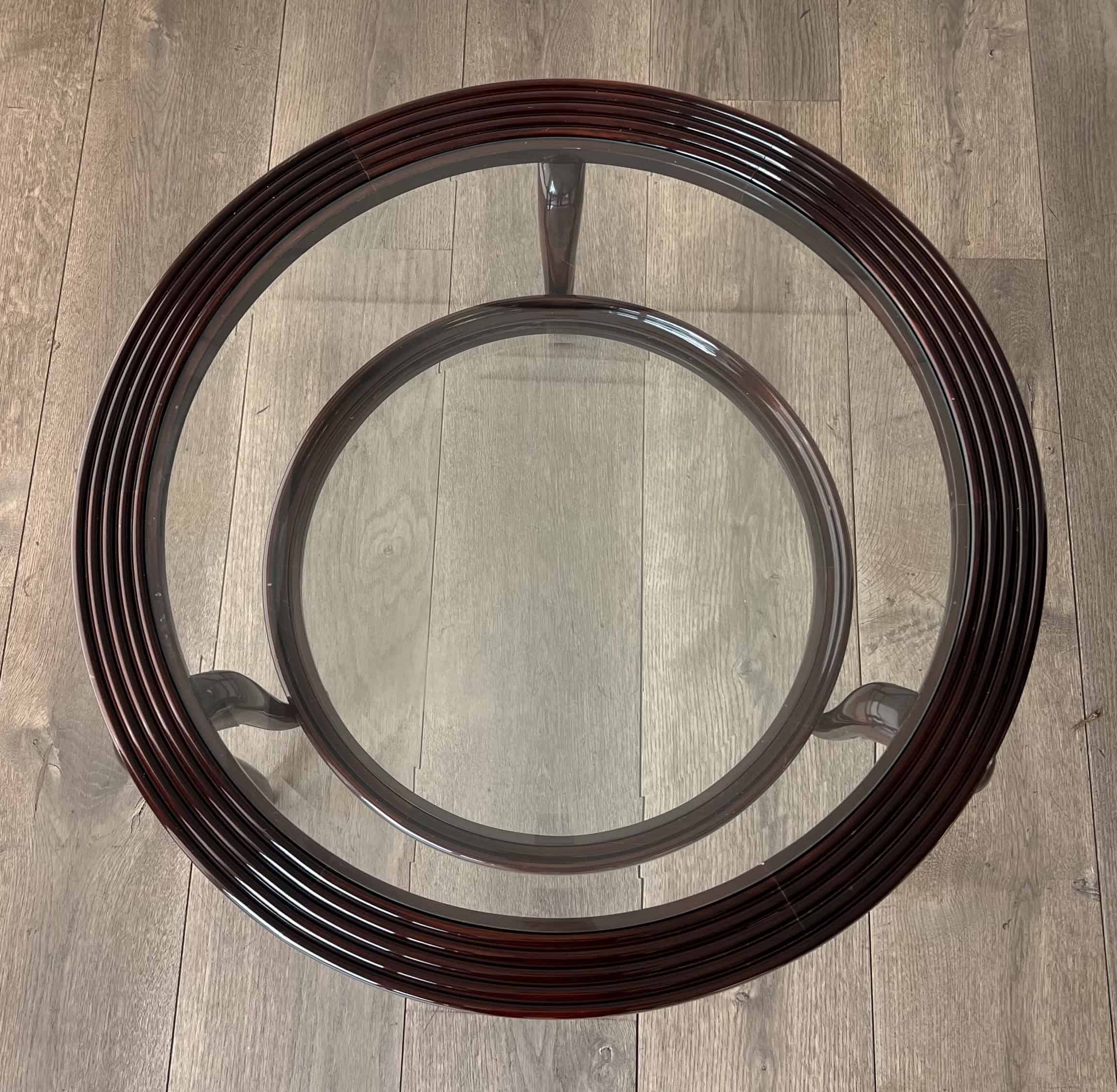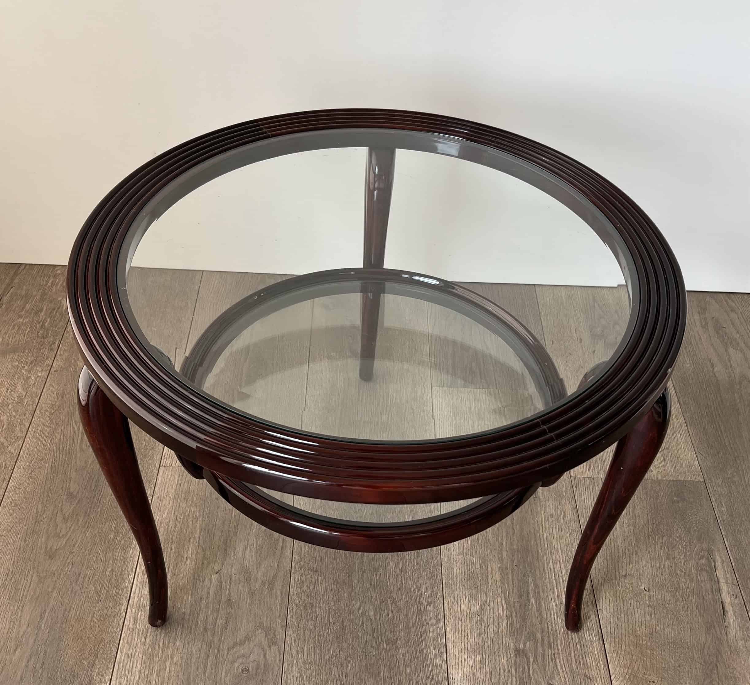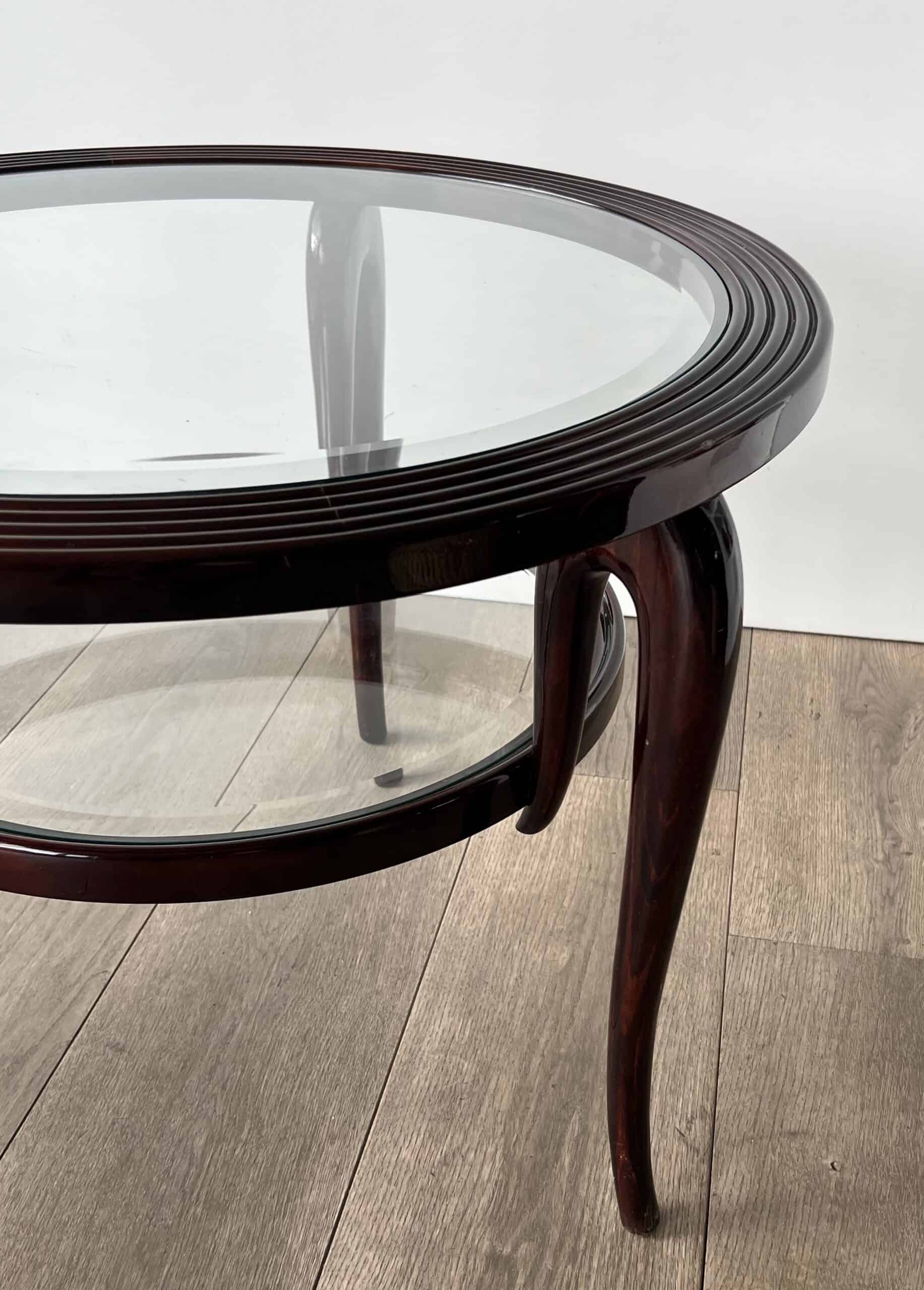 An elegant and architecturally refined round walnut coffee table by Paolo Buffa, crafted in Italy circa 1940. This exceptional example of Italian mid-century design features a sculptural solid walnut frame supporting two circular glass tiers, creating a light and harmonious silhouette.