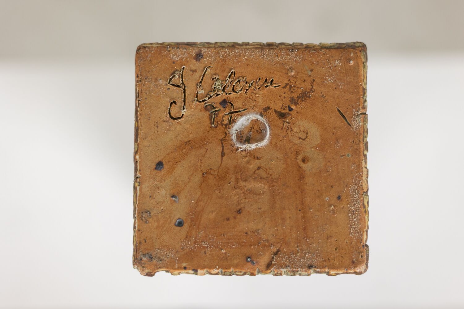 The artist scarified the stoneware surface to add depth and texture. A rich glaze enhances the carved plant decoration and highlights its organic rhythm. The design captures the expressive energy of 1970s studio ceramics.