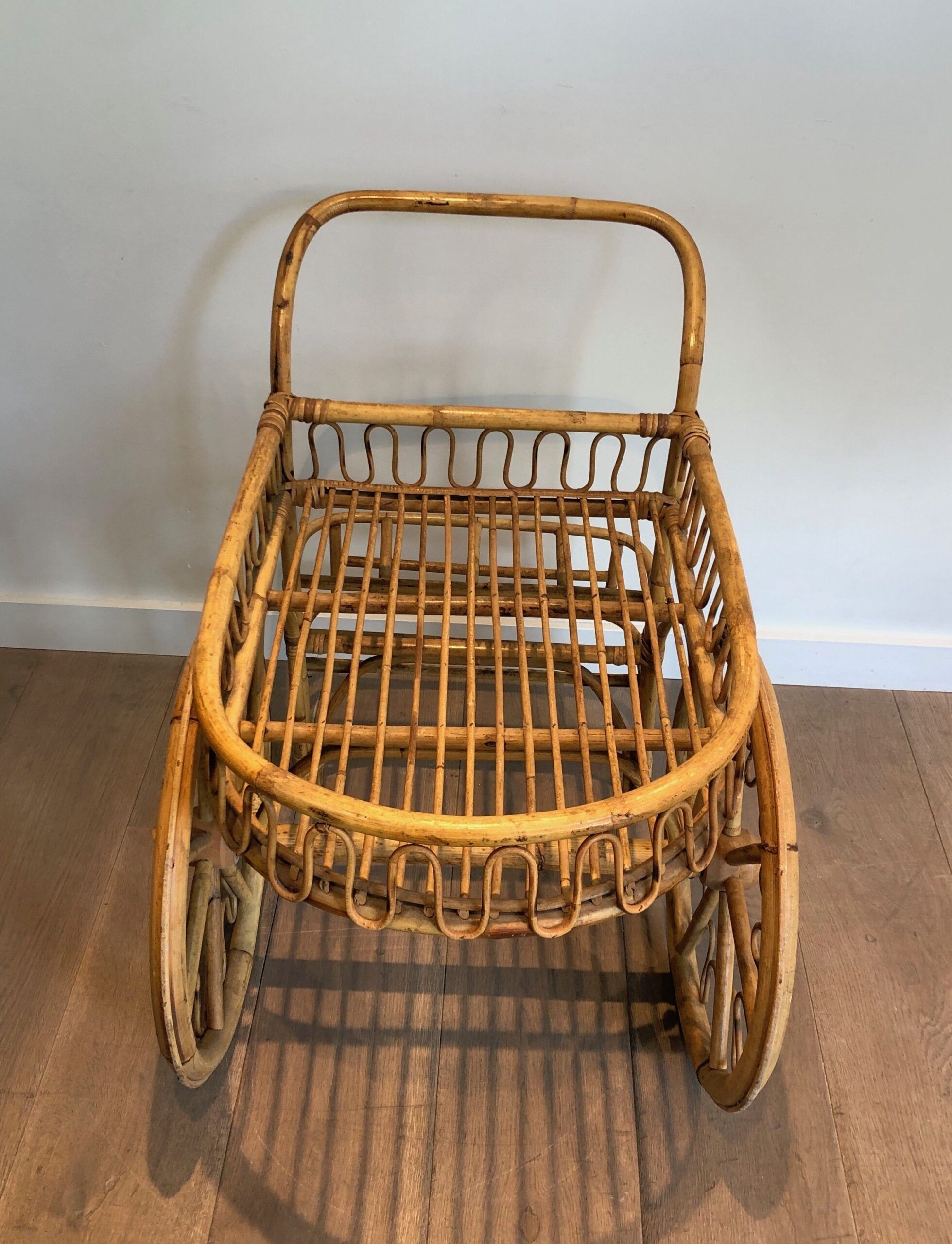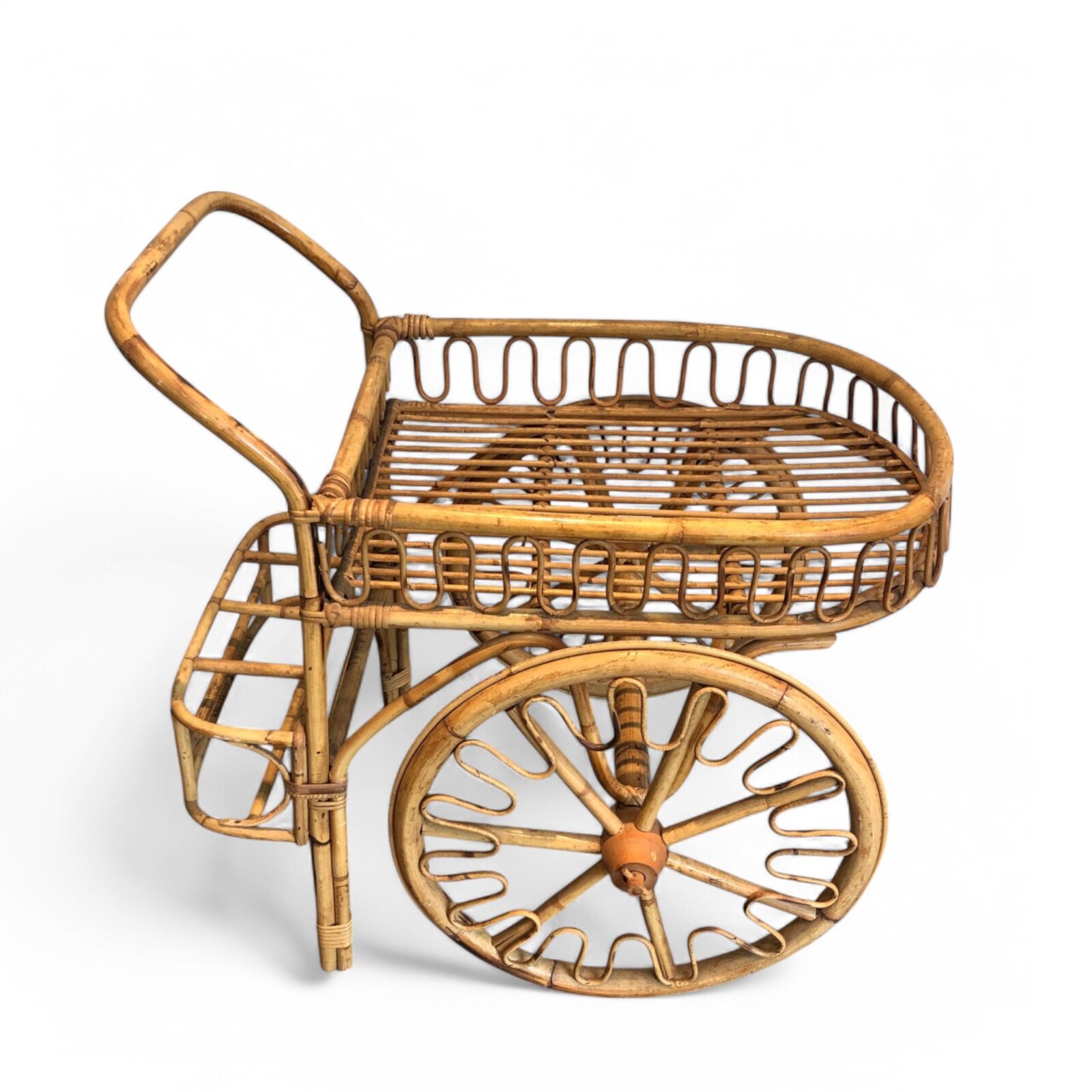 This charming rattan drinks trolley embodies the relaxed elegance of French design, attributed to Audoux Minet, circa 1970. Its organic texture and warm tones create a natural, inviting look. The two-tier structure offers ample space for serving or display, while the smoothly curved handle and sturdy wheels ensure effortless mobility. Designed with both beauty and function in mind, this vintage bar cart adds a touch of rustic sophistication to any interior, making it a stylish and practical piece for entertaining.