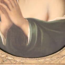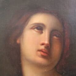 Discover this exquisite Religious Oil Painting from the 19th century. This oil on canvas artwork portrays Mary Magdalene in deep prayer. This painting draws inspiration from the work of Guido Reni. Many artists studied his compositions and created personal interpretations. This version reflects strong technique and individual style. Mary Magdalene appears with clasped hands and an upward gaze. Her expression conveys devotion, penitence, and hope for redemption. The partially bare shoulder enhances the emotional intensity.