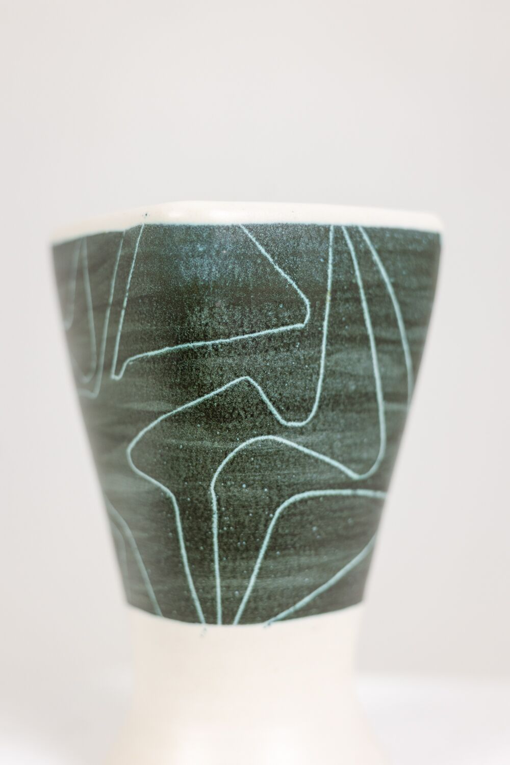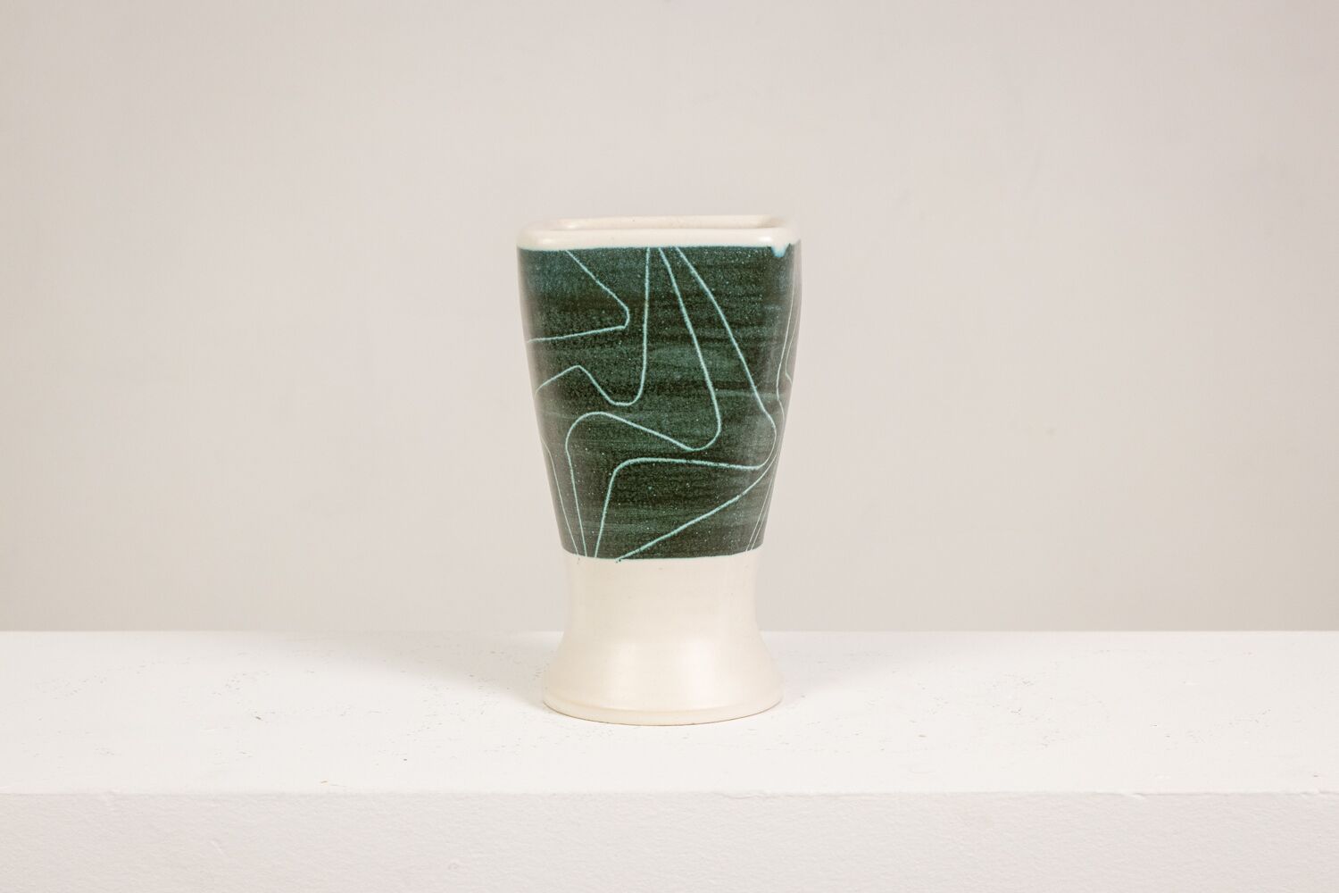 Discover this rare Robert Deblander Stoneware Vase, created in France during the 1950s. Robert Deblander shaped this piece with bold form and expressive detail. The vase features white and green glazed stoneware with an abstract design. The surface reveals subtle texture and rich tonal contrast. The compact form highlights balance and sculptural clarity.