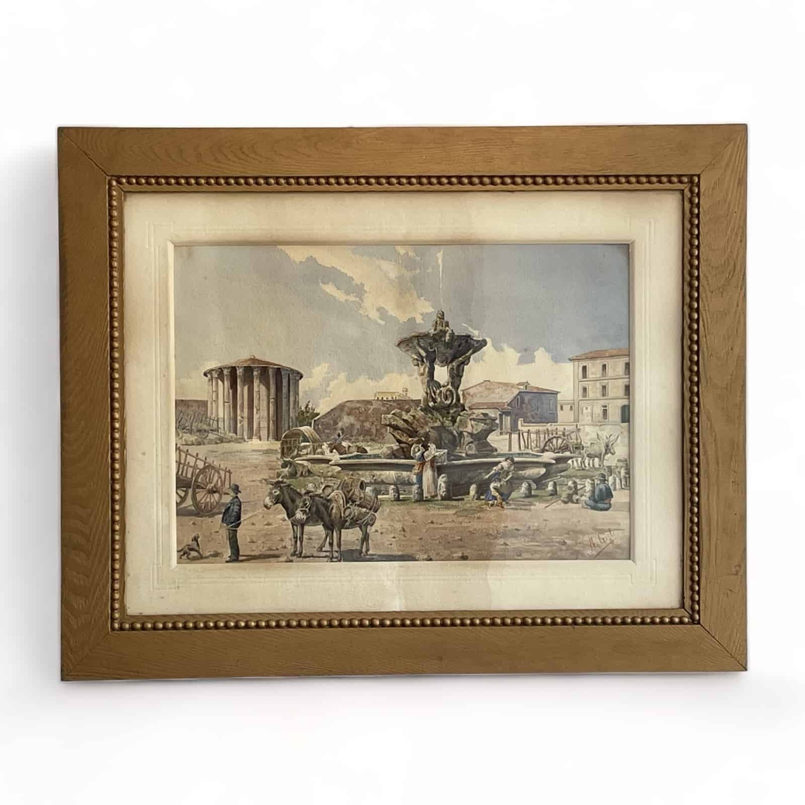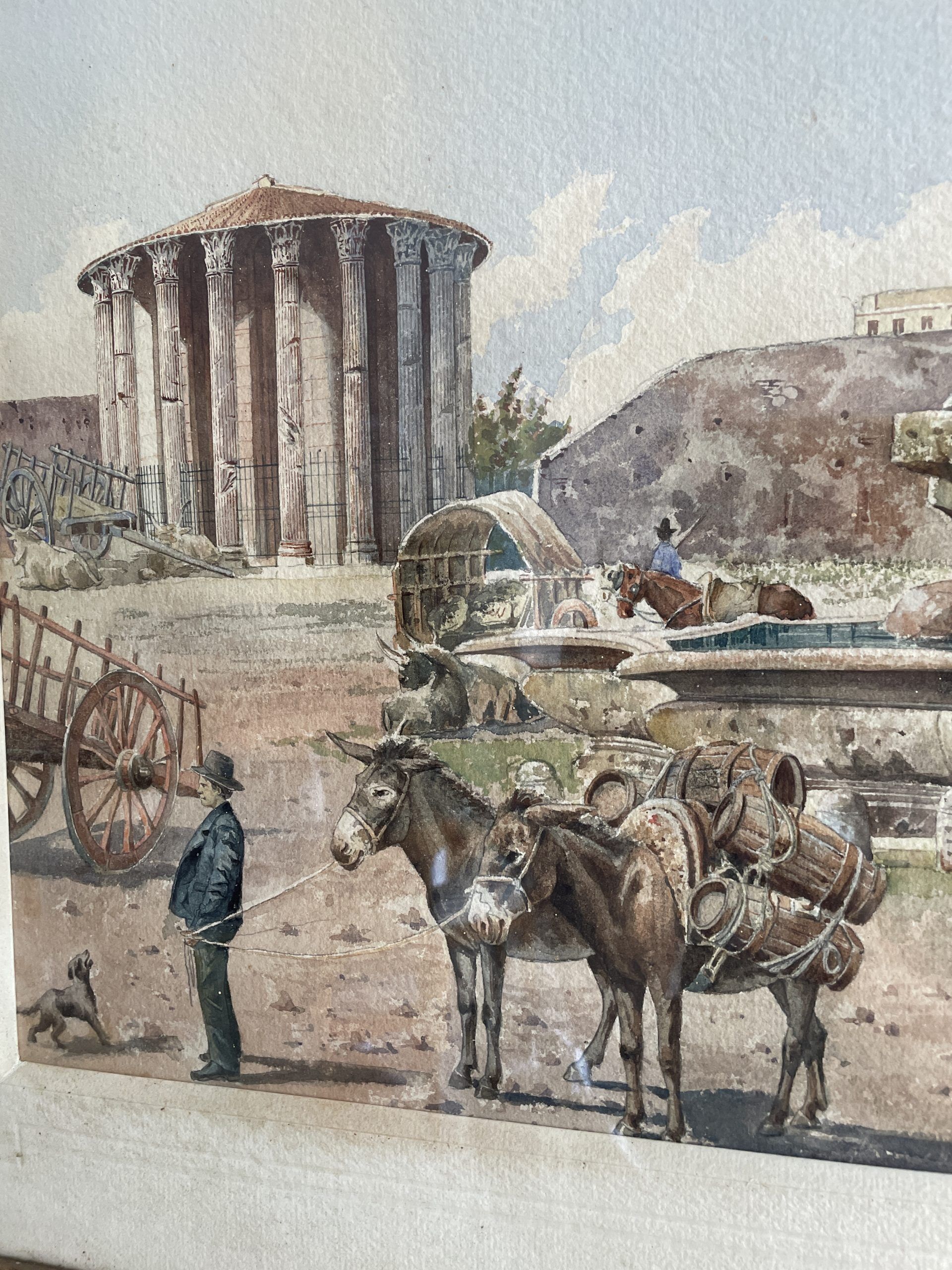 Roberto Gigli (Italian, 1846-1922), “View of the Hercules Victor Temple at the Forum Boarium”, watercolor, signed lower right. The Forum Boarium was the ancient cattle market of Rome. Framed behind glass.